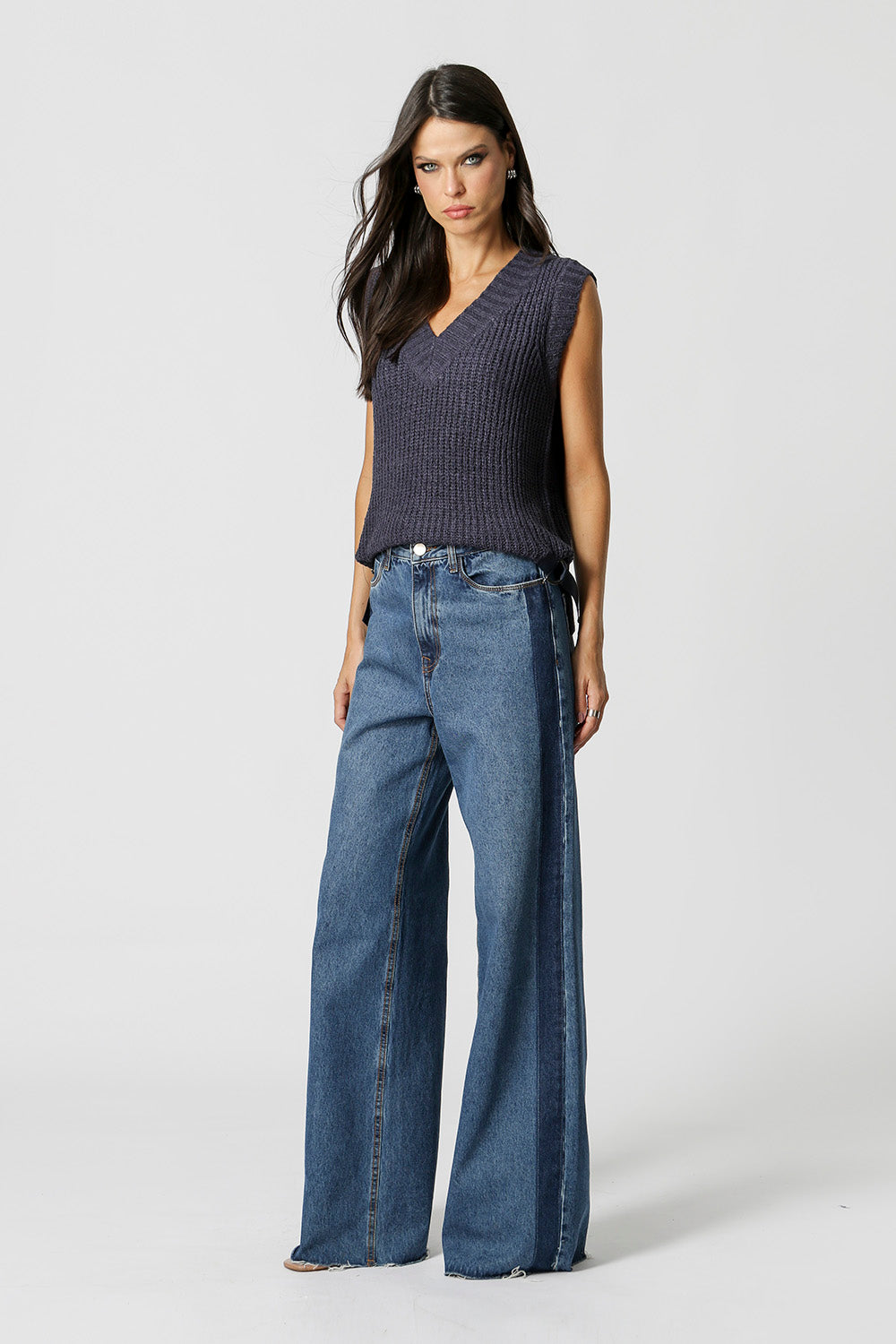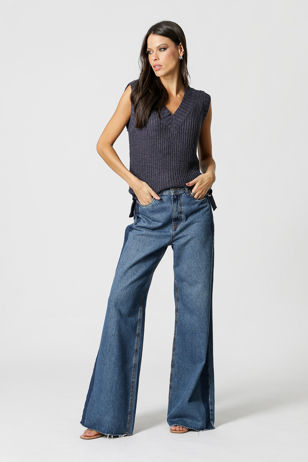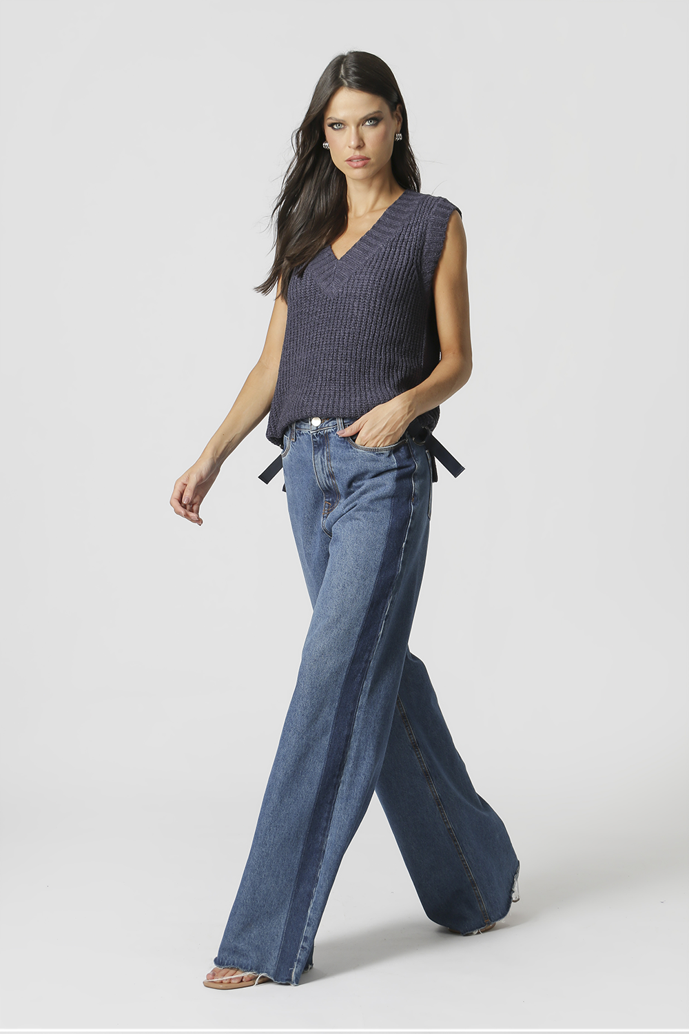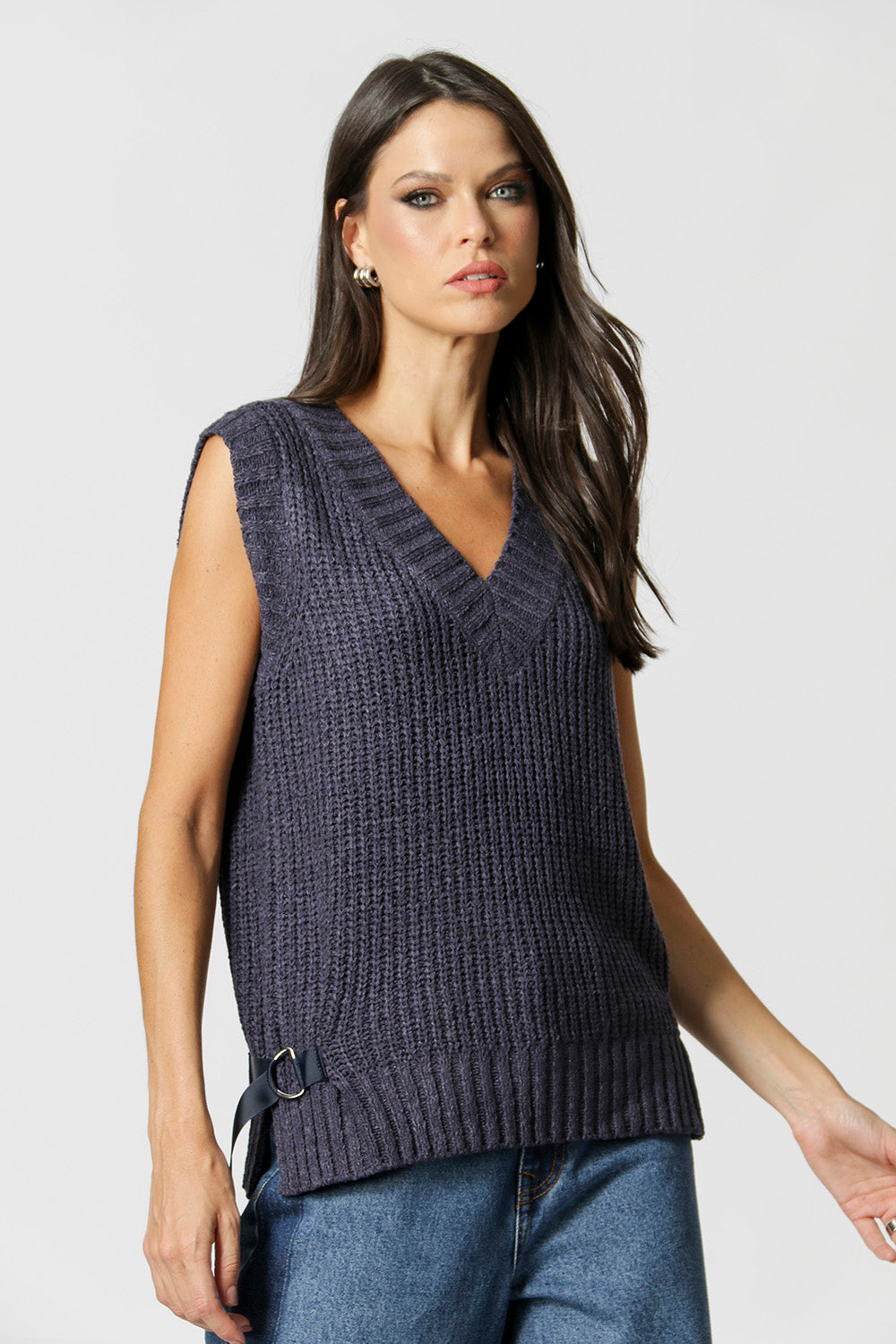 Chaleco de punto con detalle de hebillas en los laterales. Pieza en viscosa y poliamida. Un chaleco es una prenda que se puede usar encima de una camisa o como blusa.
