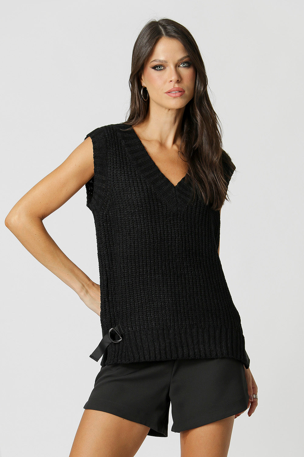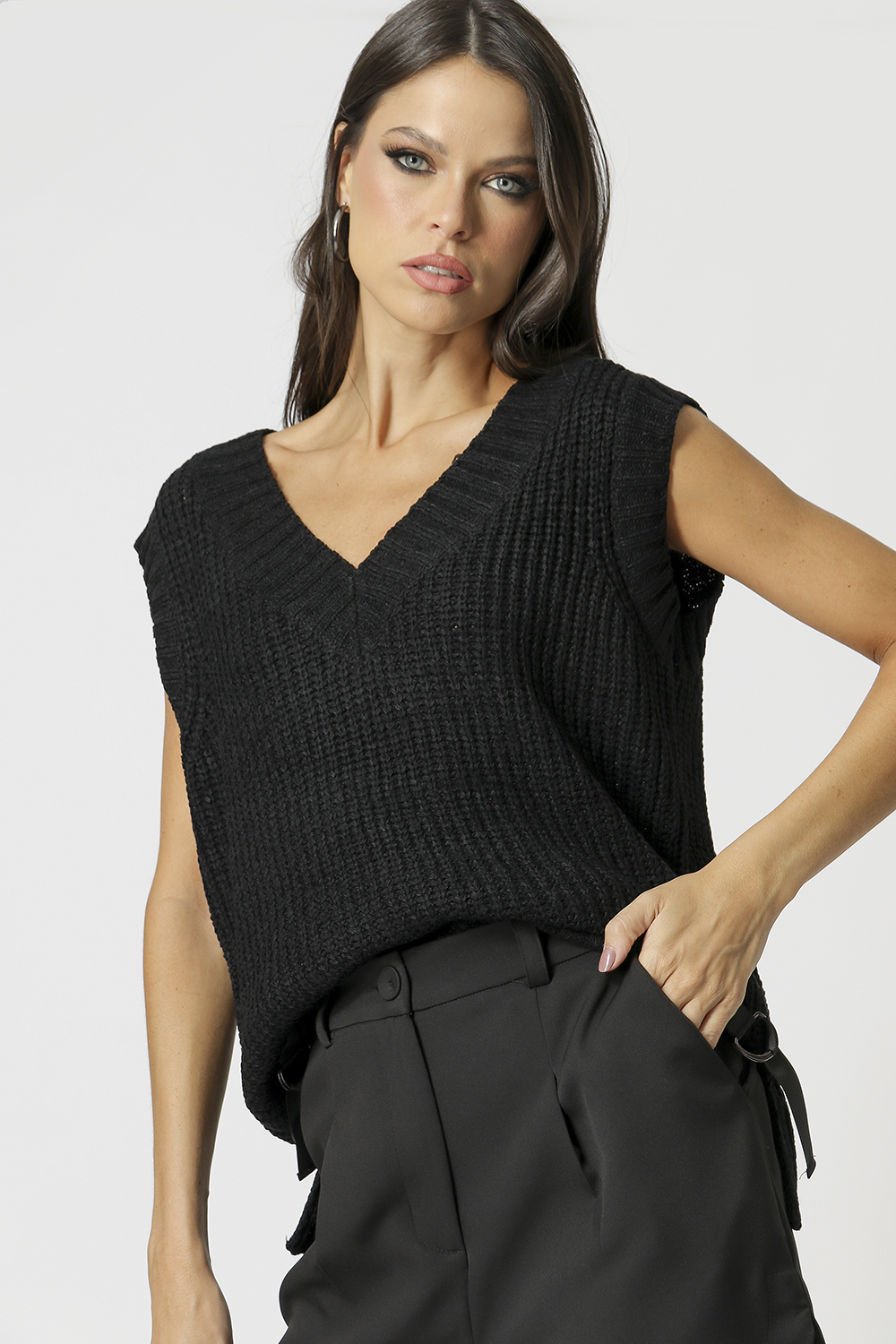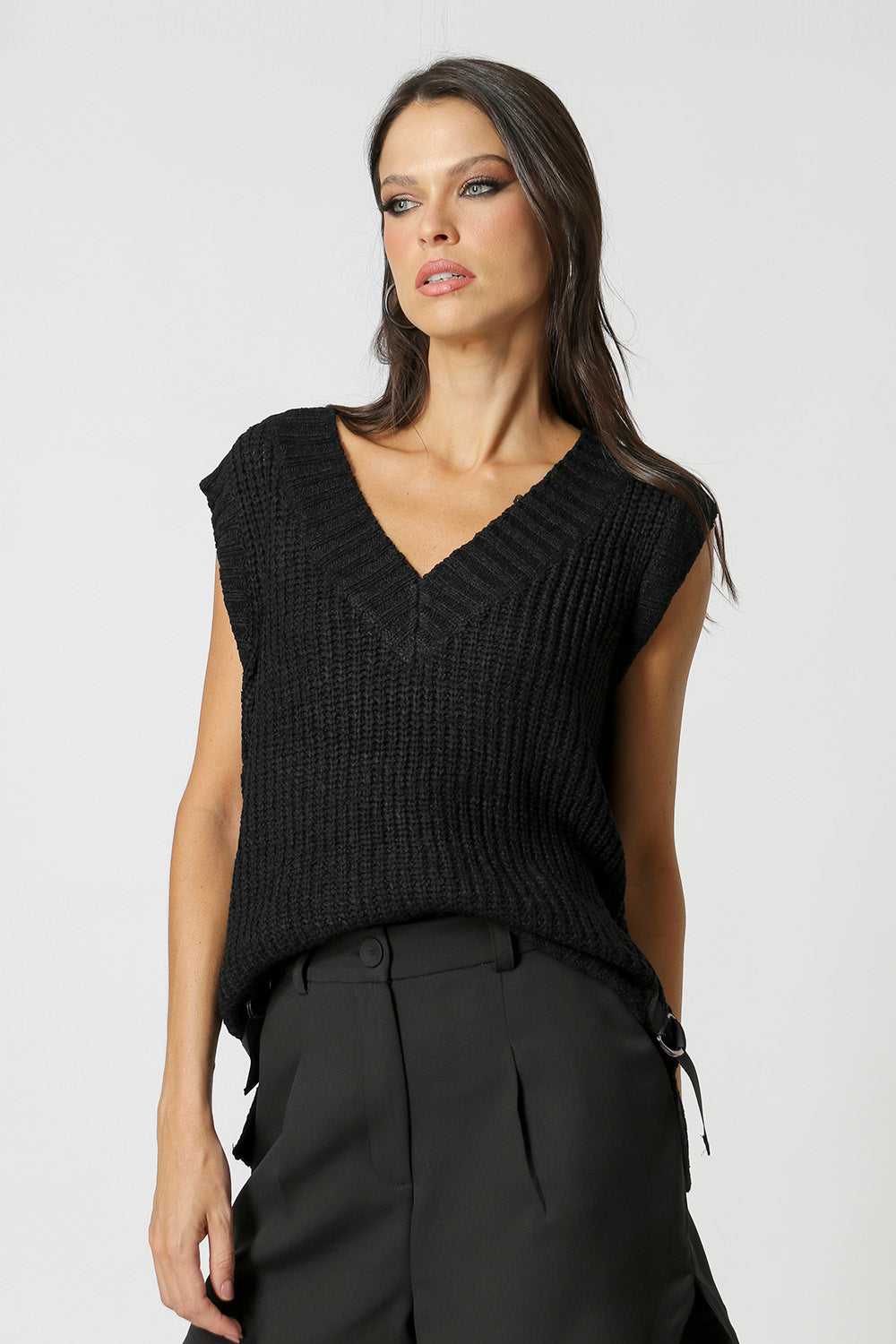 Chaleco de punto con detalle de hebillas en los laterales. Pieza en viscosa y poliamida. Un chaleco es una prenda que se puede usar encima de una camisa o como blusa.