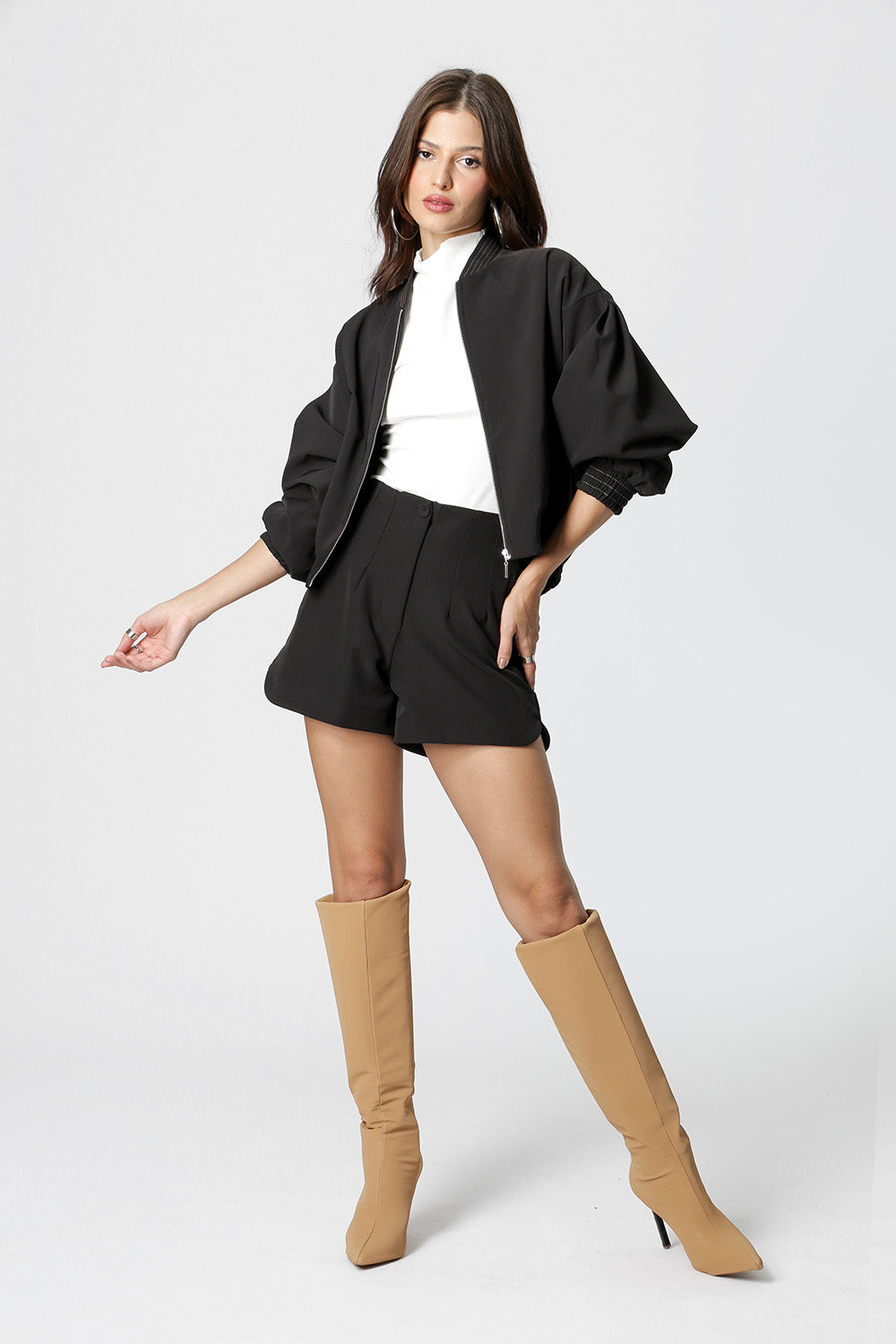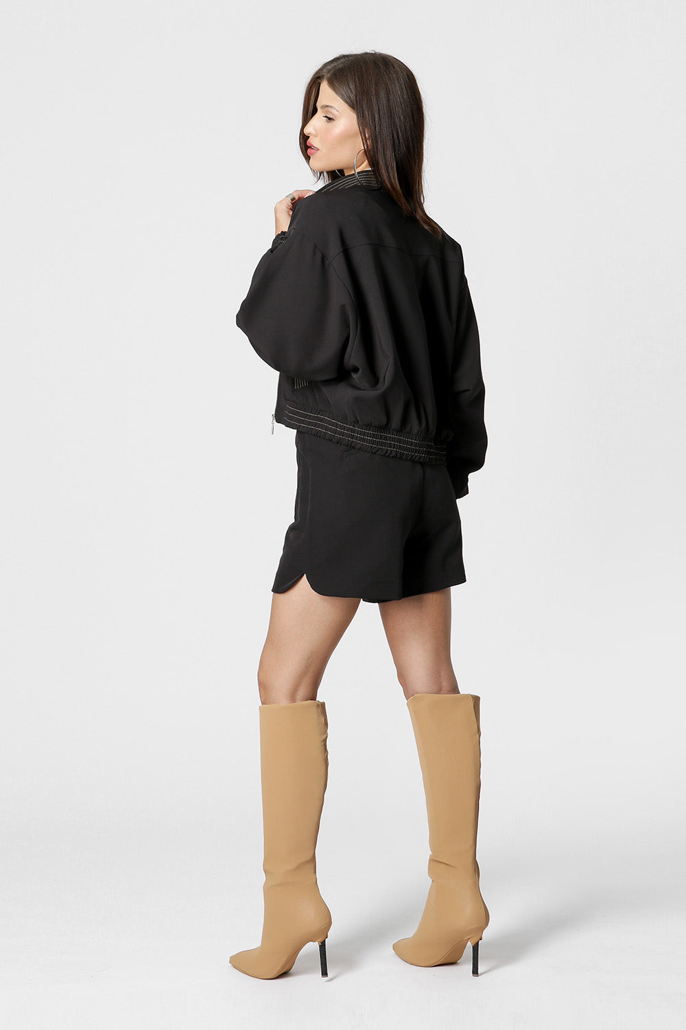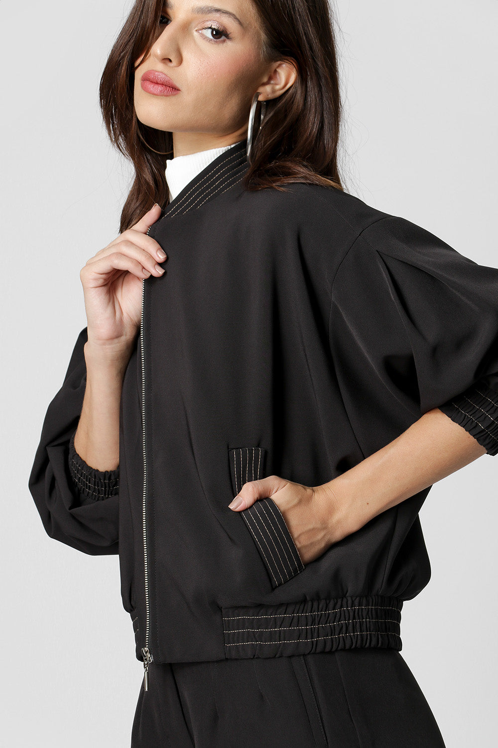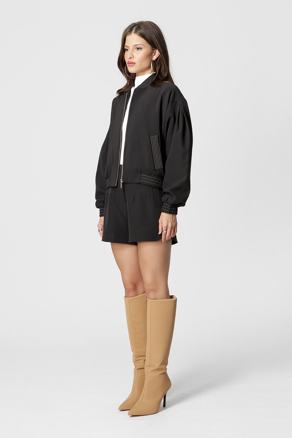 Chaqueta bomber de corte oversize, mangas anchas, bolsillos delanteros y detalle pespunteado en bajo, cuello y puños. Pieza fashionista, para que luzcas tus looks.