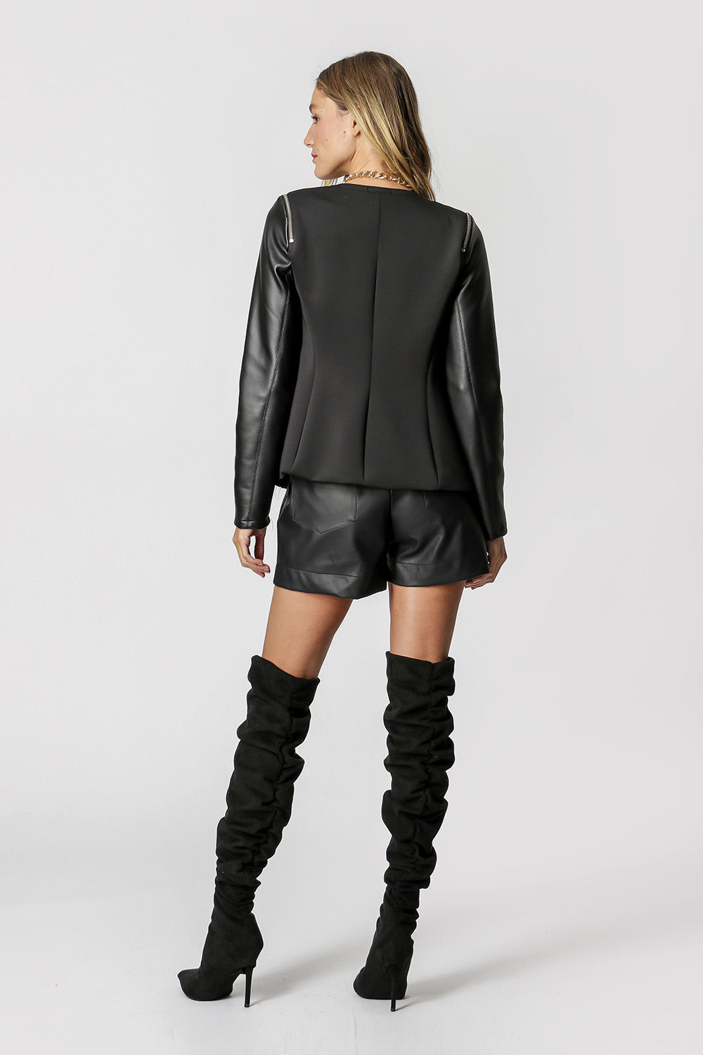 Chaqueta con tejido mixto, tiene detalle de cremallera en los hombros y botonadura delantera. Pieza forrada. ¡Un clásico atemporal que debes tener!