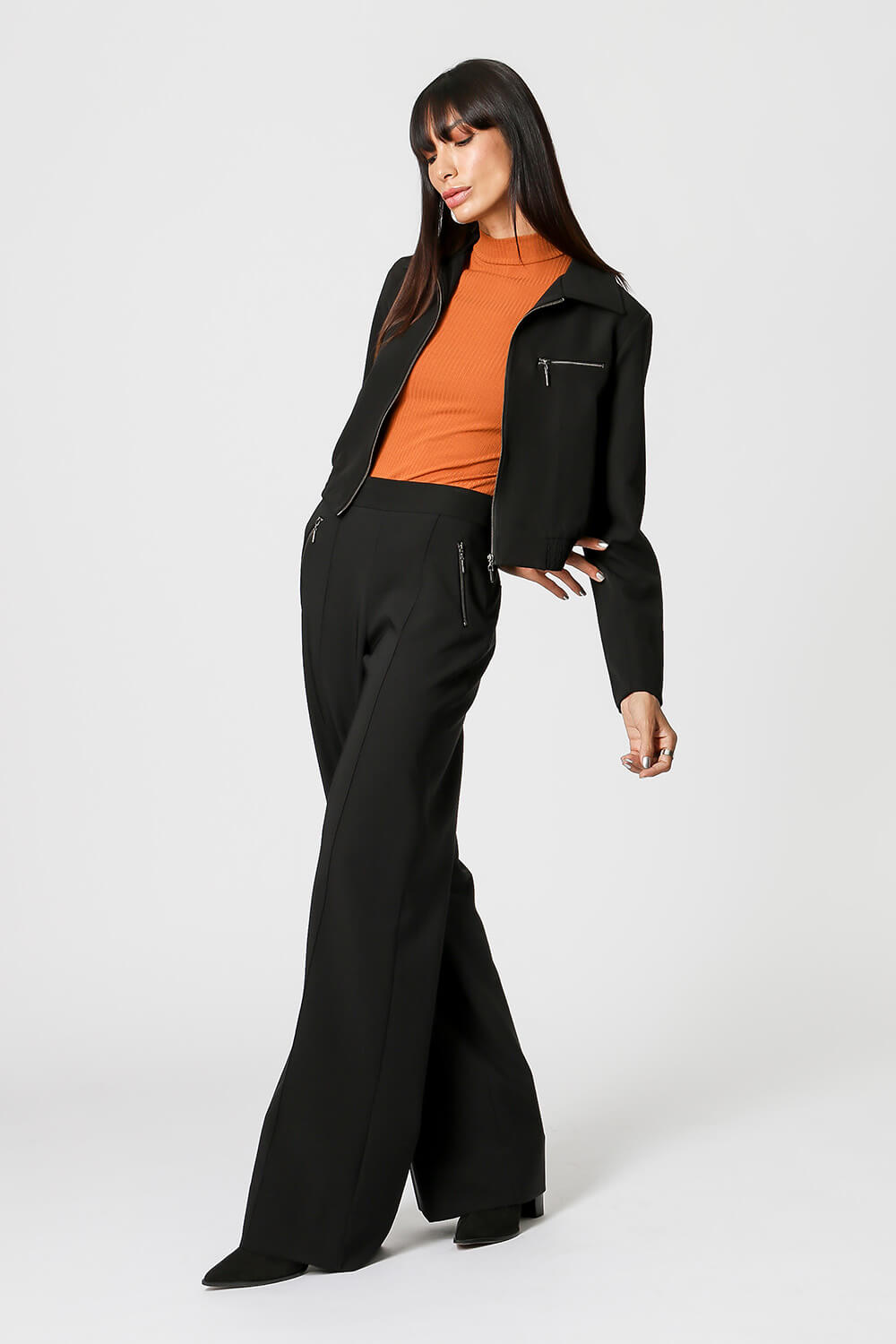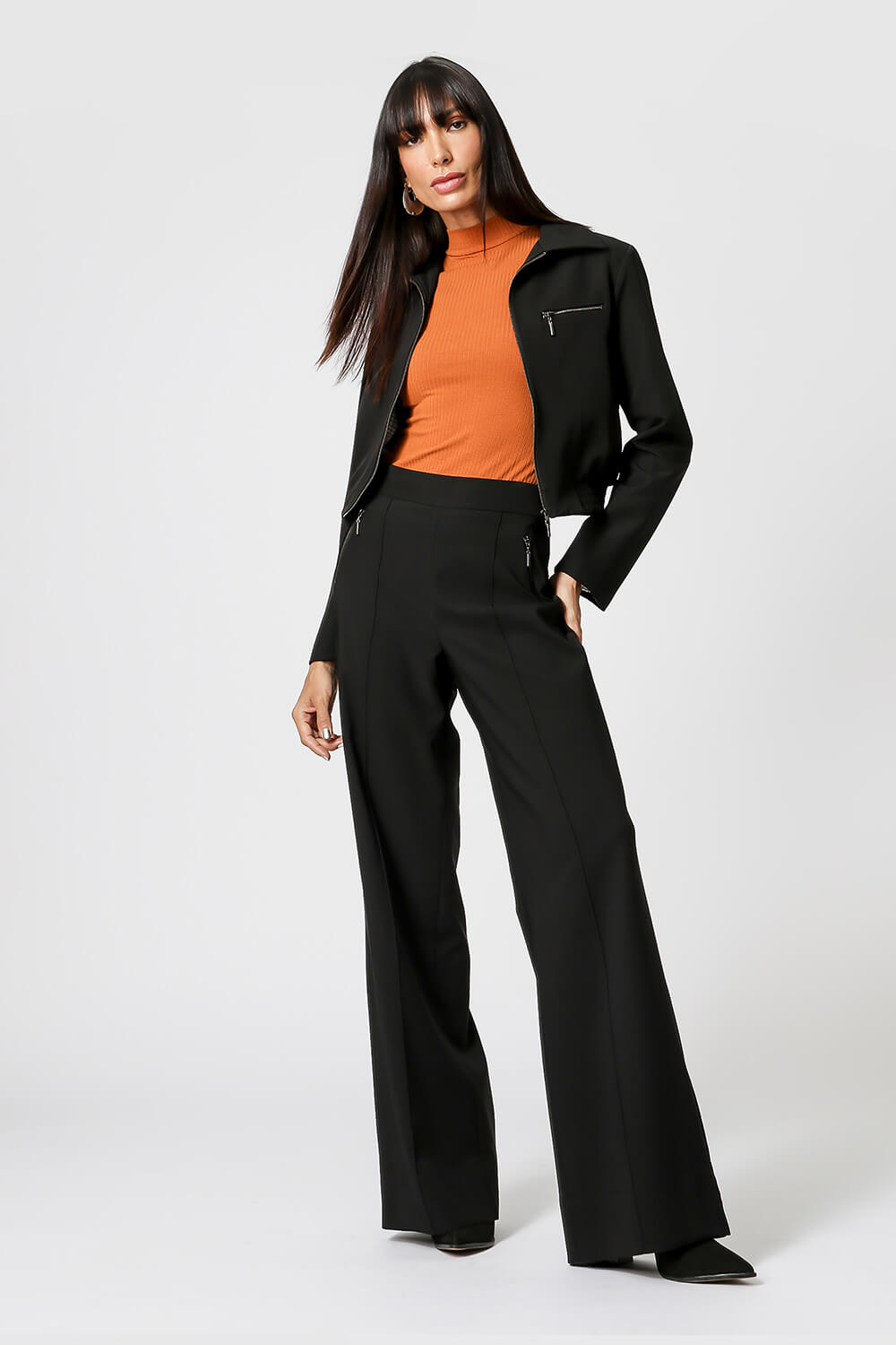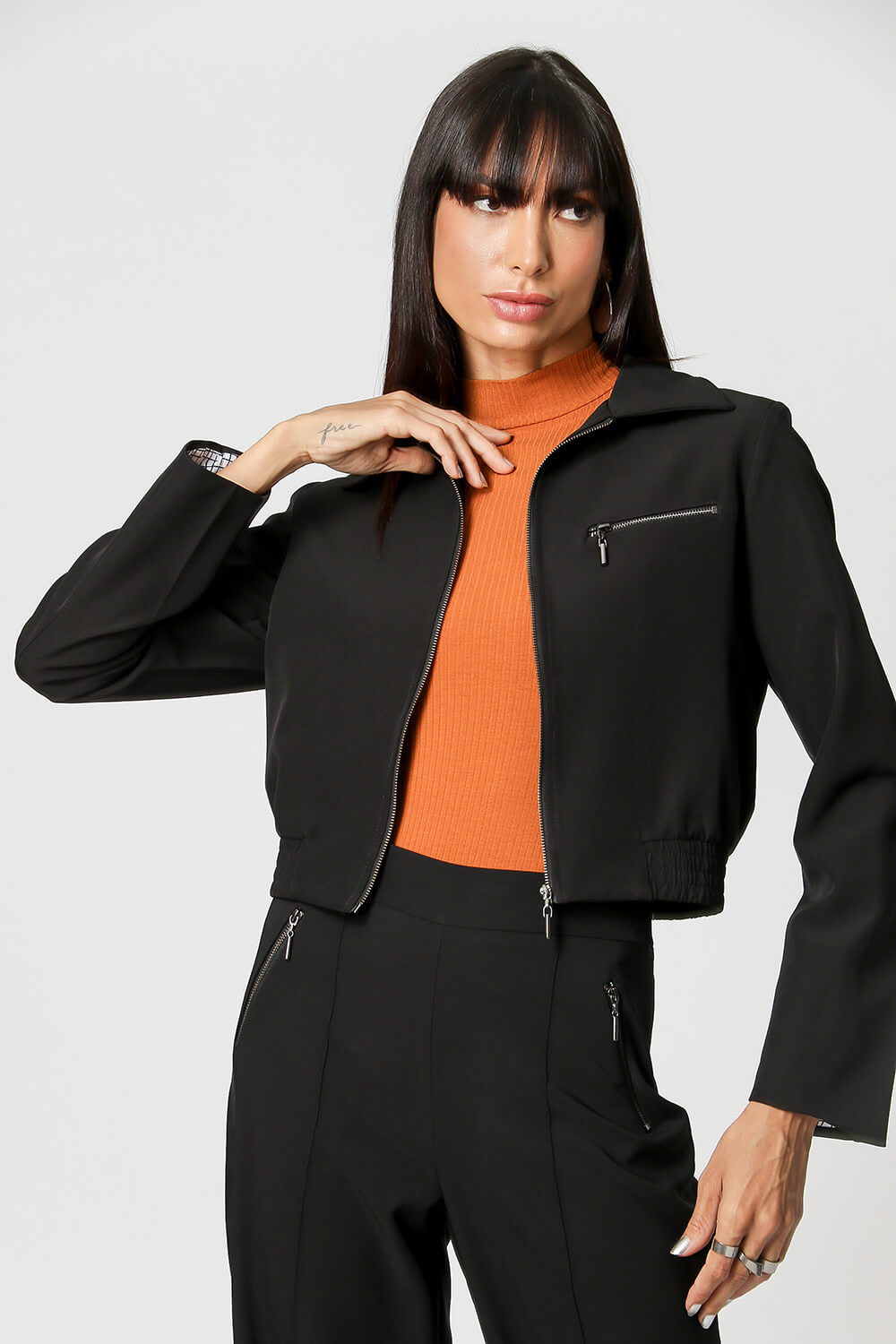 Chaqueta corta con detalle de cremallera. Pieza confeccionada en tejido sastre, un modelo cómodo y versátil que no puede faltar en tu armario.