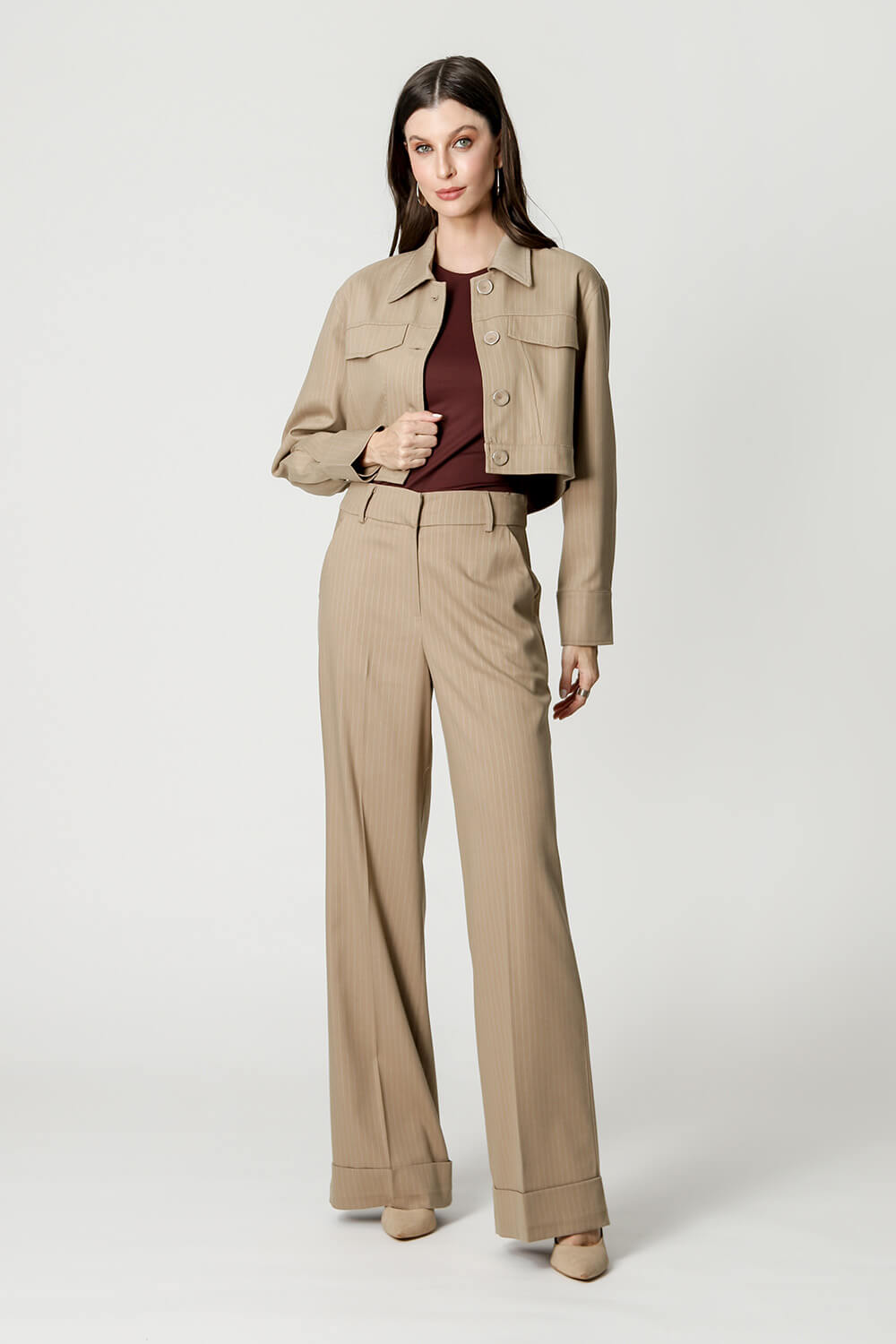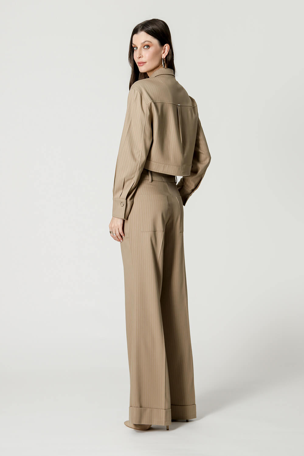 Chaqueta corta con detalle de solapa, botones forrados en el mismo tejido con anillas metálicas. Un modelo realizado en tejido Risca Tailoring. Una pieza clásica y cómoda para ocasiones casuales.