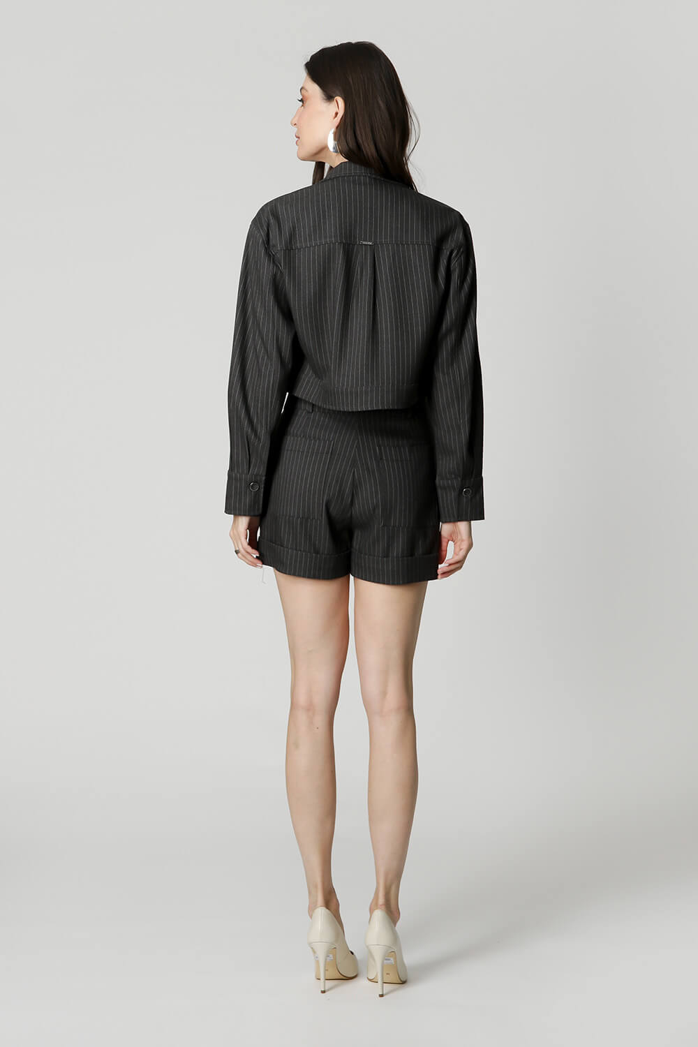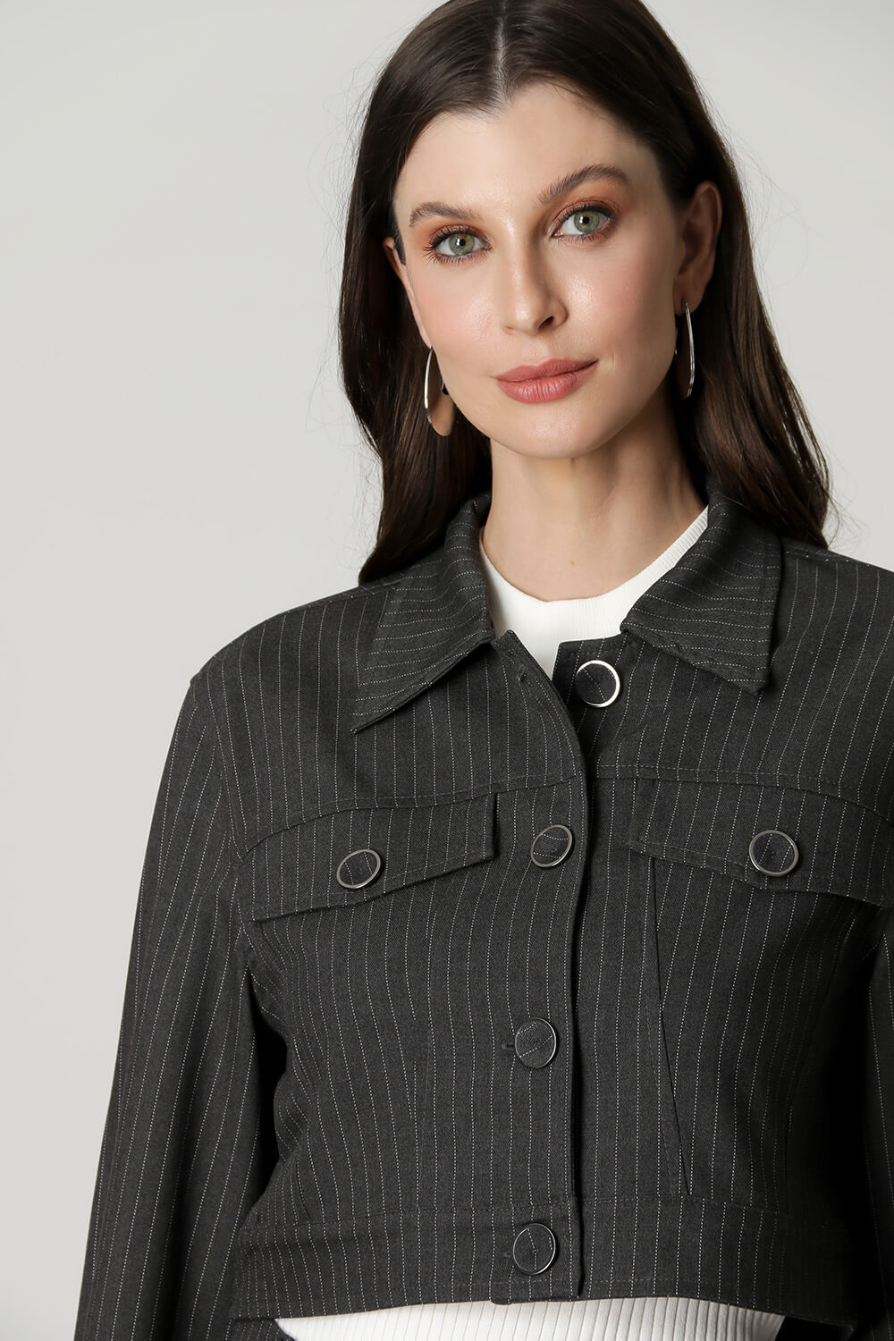 Chaqueta corta con detalle de solapa, botones forrados en el mismo tejido con anillas metálicas. Un modelo realizado en tejido Risca Tailoring. Una pieza clásica y cómoda para ocasiones casuales.