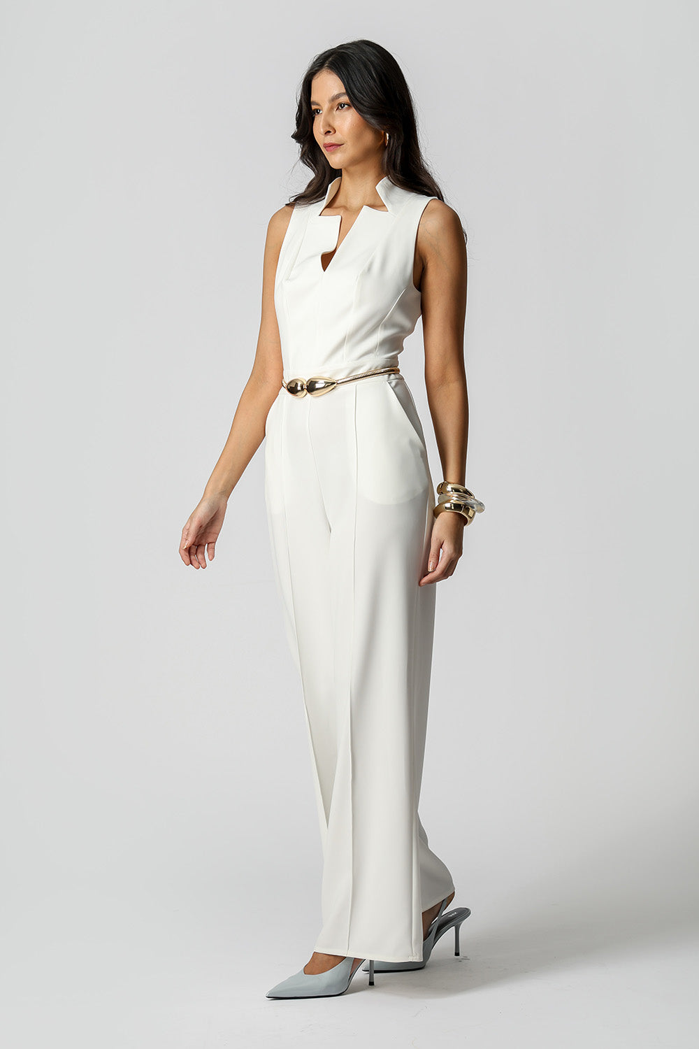 Macacão em tecido de alfaiataria fluid, com blusa de recortes modernos e calça de caimento leve. Possui bolsos frontais funcionais e bolsos traseiros decorativos. Elegante, versátil e perfeito para diversas ocasiões.