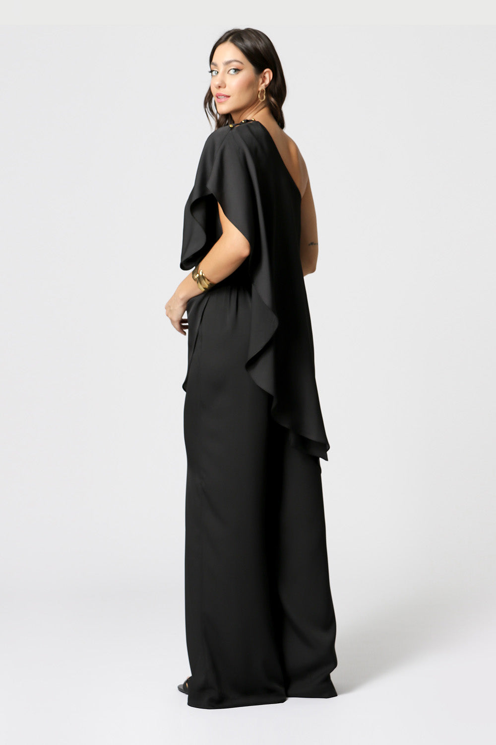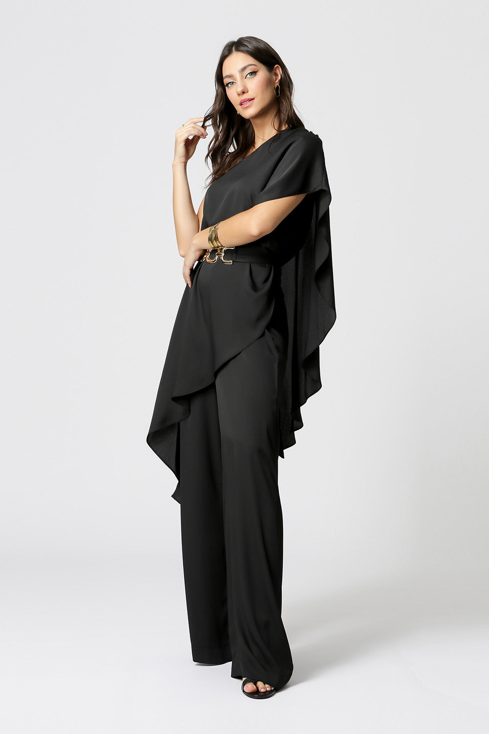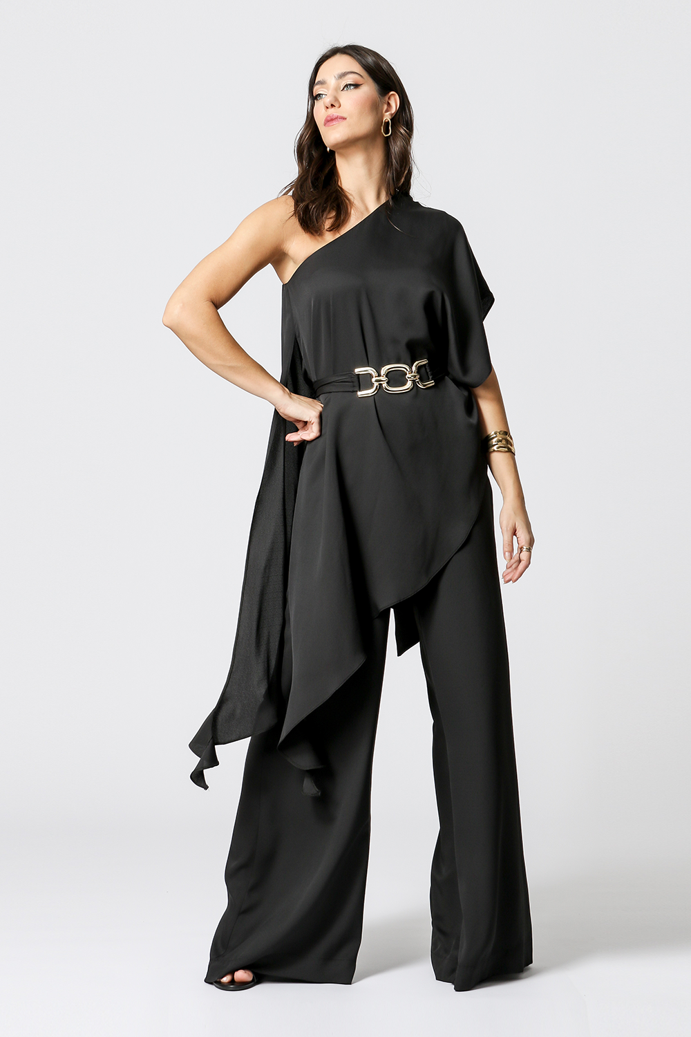 Mono asimétrico con cinturón del mismo tejido y botones en el hombro. Pieza confeccionada en tejido crepe de textura ligera. Modelo súper elegante, chic y diferente ya que se puede utilizar de diferentes maneras, una gran opción para ocasiones especiales.