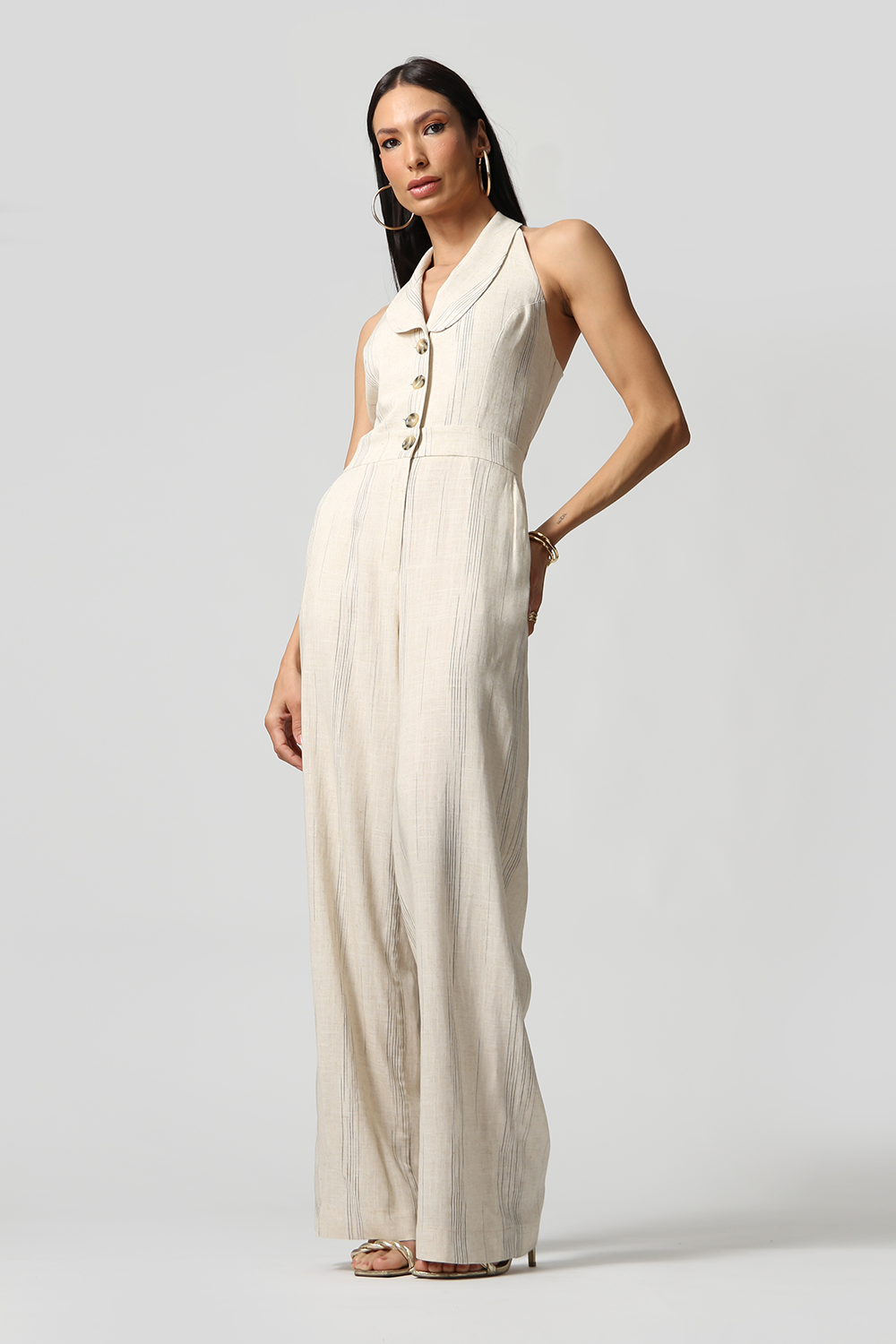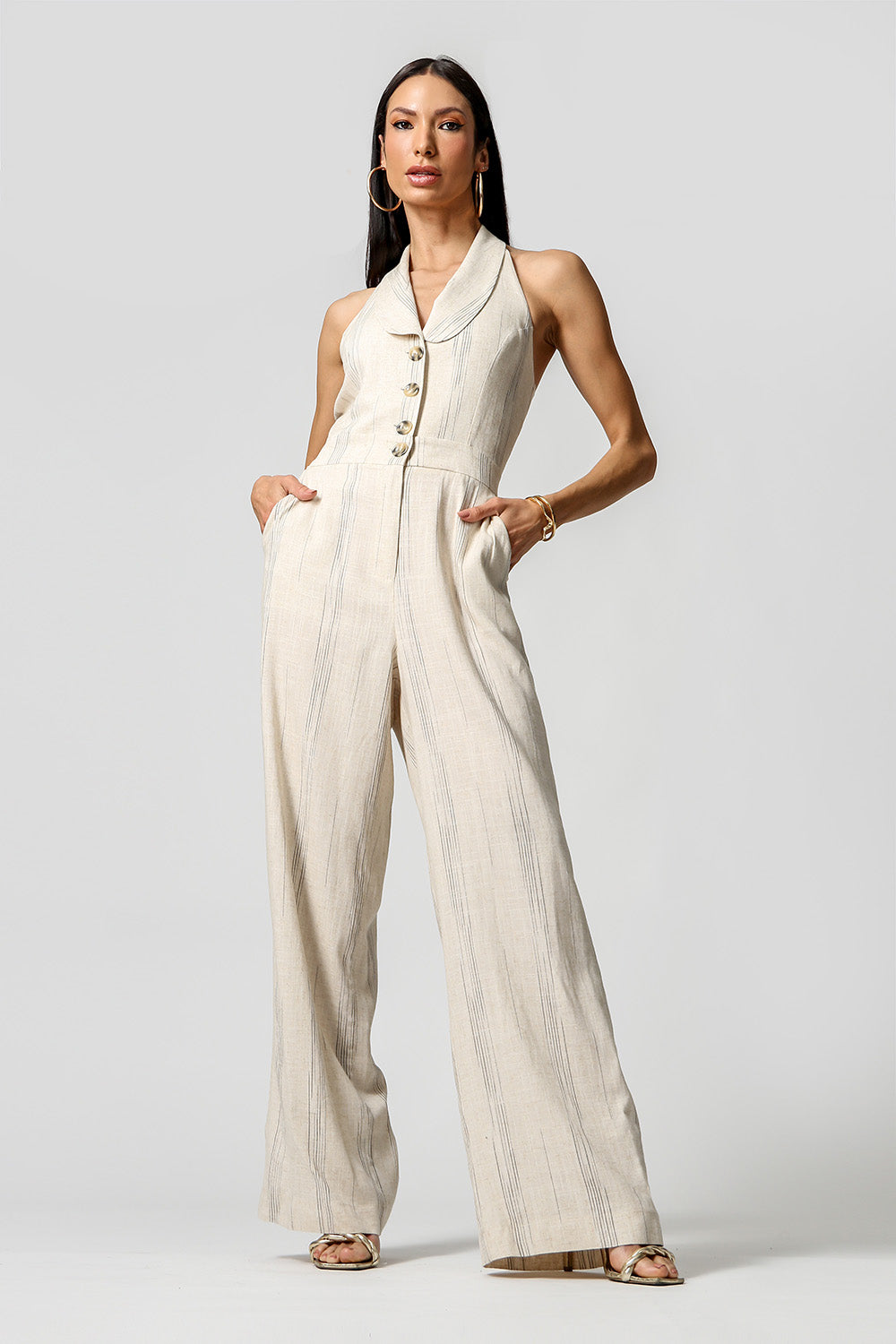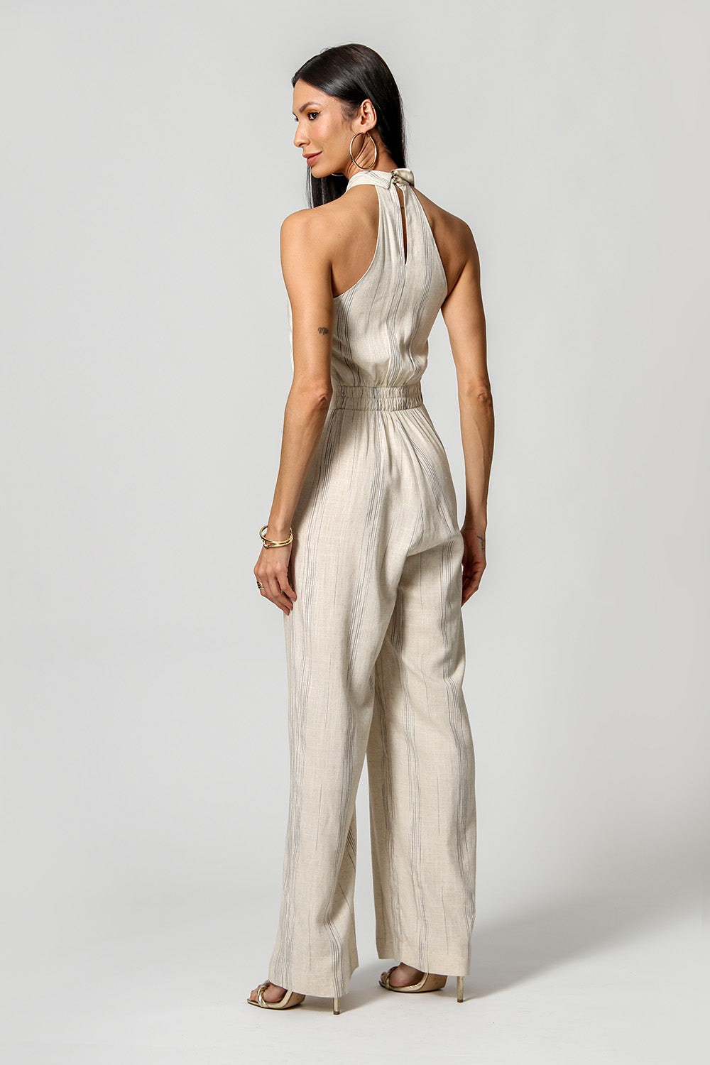 Mono de lino con cuello halter. Modelo ideal para ocasiones casuales, aportando elegancia y comodidad a tu look.