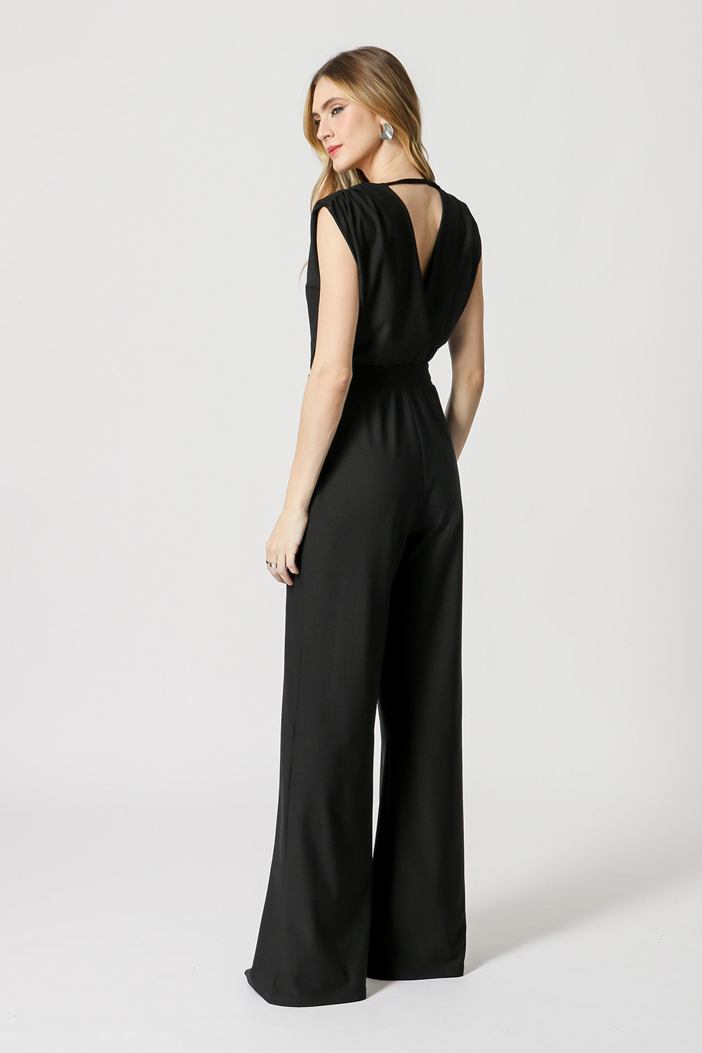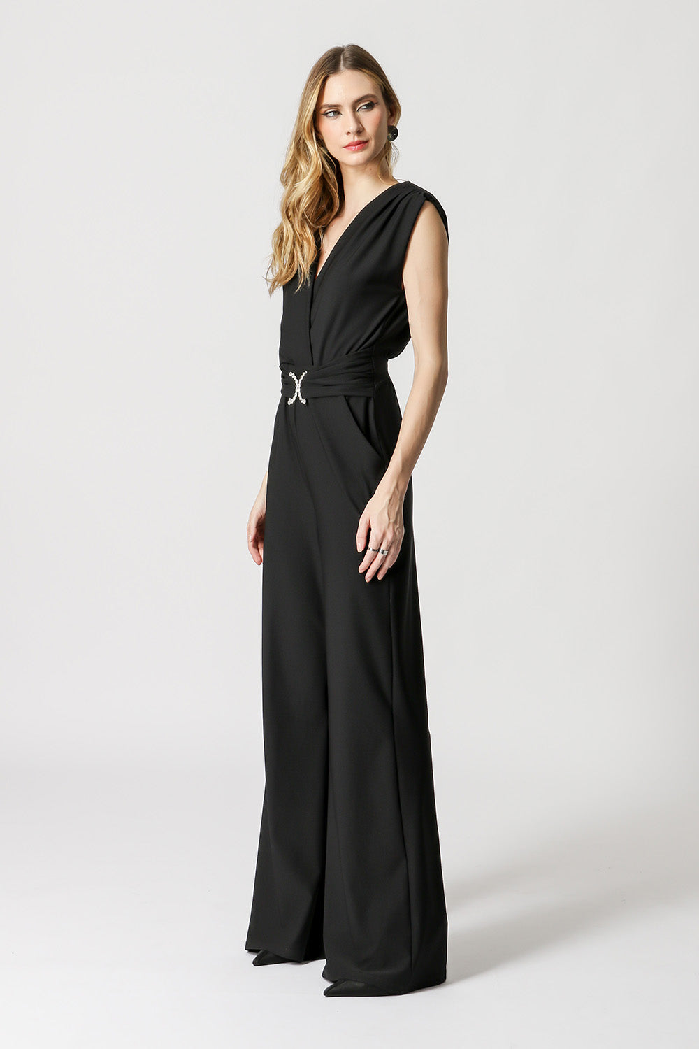 Mono largo con escote cruzado y detalle de cinturón en cintura con hebilla metálica con pedrería. Modelo realizado en tejido de punto crepe. Una pieza súper elegante y una gran opción para ocasiones casuales.