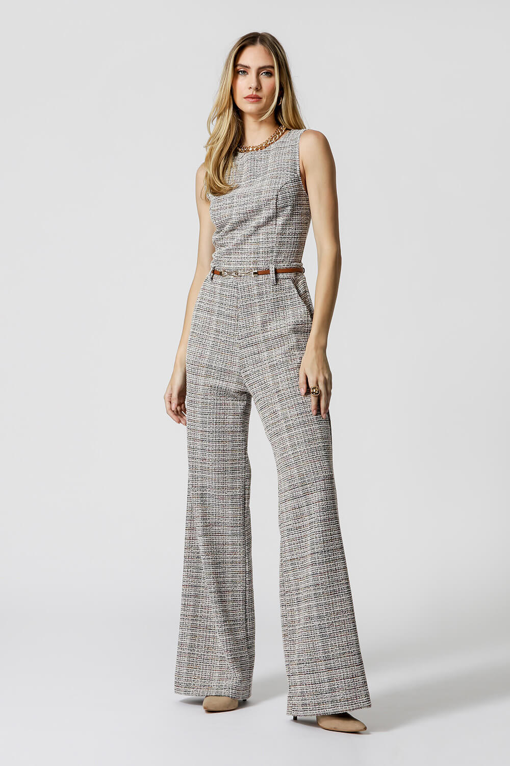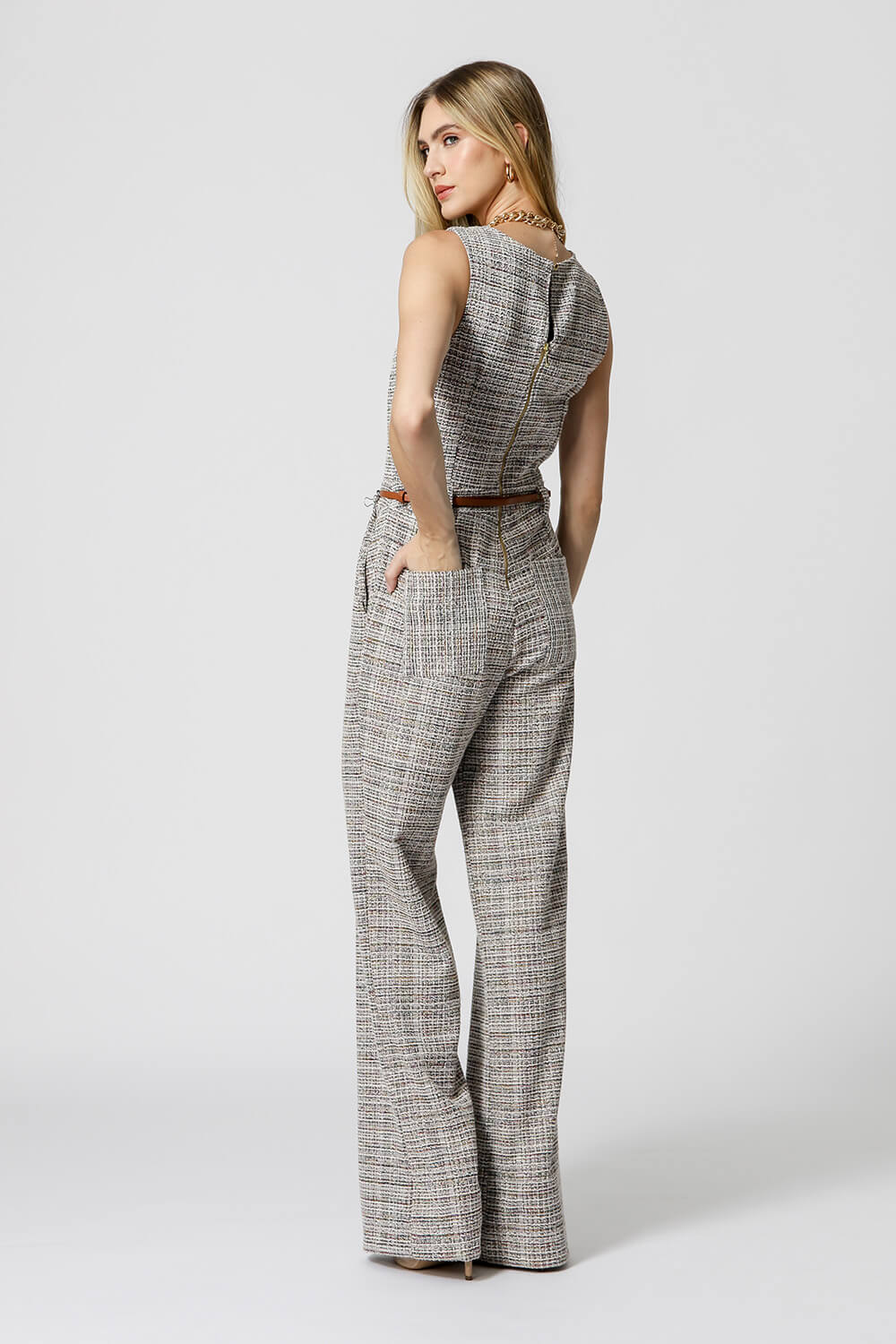 Mono largo con bolsillo, cremallera trasera y botón. Pieza confeccionada en tejido Color Tweed. Un modelo cómodo y elegante, perfecto para un ambiente casual.