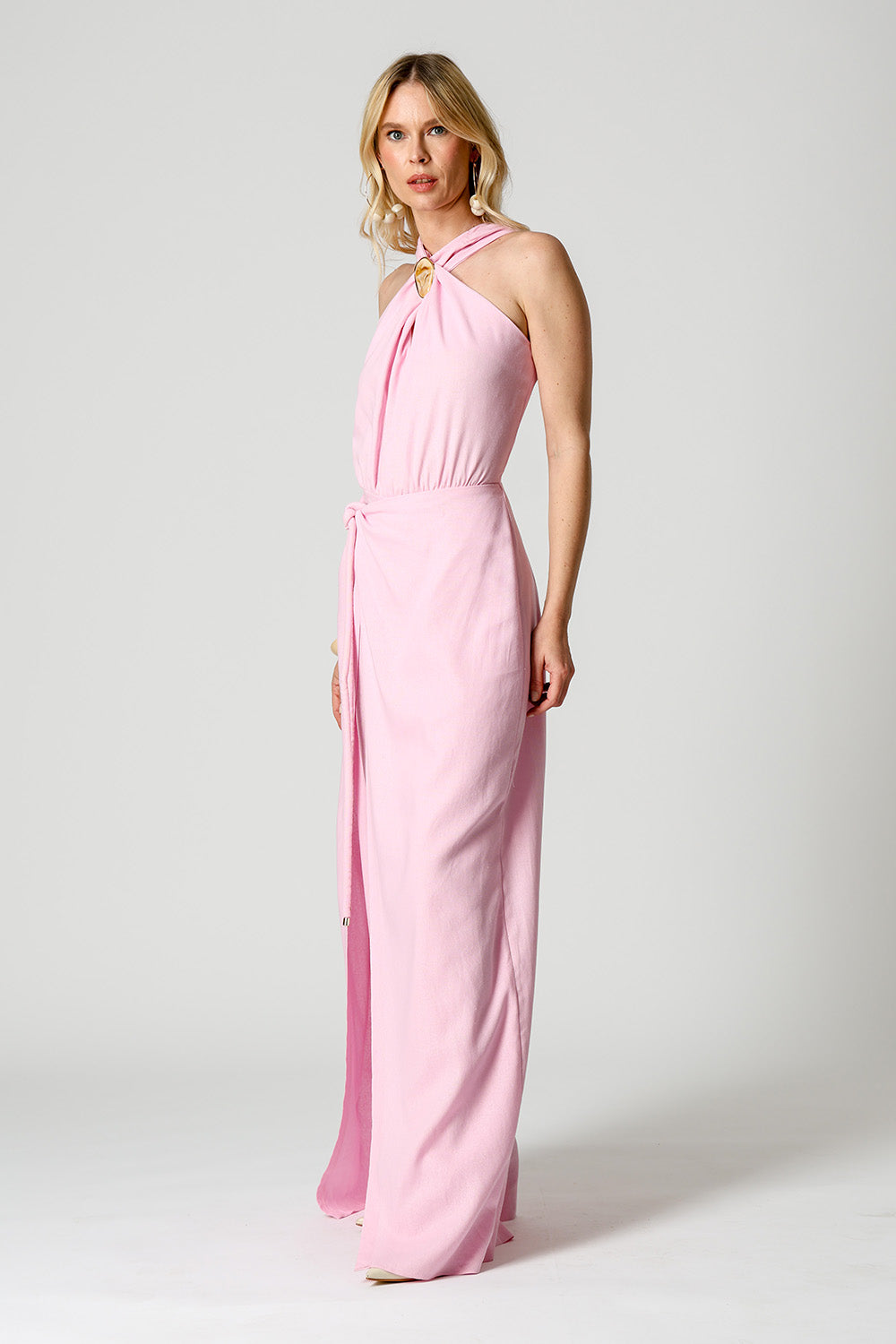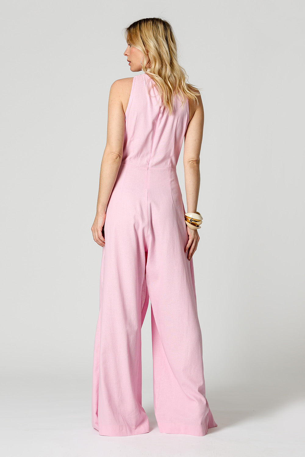 Macacão pantalona em linho viscose com transpasse frontal e amarração com ponteiras. Possui decote cruzado adornado com aviamento marmorizado e detalhe dourado, garantindo um visual moderno e elegante. Caimento leve e sofisticado.