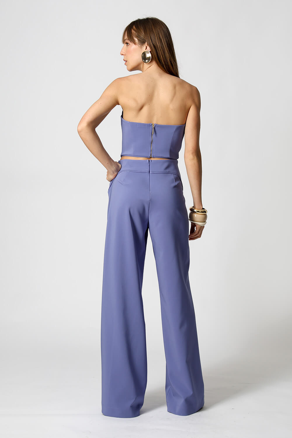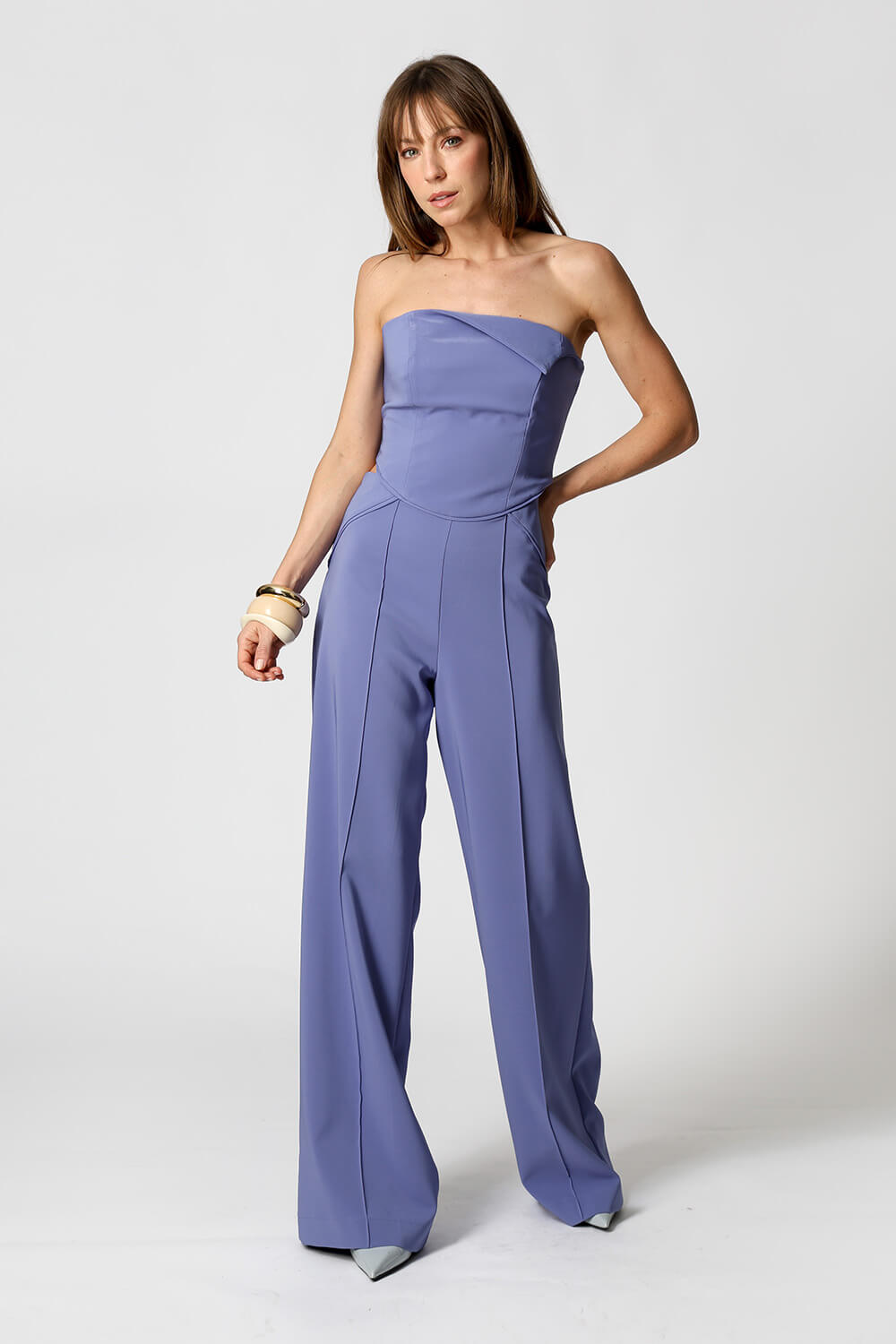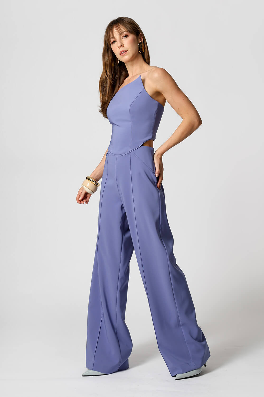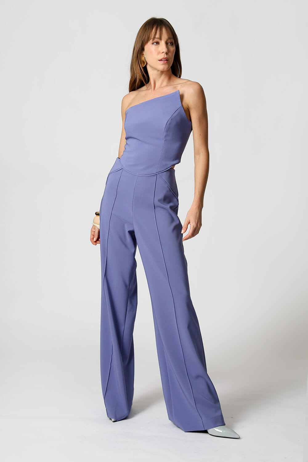 Macacão em alfaiataria com top assimétrico sem alça e abertura nas costas. Recortes vivos na cintura, no mesmo tom do tecido, valorizam a silhueta com elegância e design contemporâneo.