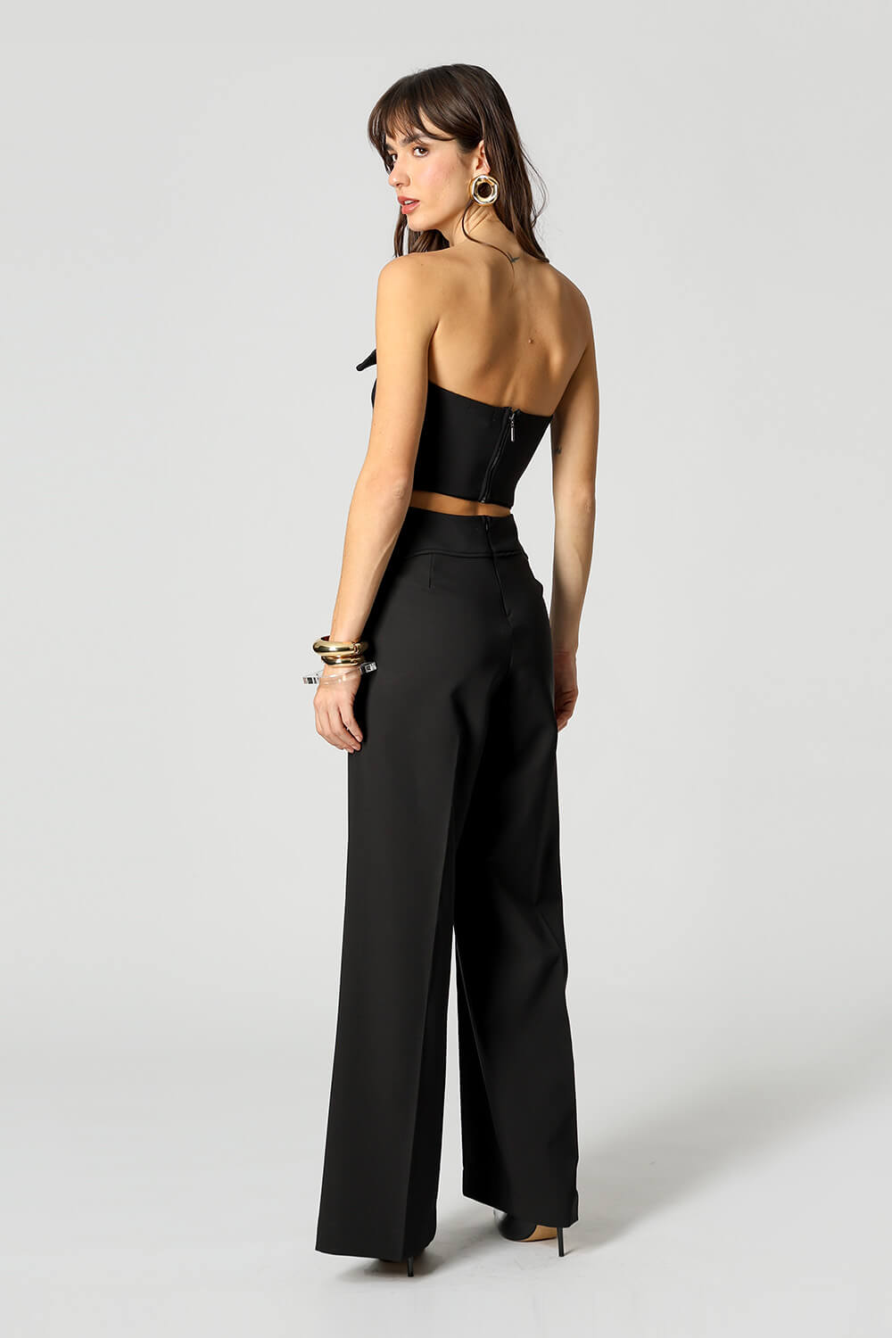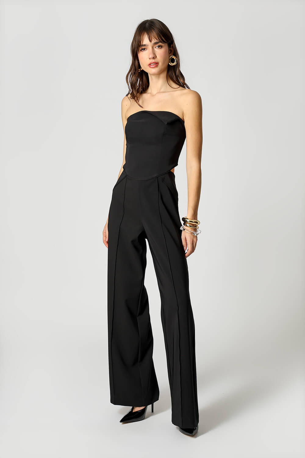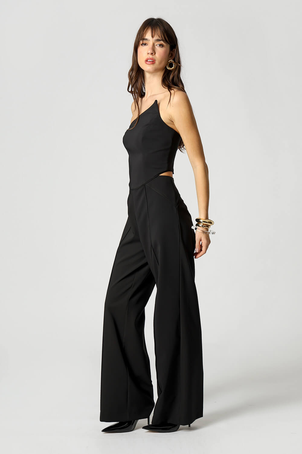 Macacão em alfaiataria com top assimétrico sem alça e abertura nas costas. Recortes vivos na cintura, no mesmo tom do tecido, valorizam a silhueta com elegância e design contemporâneo.
