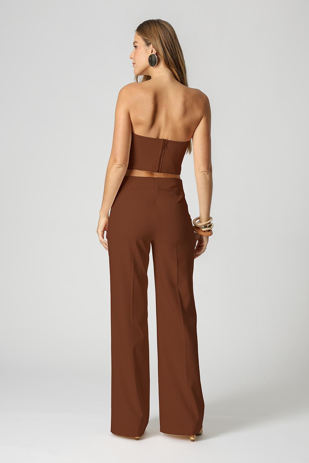 Macacão em alfaiataria com top assimétrico sem alça e abertura nas costas. Recortes vivos na cintura, no mesmo tom do tecido, valorizam a silhueta com elegância e design contemporâneo.