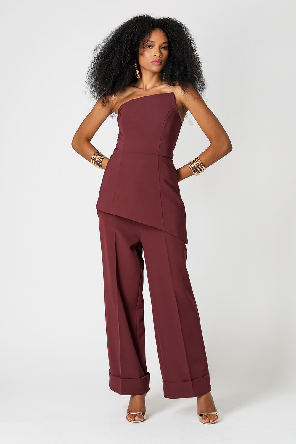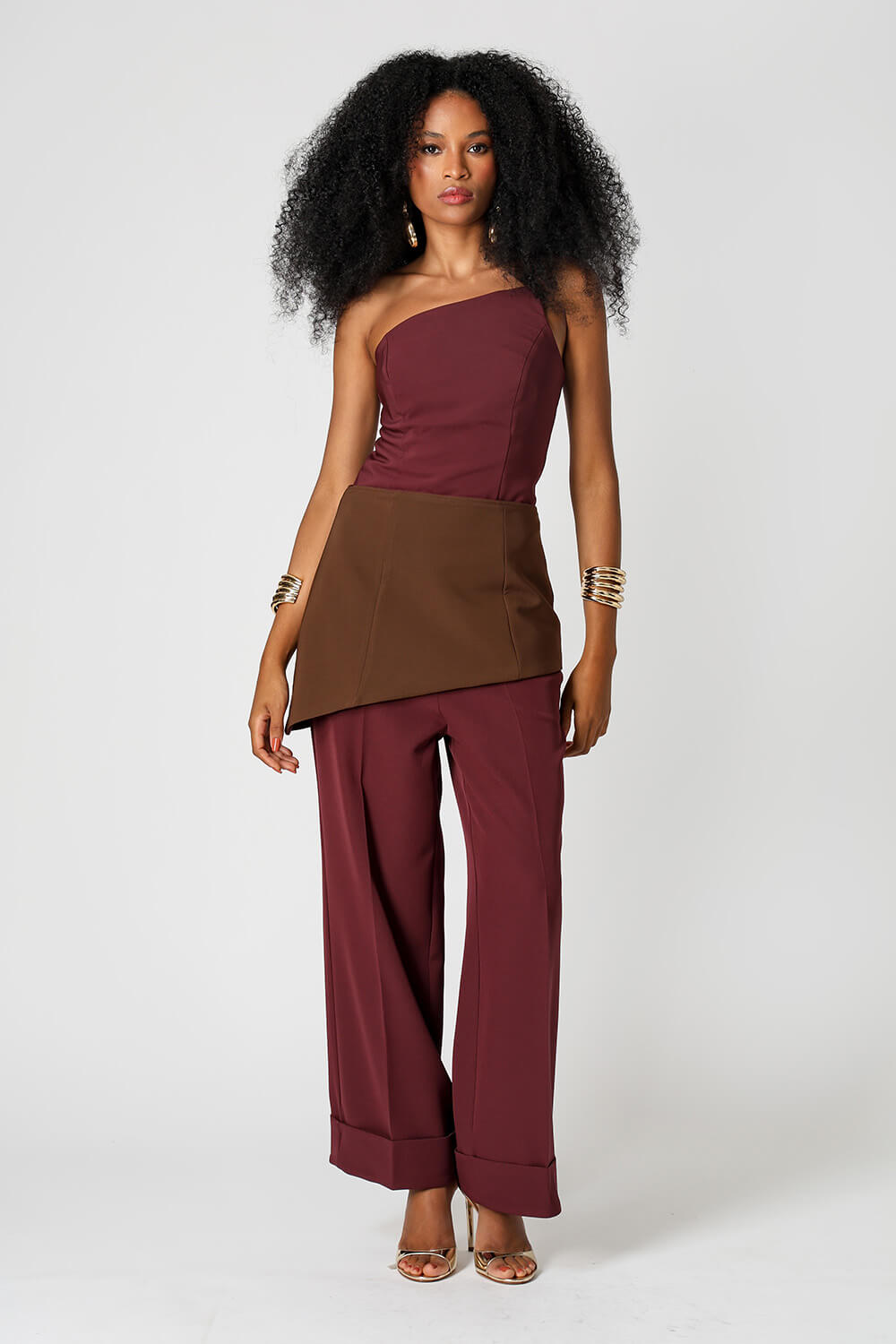 Pala em tecido de alfaiataria com design assimétrico, recortes estruturados e fechamento por zíper nas costas. Moderna e elegante.