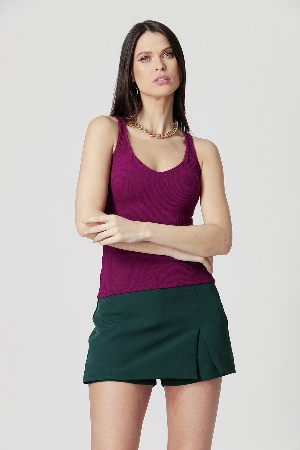 Top tirantes confeccionado en punto canalé, viene con copa, una pieza súper cómoda con un corte atemporal y muy práctica para diferentes looks.