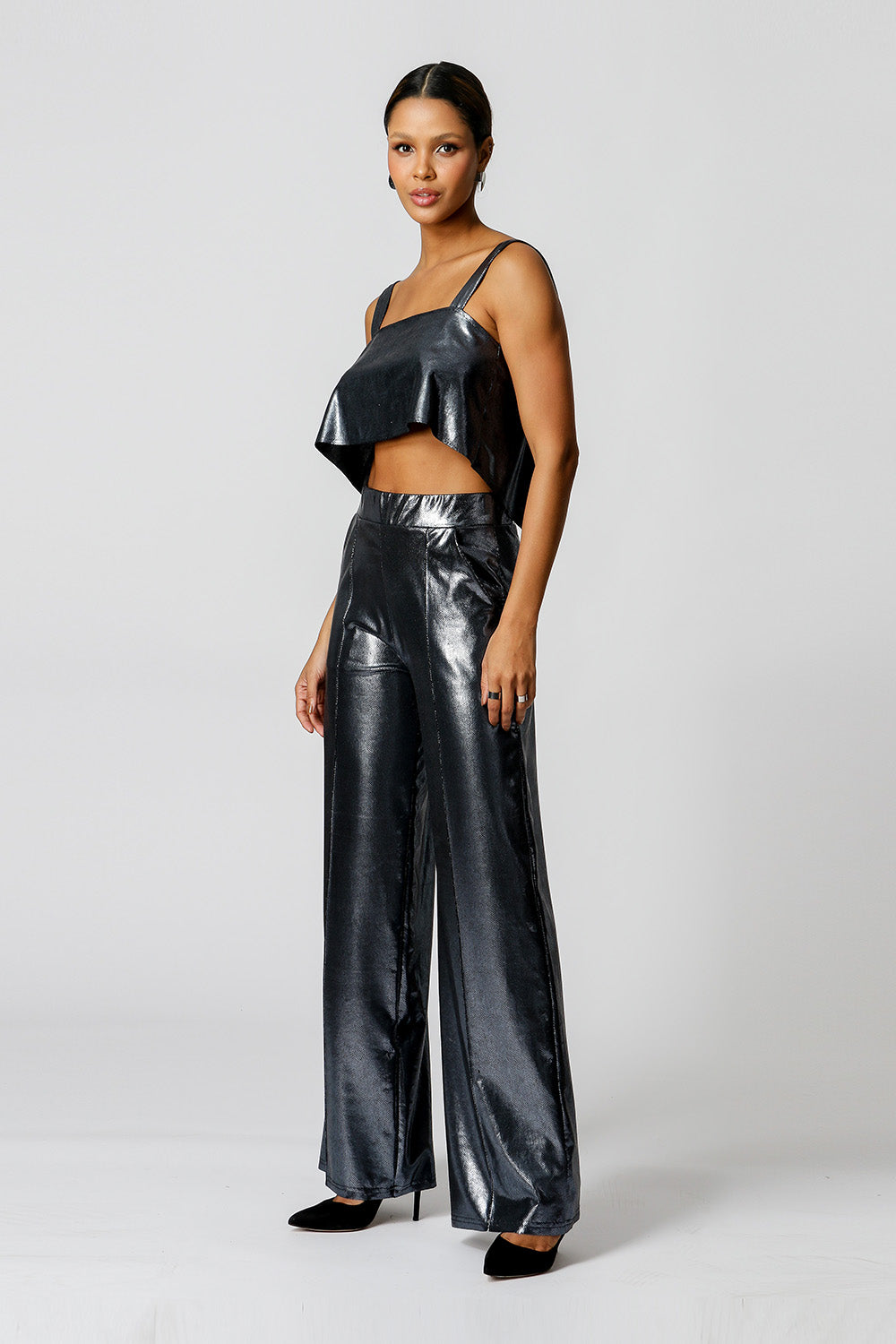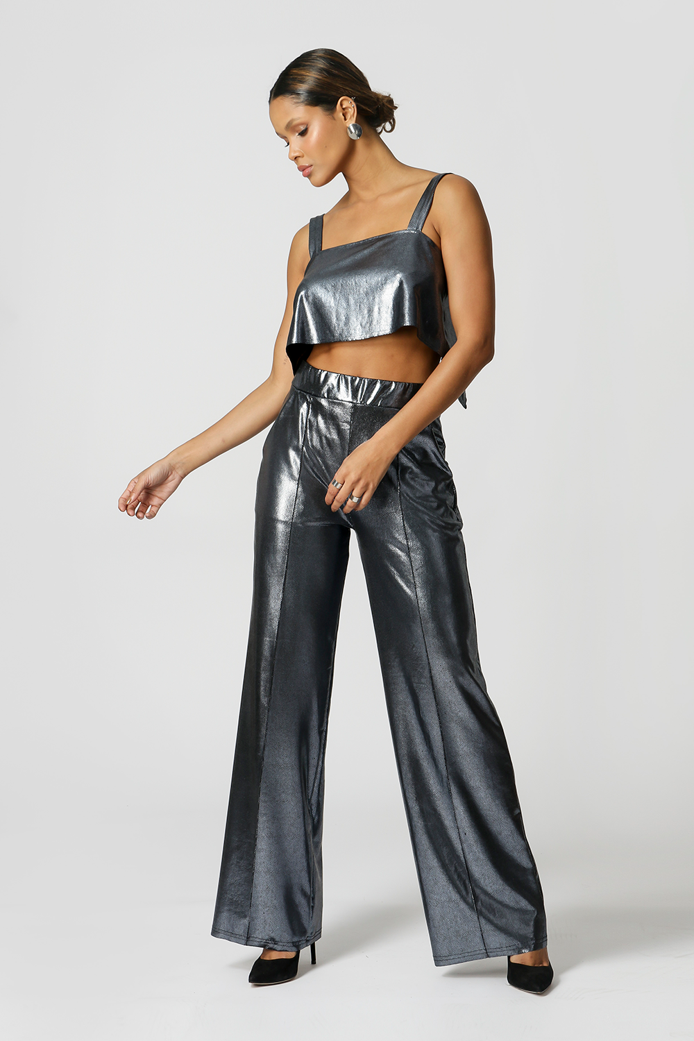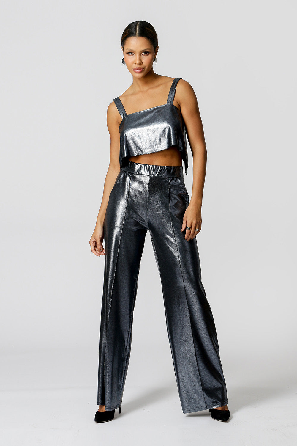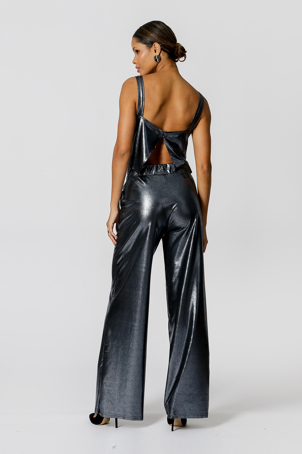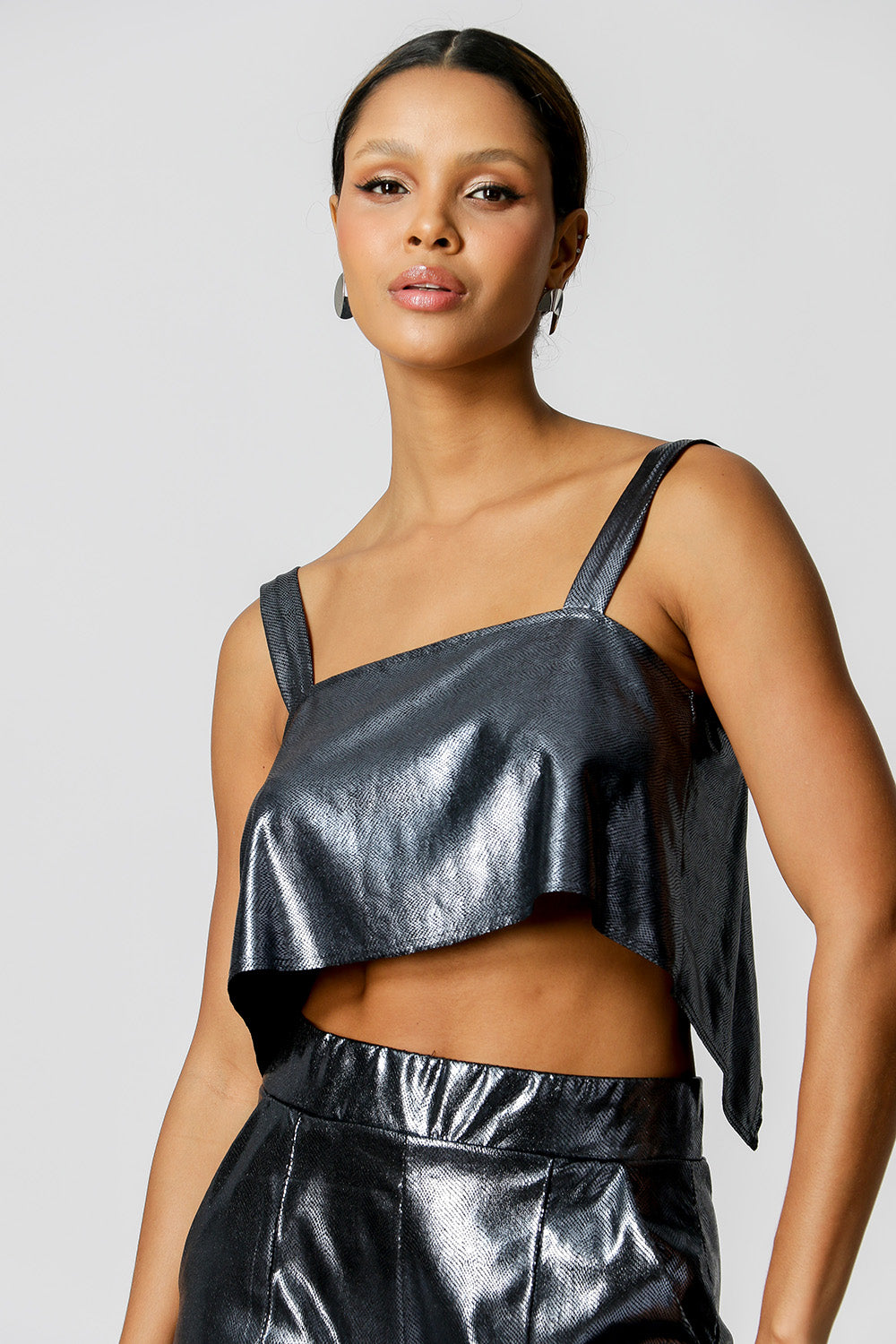 Camiseta sin mangas confeccionada en lámina texturizada. Detalle del botón trasero. ¡Una pieza que hará que tu noche luzca más atrevida!