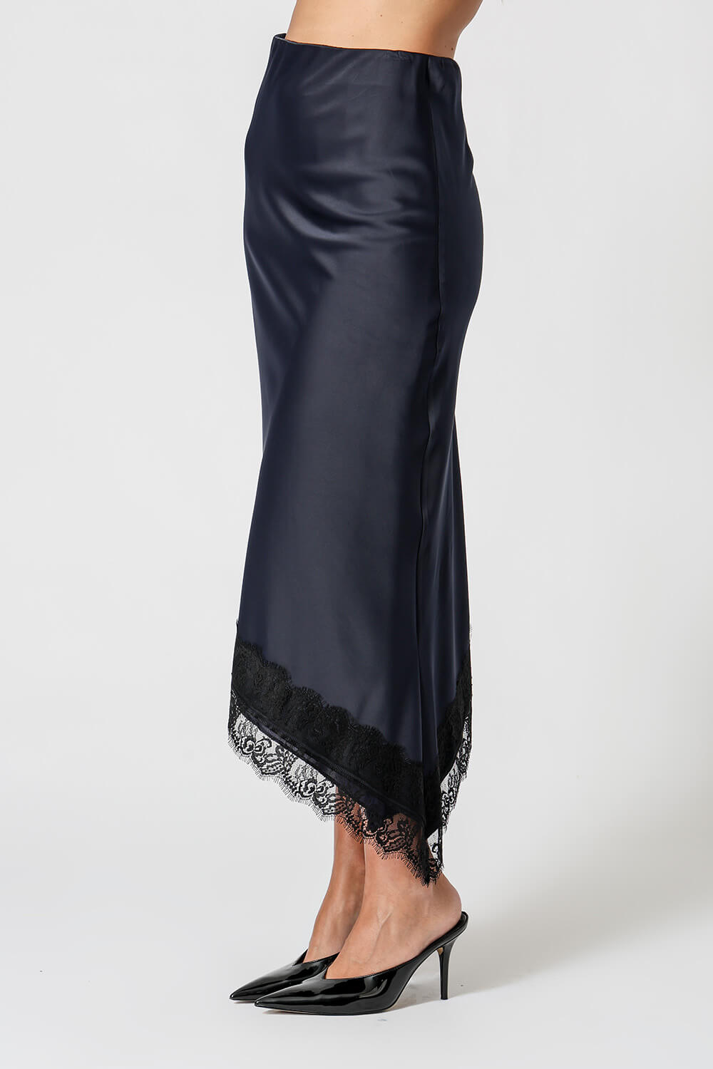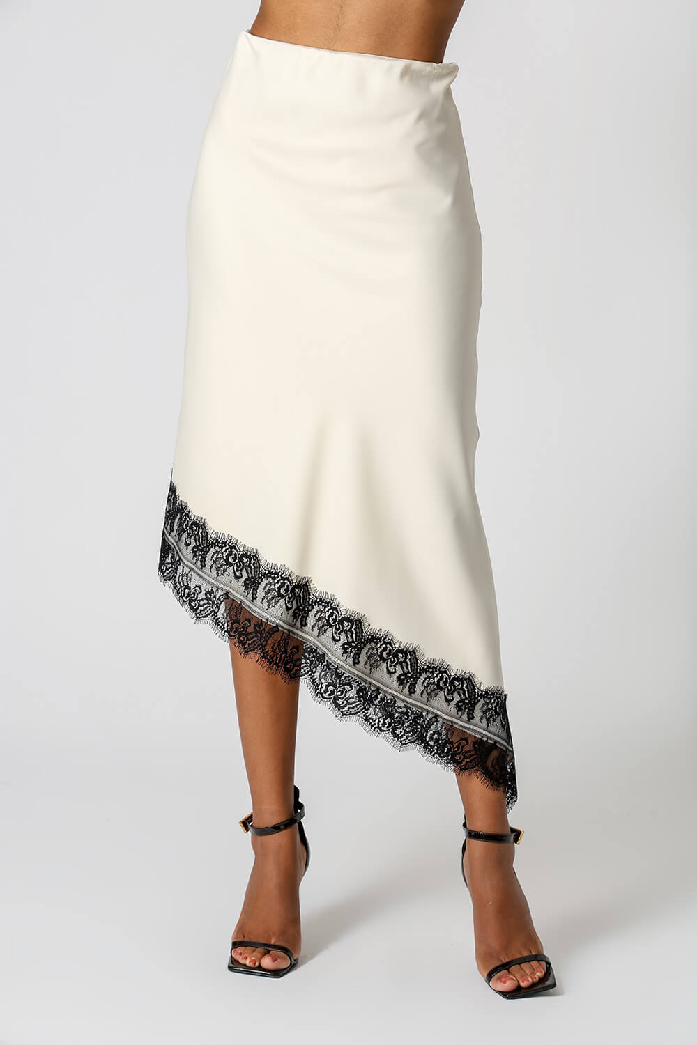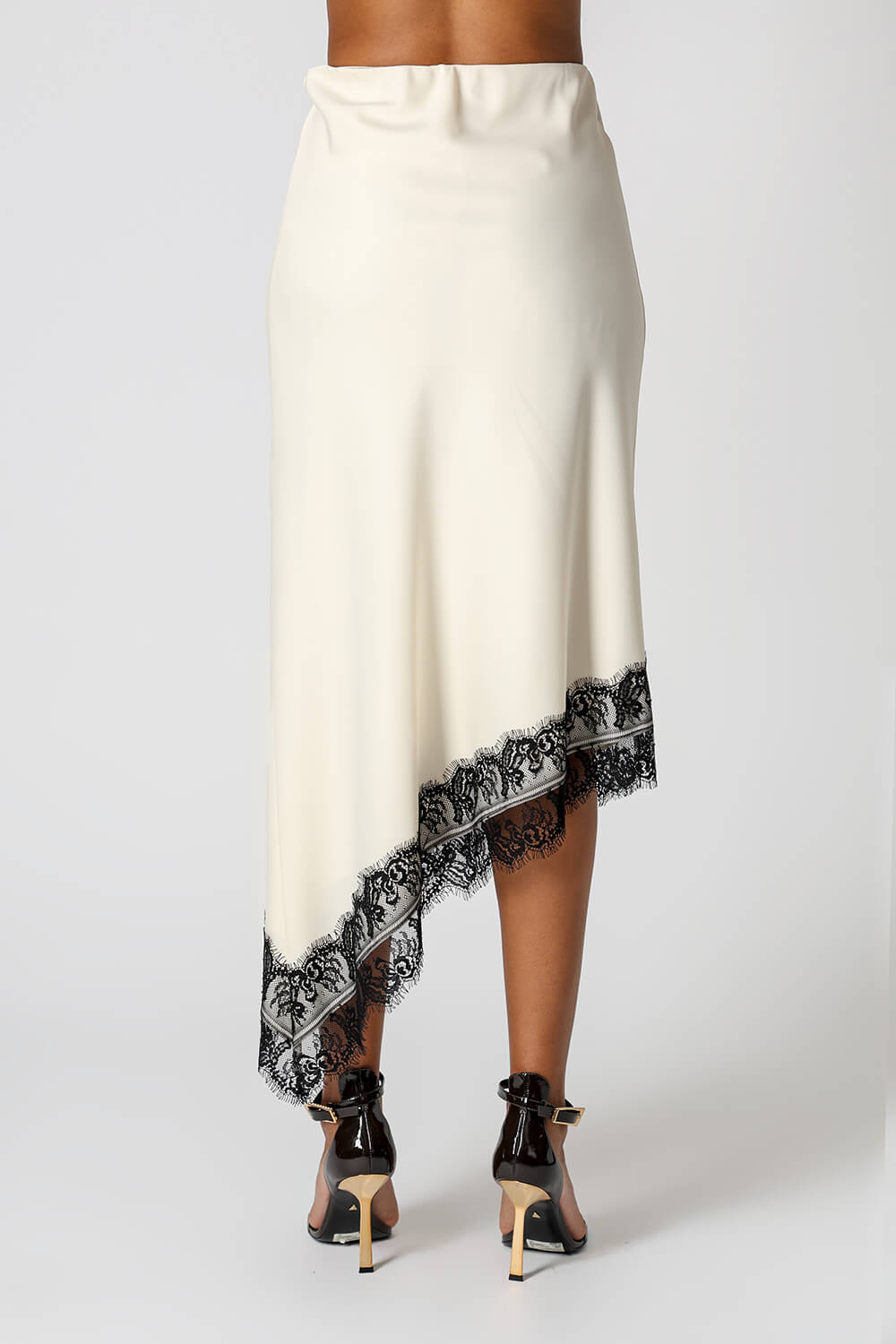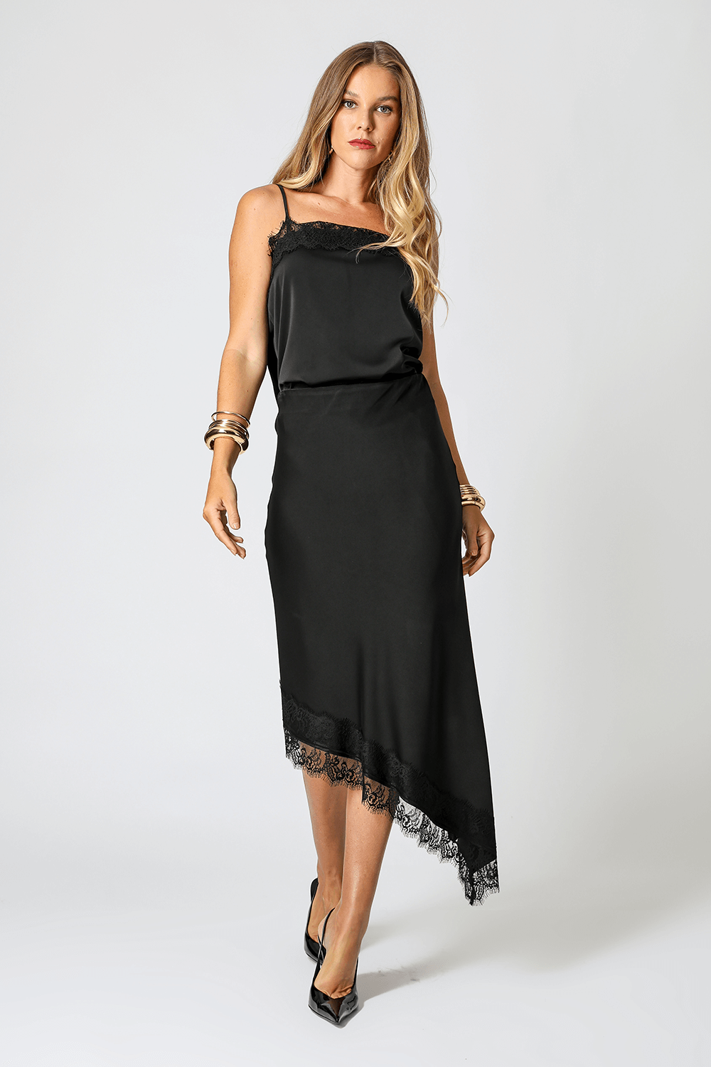 Saia em tecido cetim com caimento leve, barra assimétrica e detalhe em renda que traz sofisticação e feminilidade ao visual.
