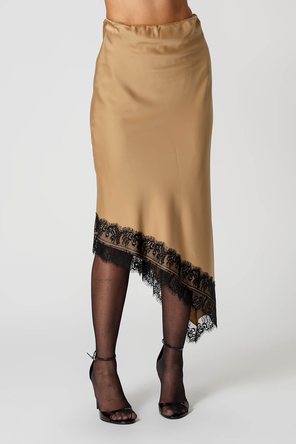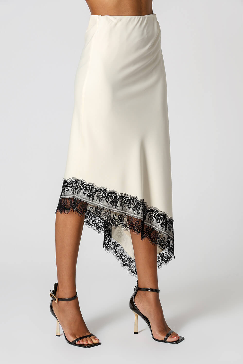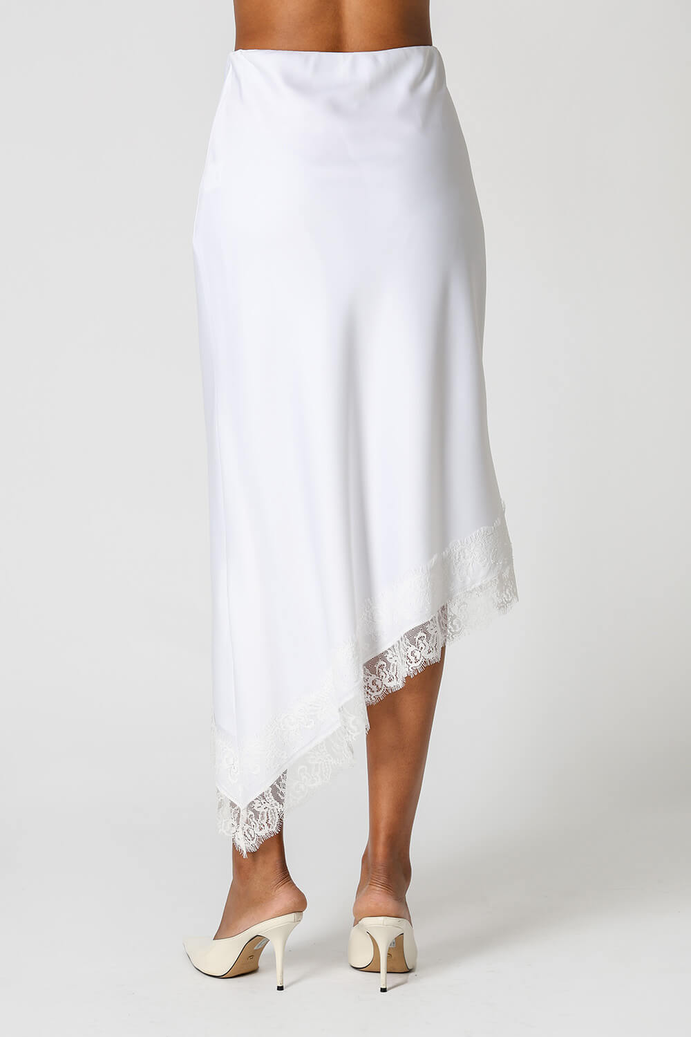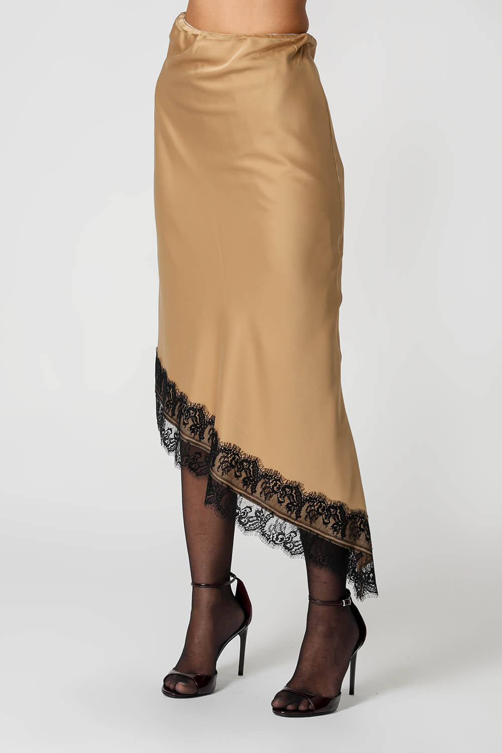 Saia em tecido cetim com caimento leve, barra assimétrica e detalhe em renda que traz sofisticação e feminilidade ao visual.