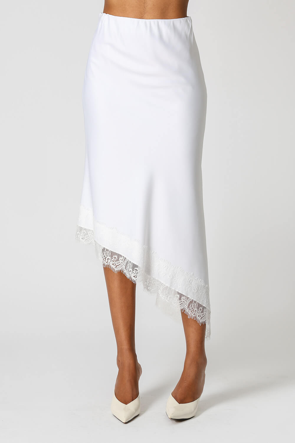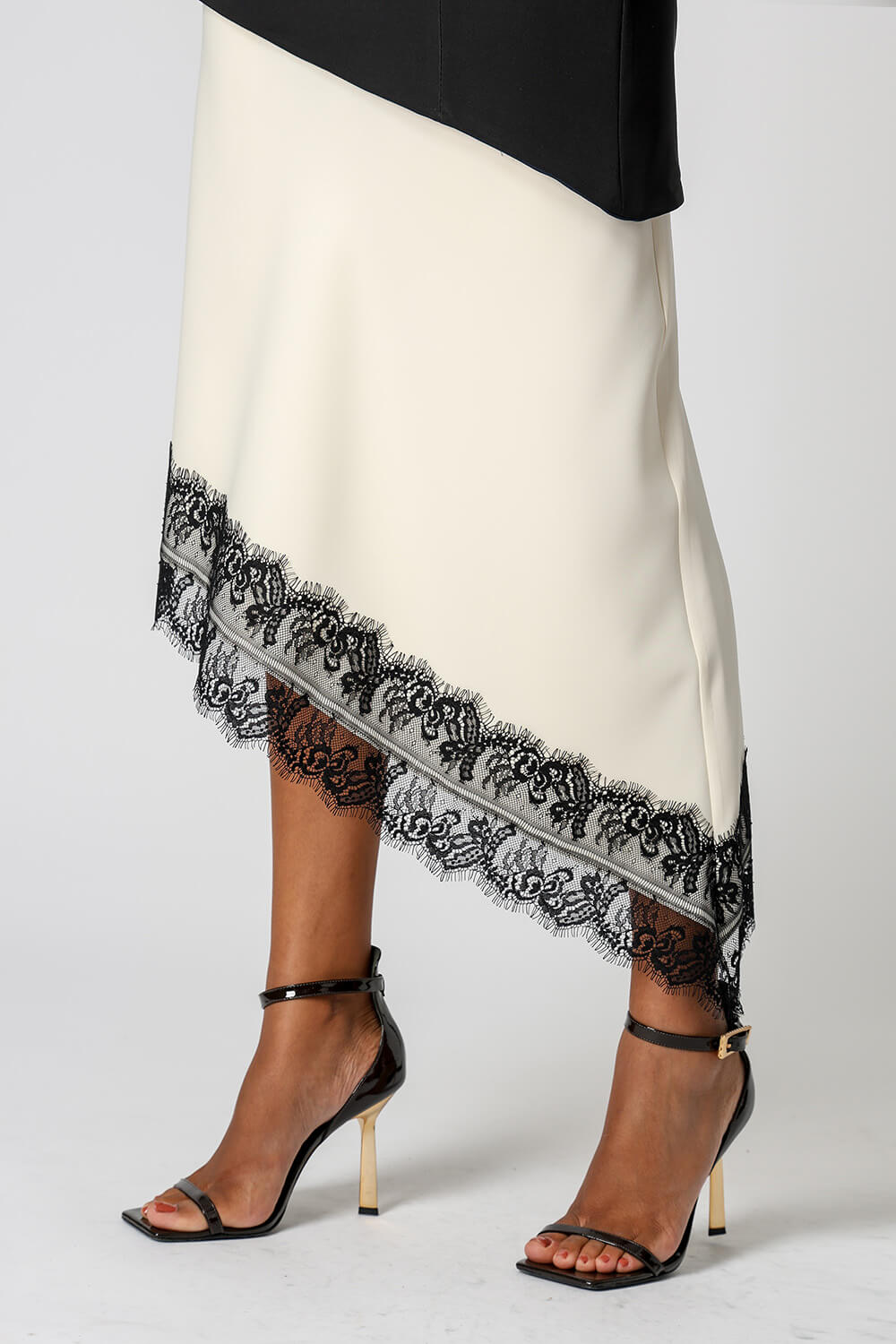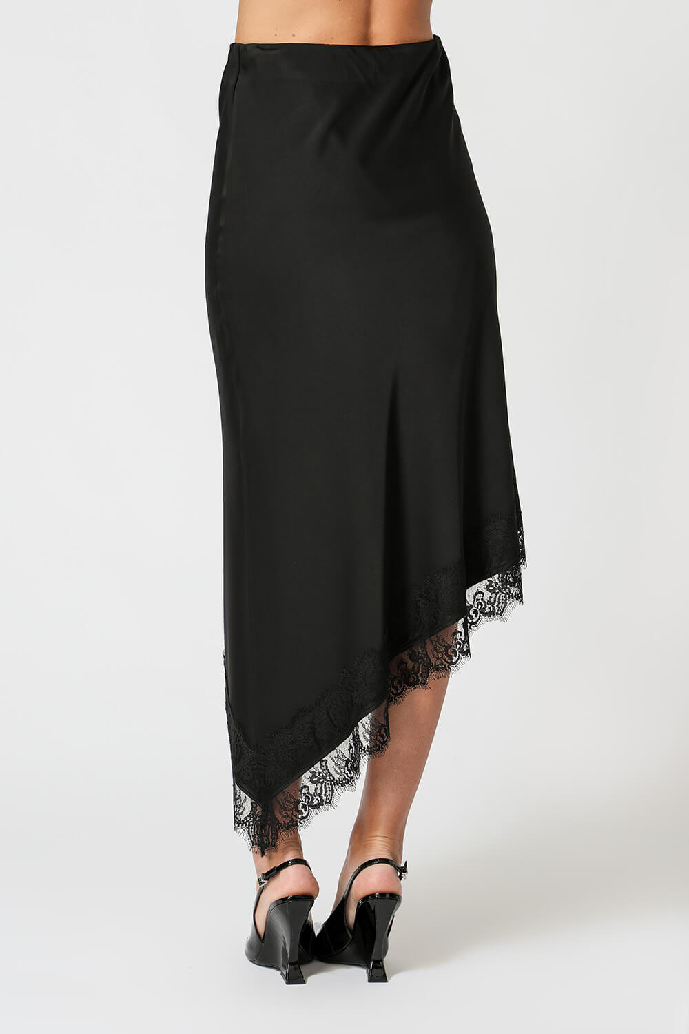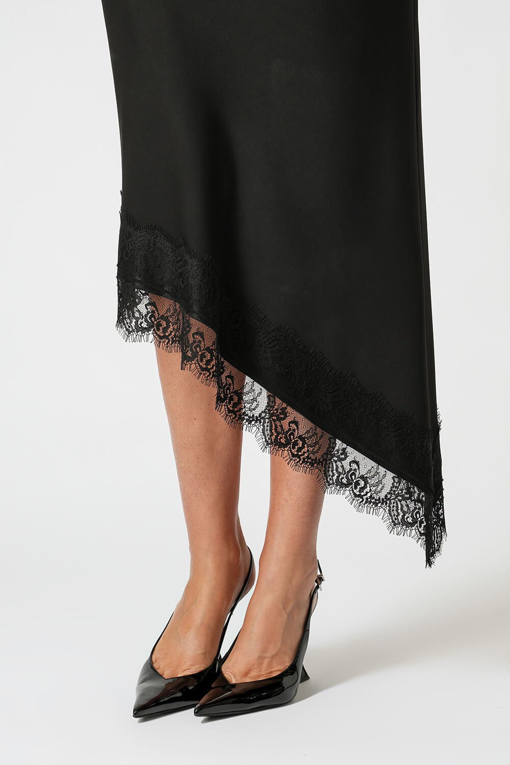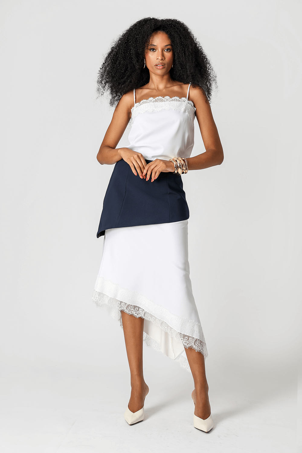 Saia em tecido cetim com caimento leve, barra assimétrica e detalhe em renda que traz sofisticação e feminilidade ao visual.