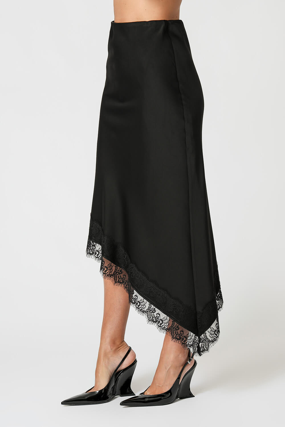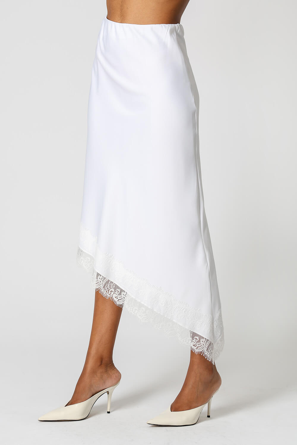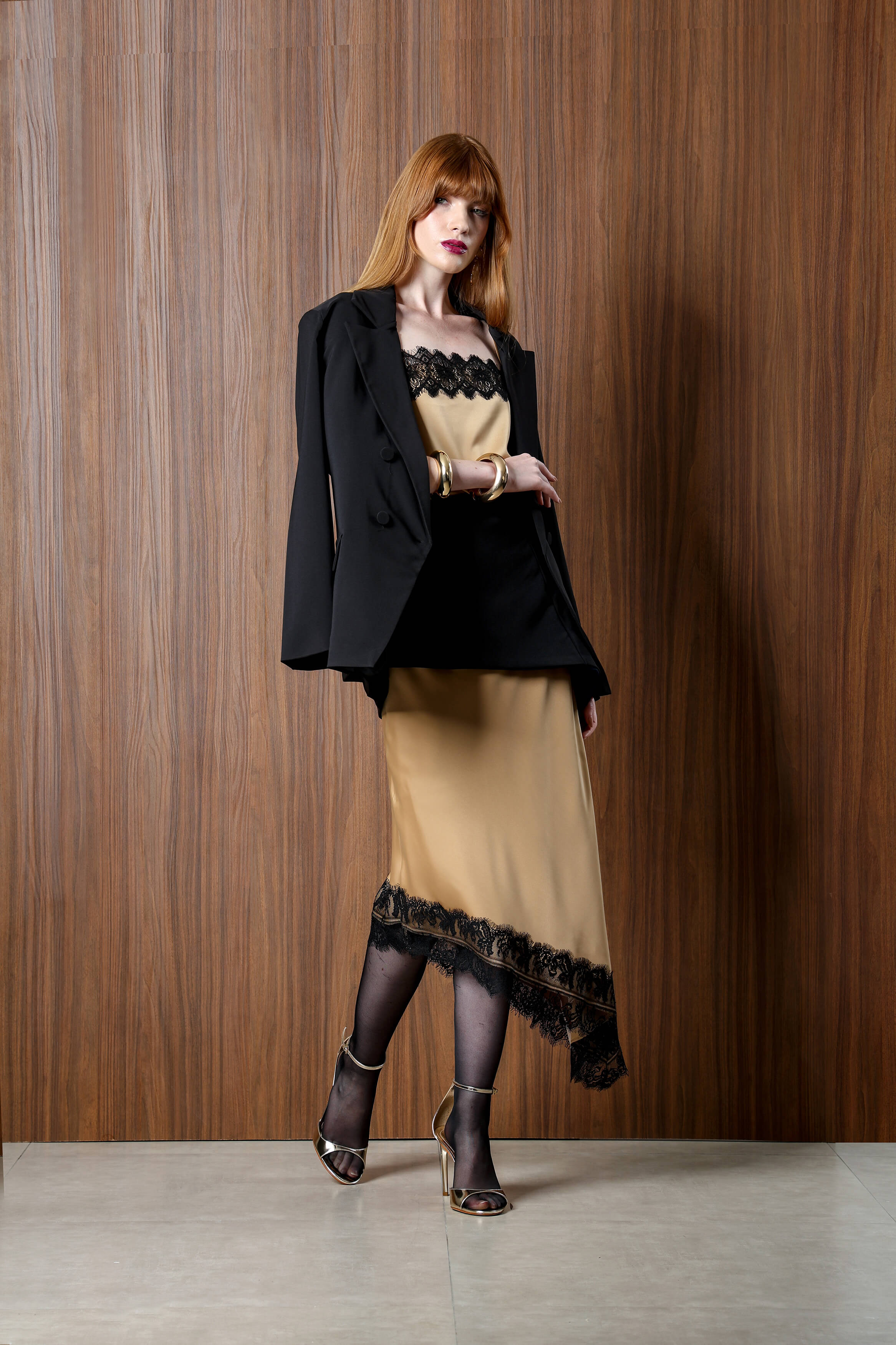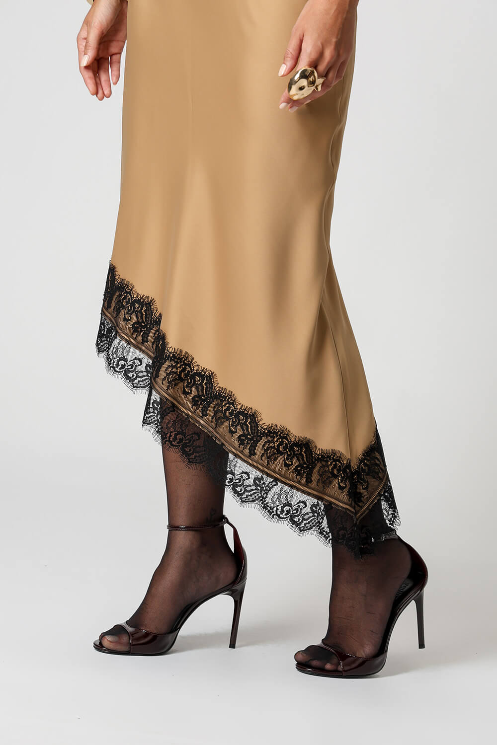 Saia em tecido cetim com caimento leve, barra assimétrica e detalhe em renda que traz sofisticação e feminilidade ao visual.