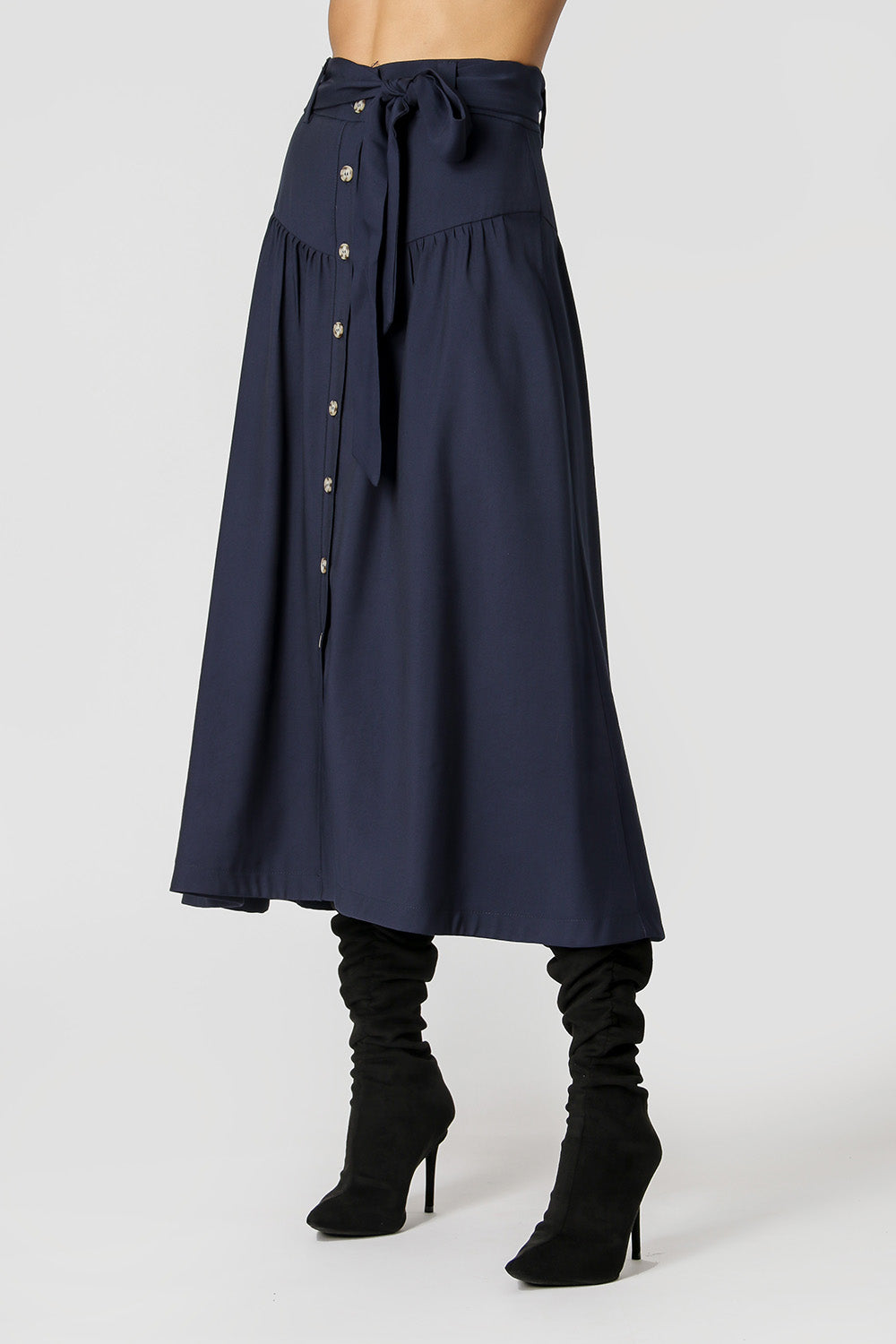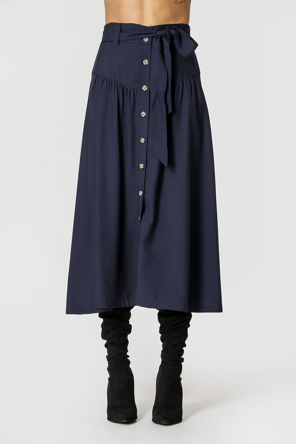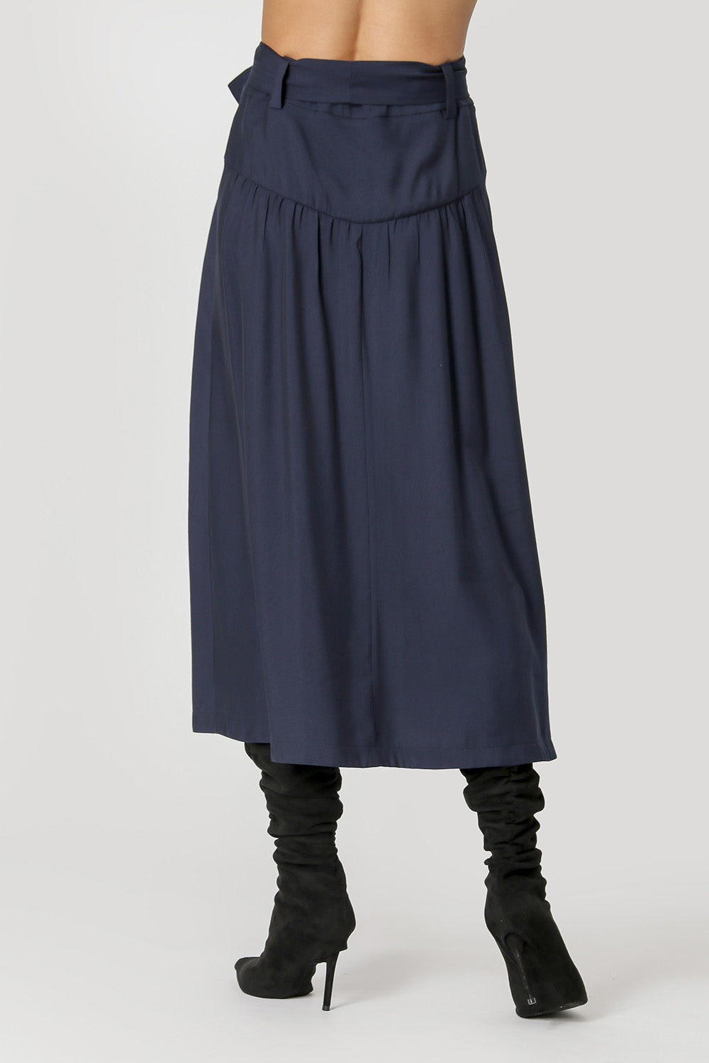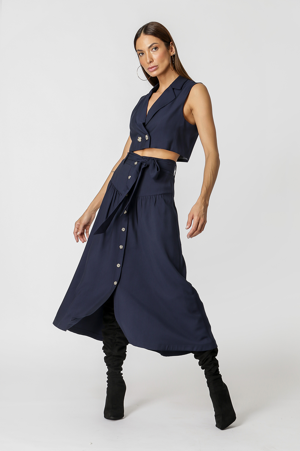 Falda confeccionada en tejido sastre de forma más fluida, con ligeros frunces, cinturón para anudar y cierre con botones en la parte delantera. Una pieza elegante para que apuestes sin miedo.