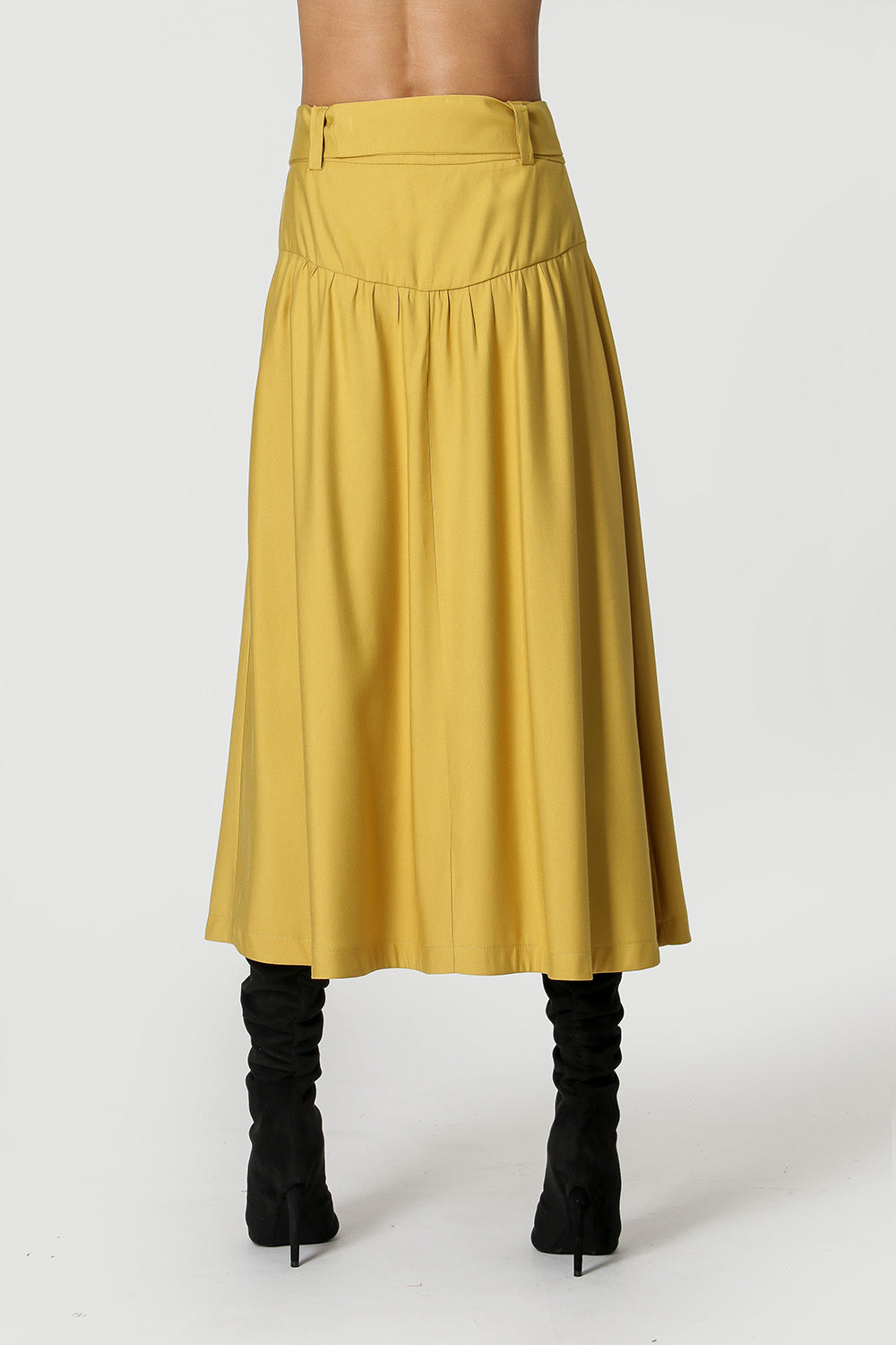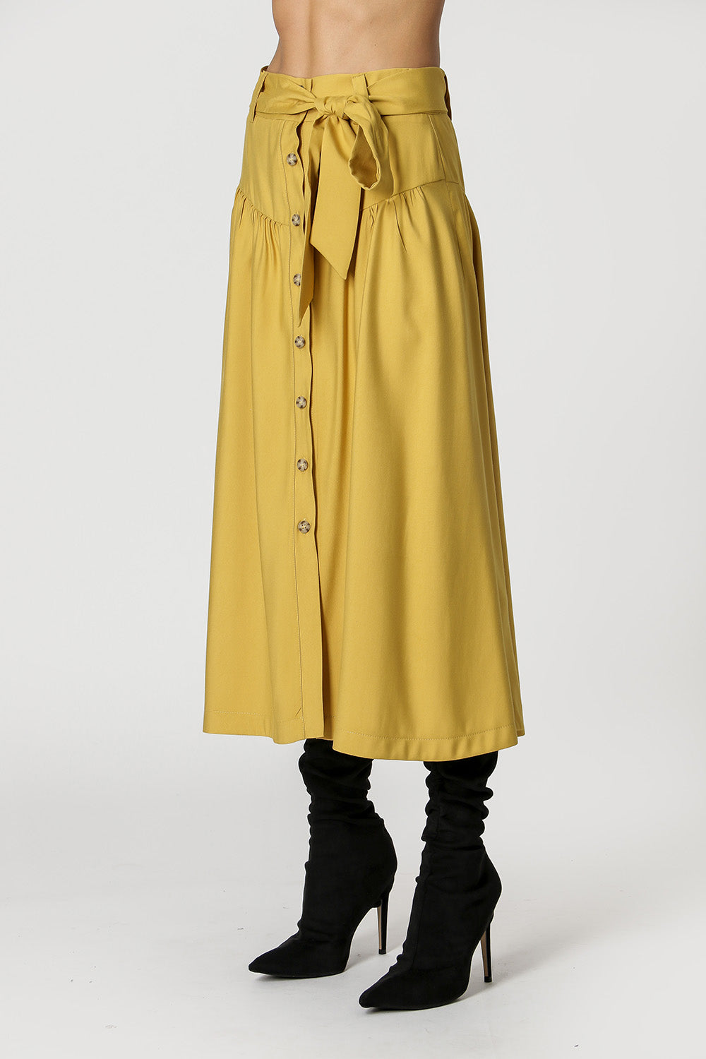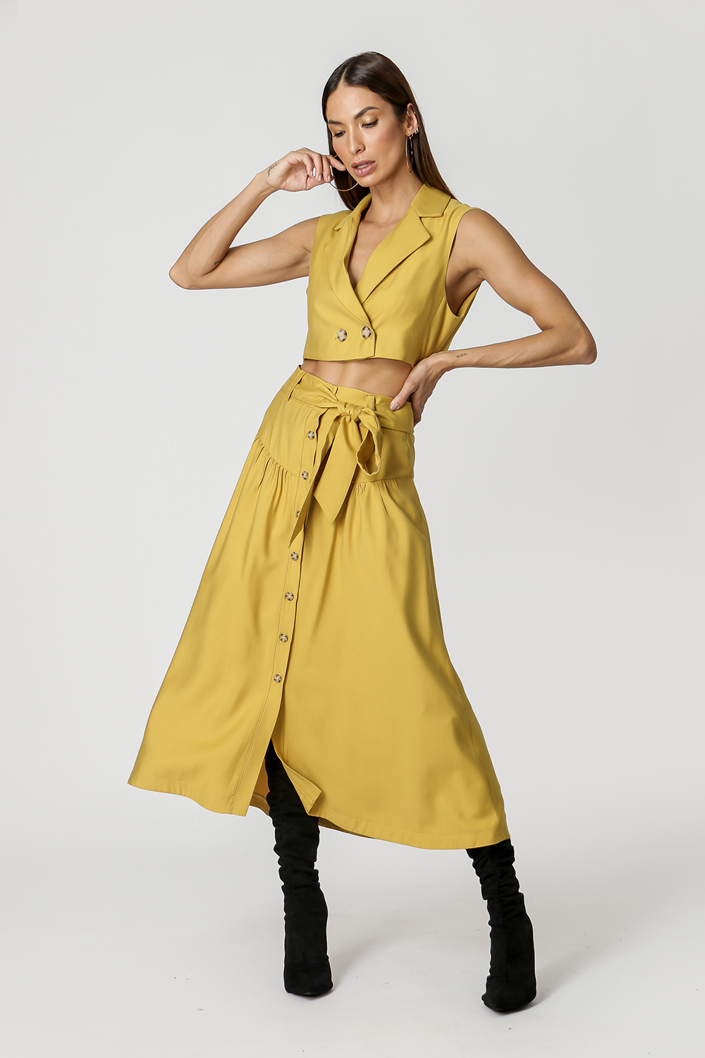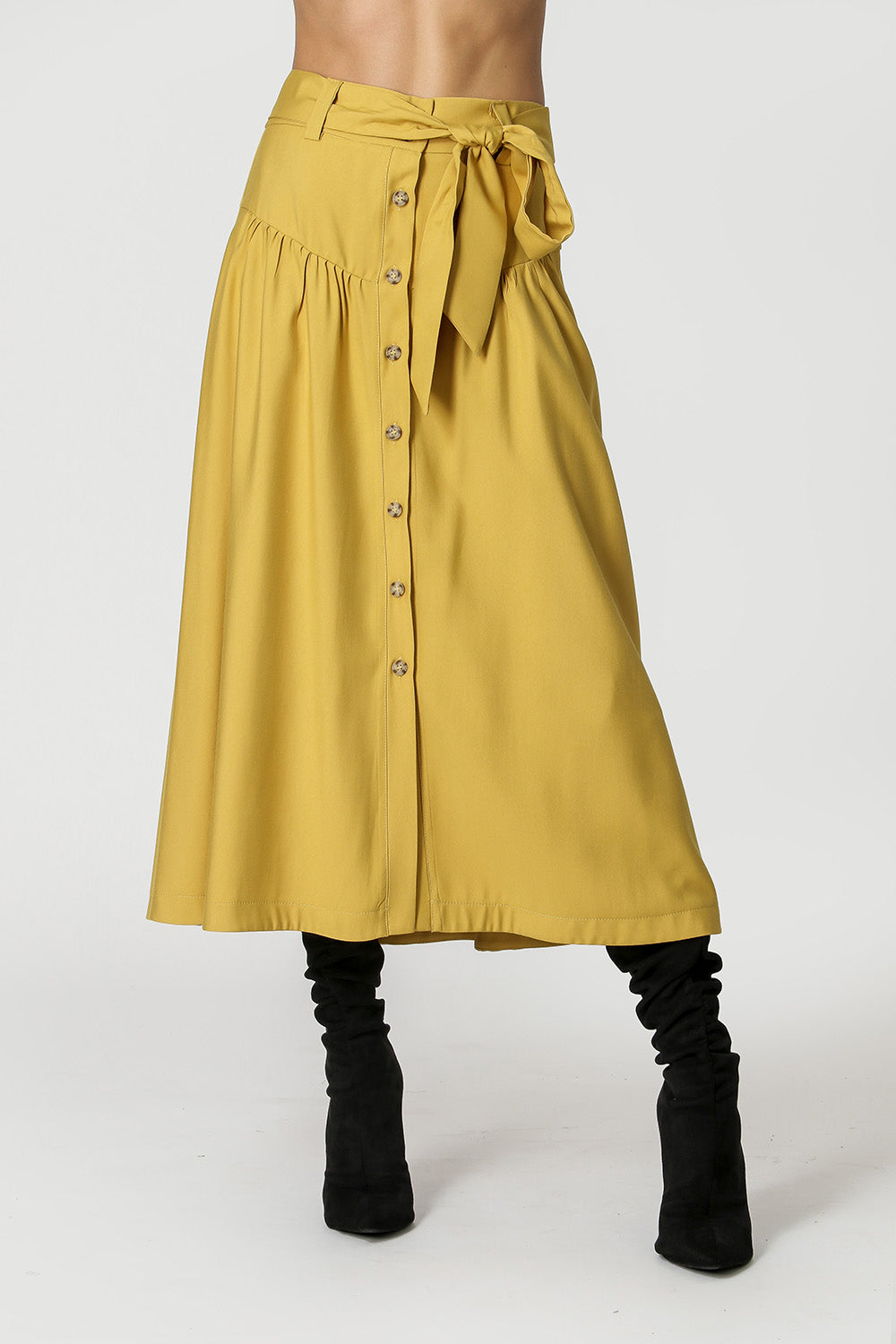 Falda confeccionada en tejido sastre de forma más fluida, con ligeros frunces, cinturón para anudar y cierre con botones en la parte delantera. Una pieza elegante para que apuestes sin miedo.