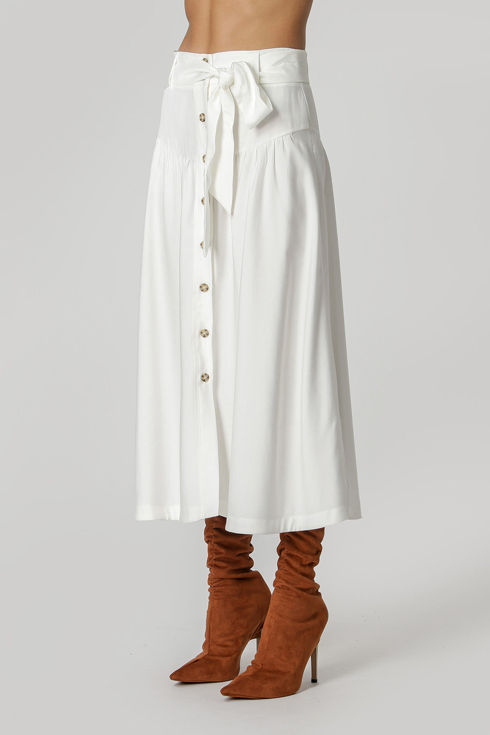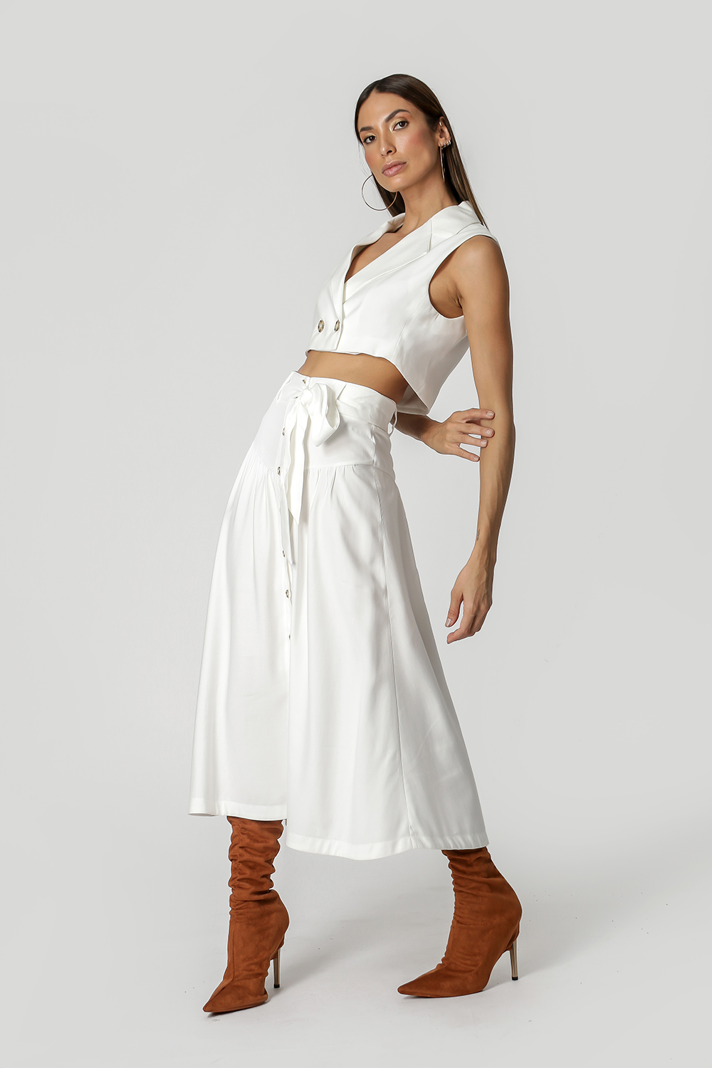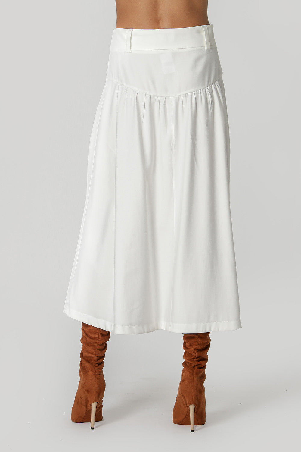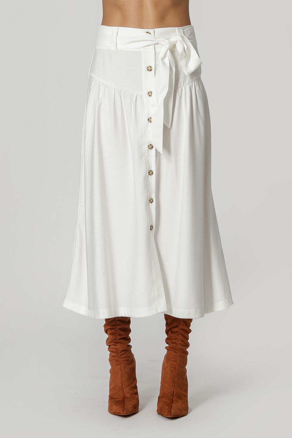 Falda confeccionada en tejido sastre de forma más fluida, con ligeros frunces, cinturón para anudar y cierre con botones en la parte delantera. Una pieza elegante para que apuestes sin miedo.