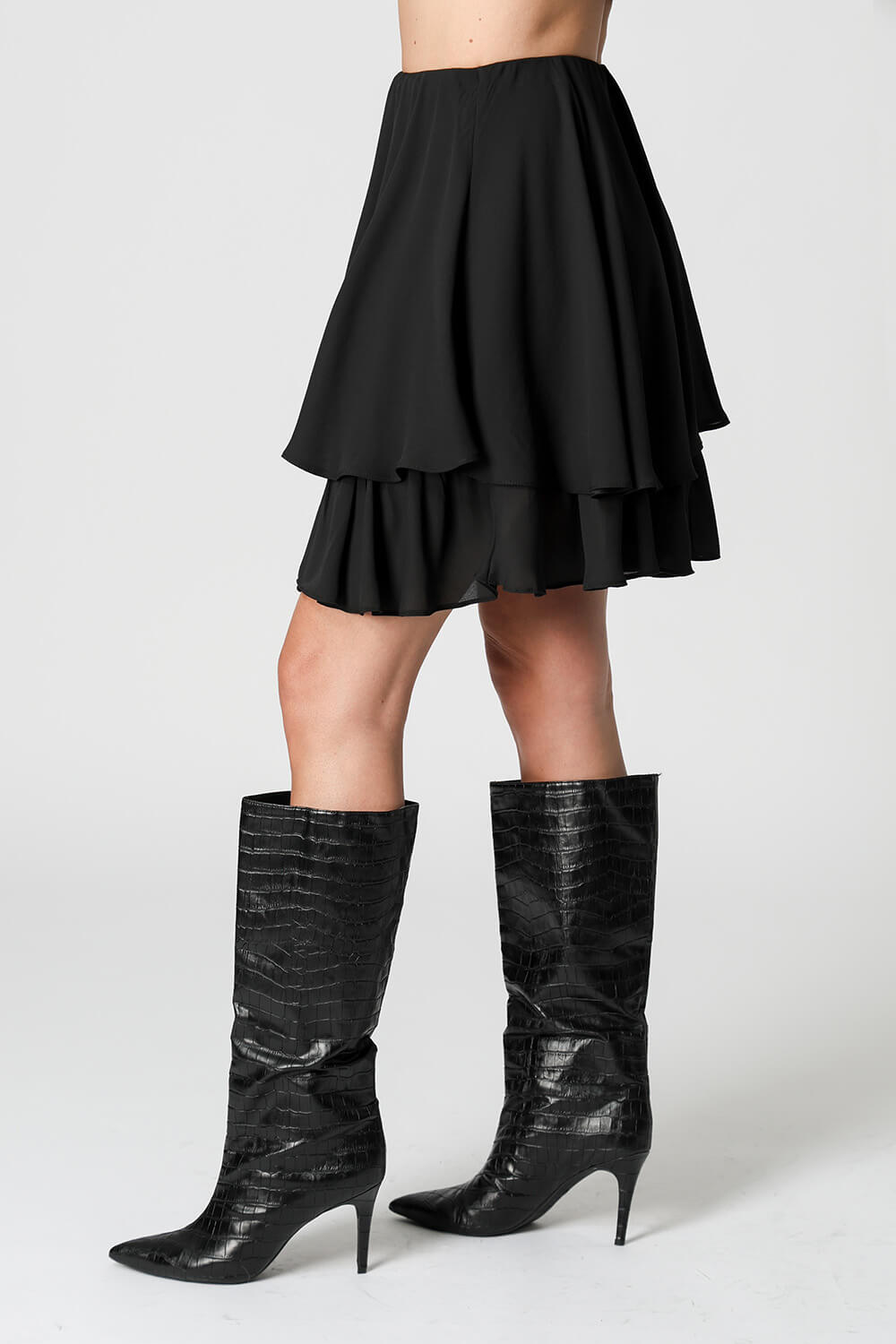 Saia leve e feminina, com dois babados que trazem movimento e charme à peça. Possui cós com elástico, garantindo conforto e ajuste perfeito. Confeccionada em crepe fluido, é ideal para looks versáteis e delicados.