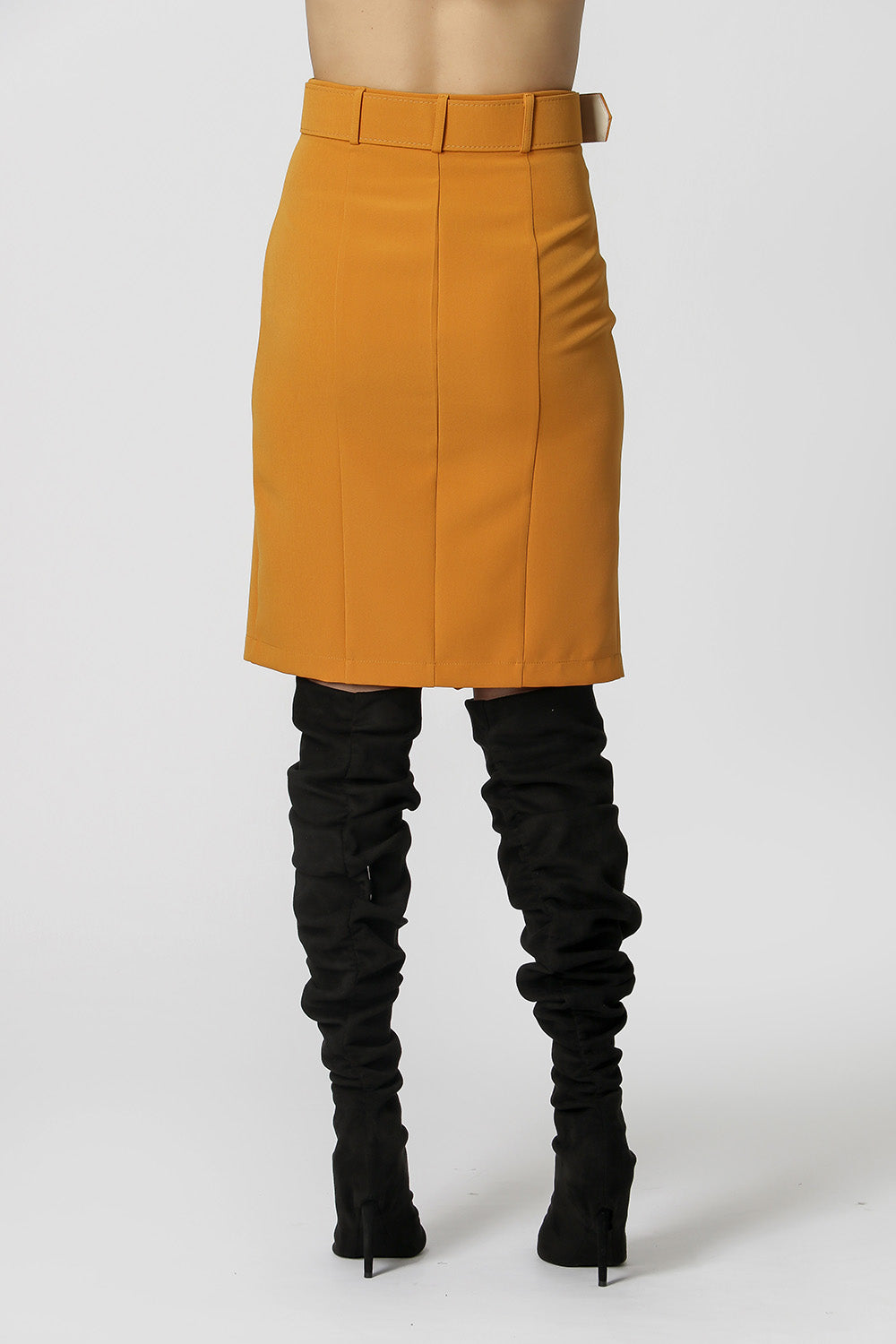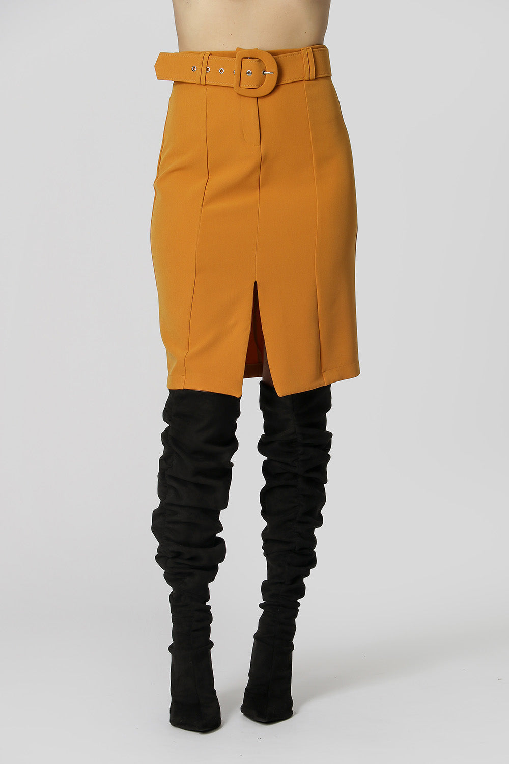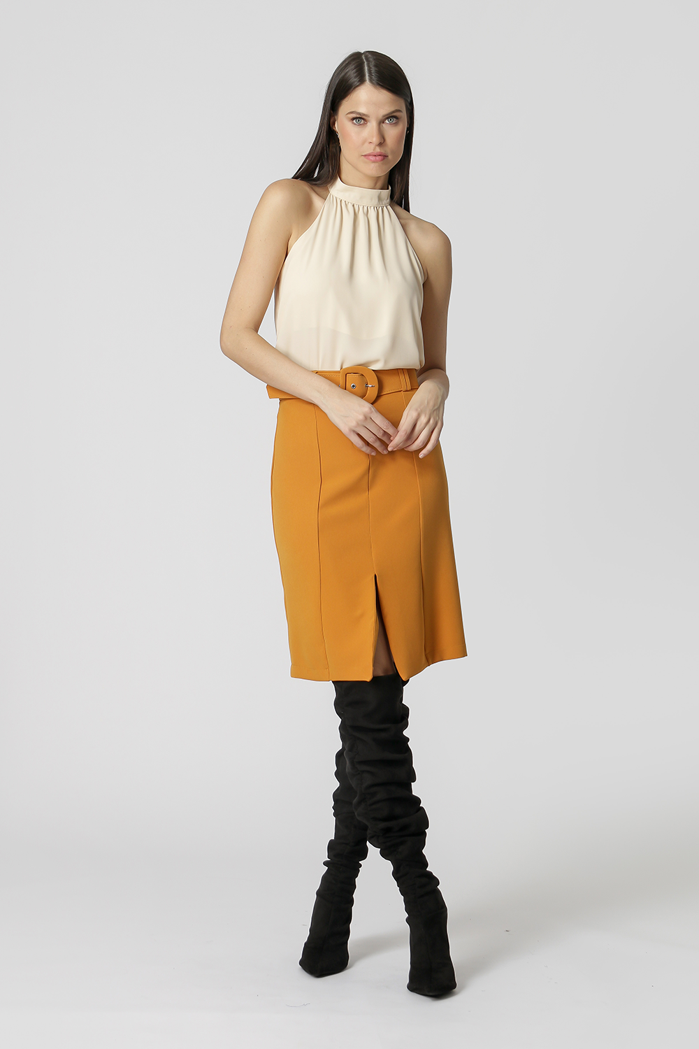 Falda entallada, más ajustada al cuerpo, con cortes y detalle de abertura frontal. Perfecto para crear looks de trabajo.