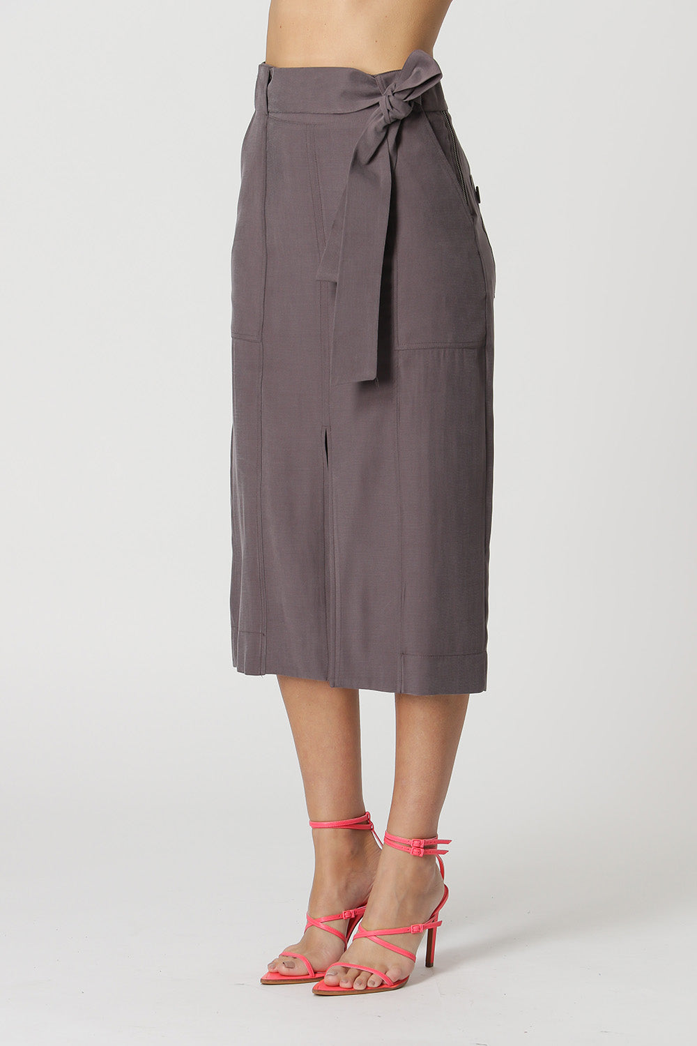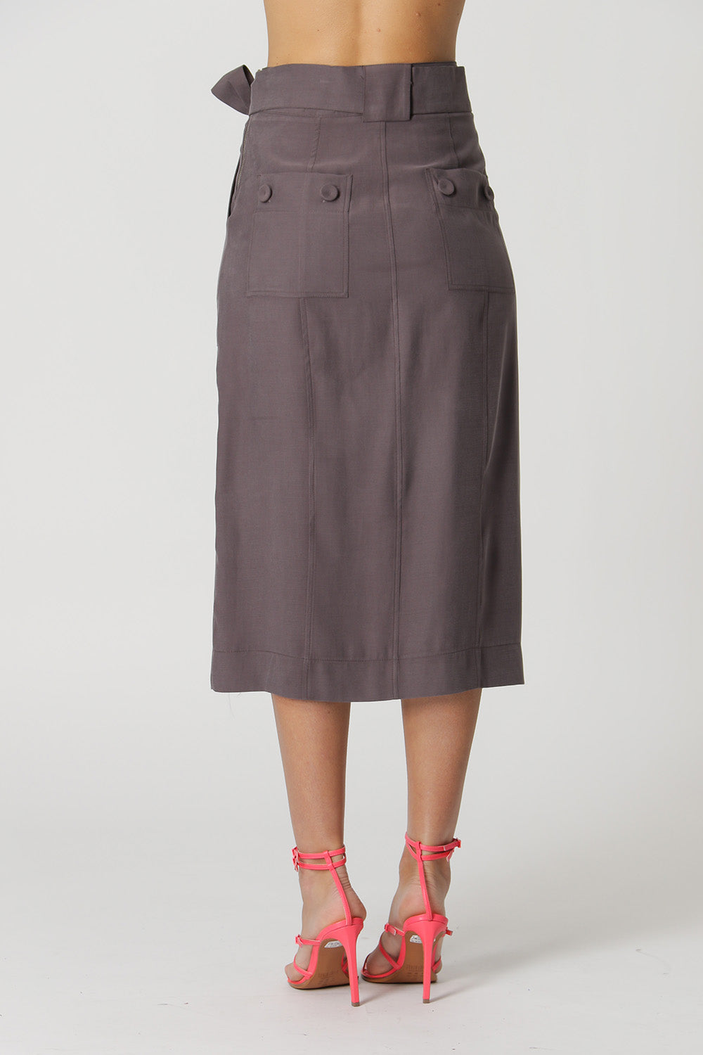 Falda confeccionada en Tencel. Tiene una forma recta que se ajusta holgadamente al cuerpo, una abertura frontal, bolsillos en la parte delantera y trasera, detalles de costura en los recortes, bolsillos y banda, viene con una banda para atar y una cremallera lateral. Pieza versátil y elegante.