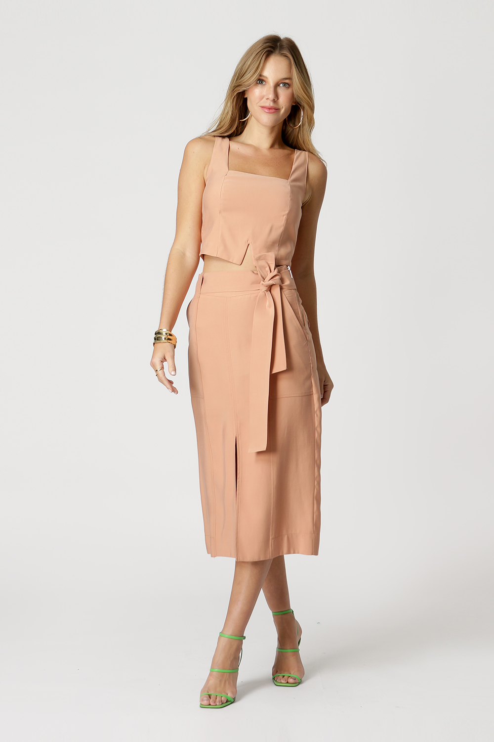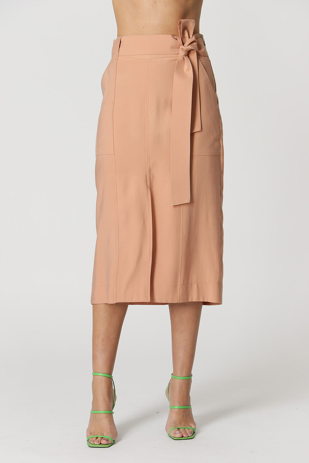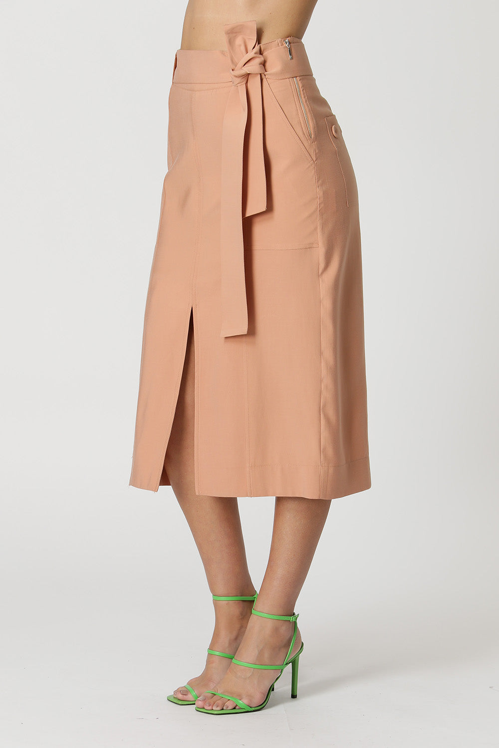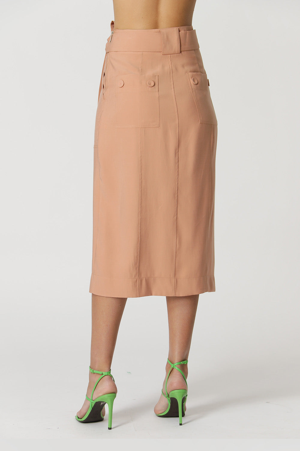 Falda confeccionada en Tencel. Tiene una forma recta que se ajusta holgadamente al cuerpo, una abertura frontal, bolsillos en la parte delantera y trasera, detalles de costura en los recortes, bolsillos y banda, viene con una banda para atar y una cremallera lateral. Pieza versátil y elegante.