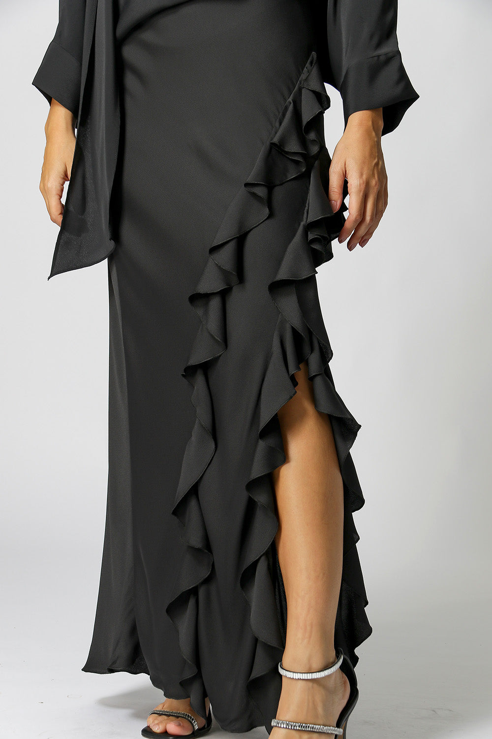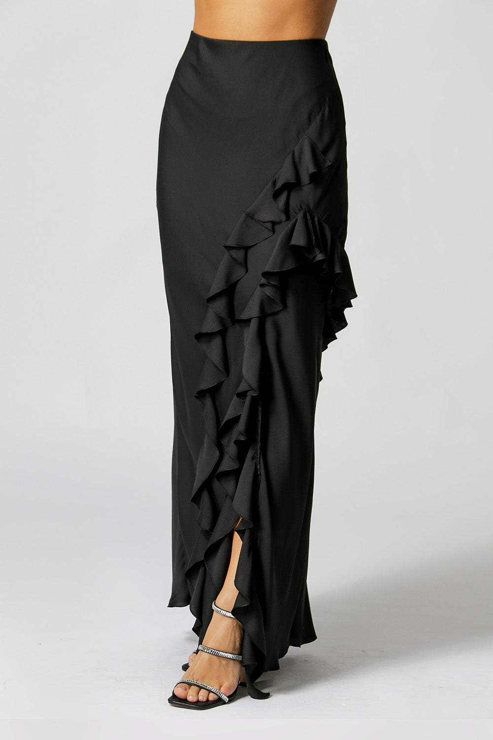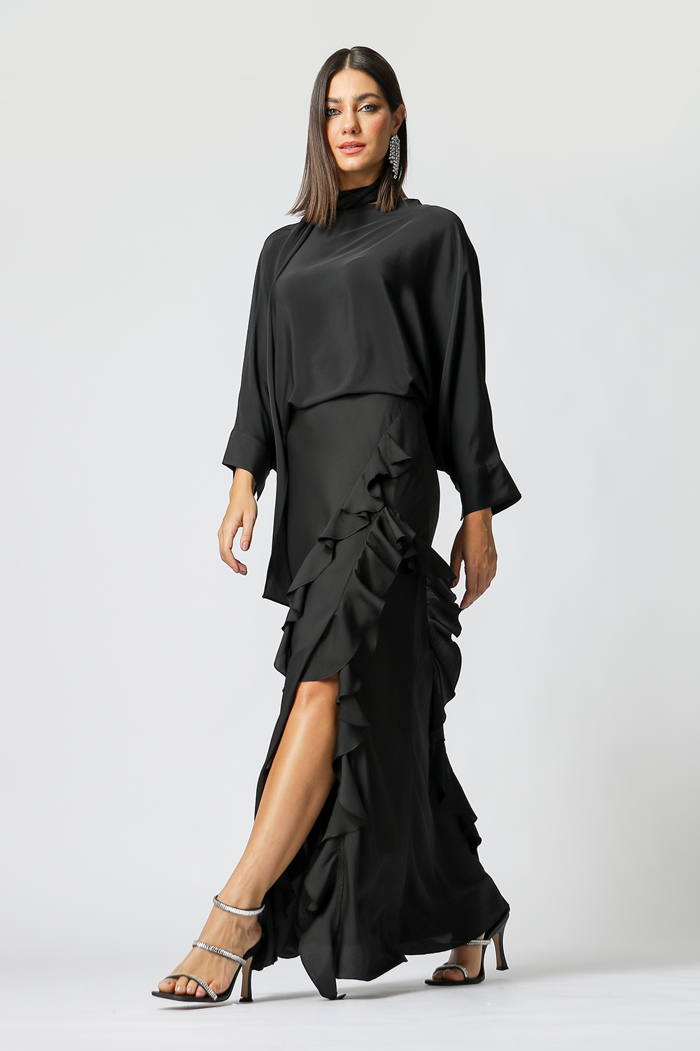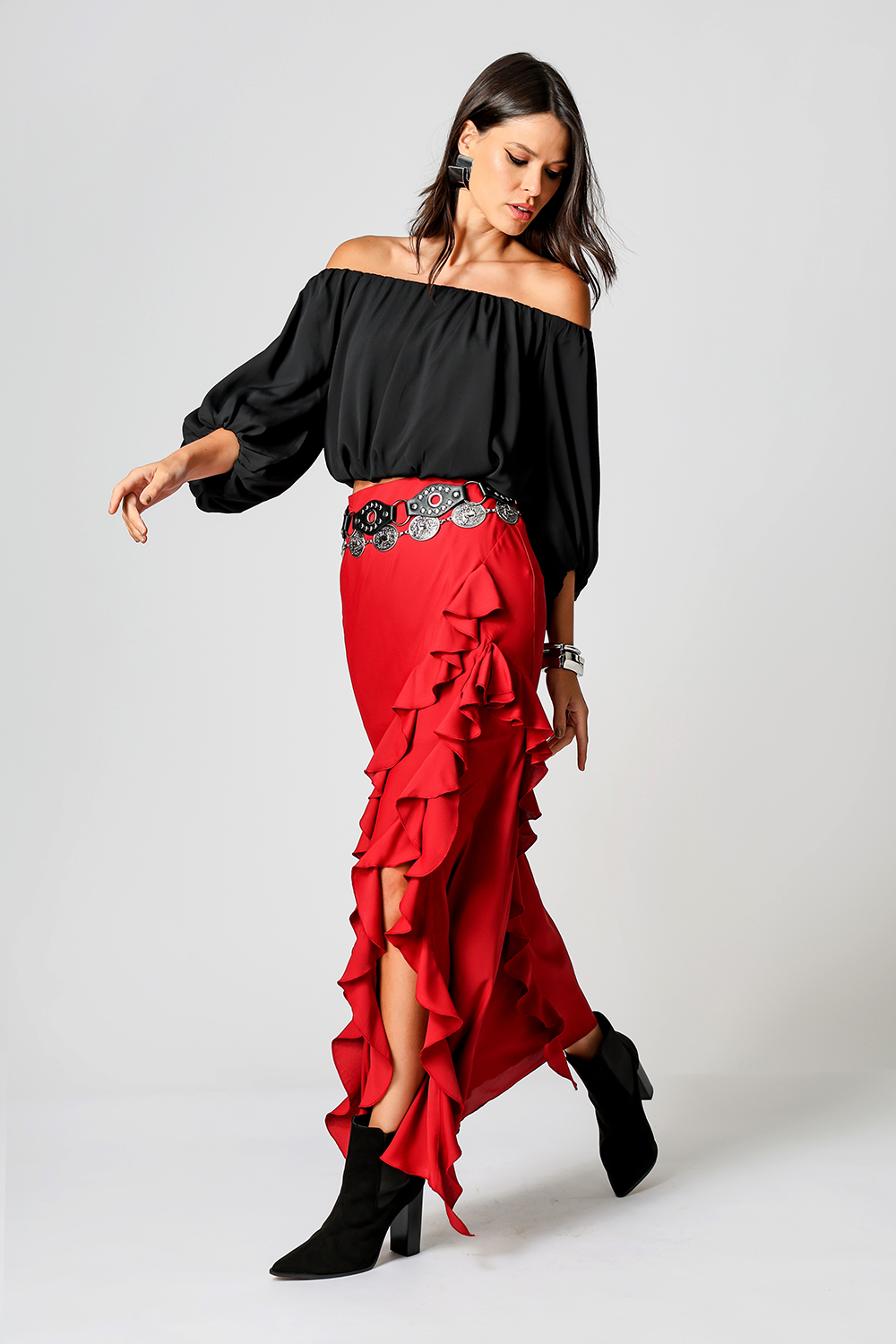 Saia longa com fenda frontal e babados. Peça elegante com muita informação de moda, aposte!