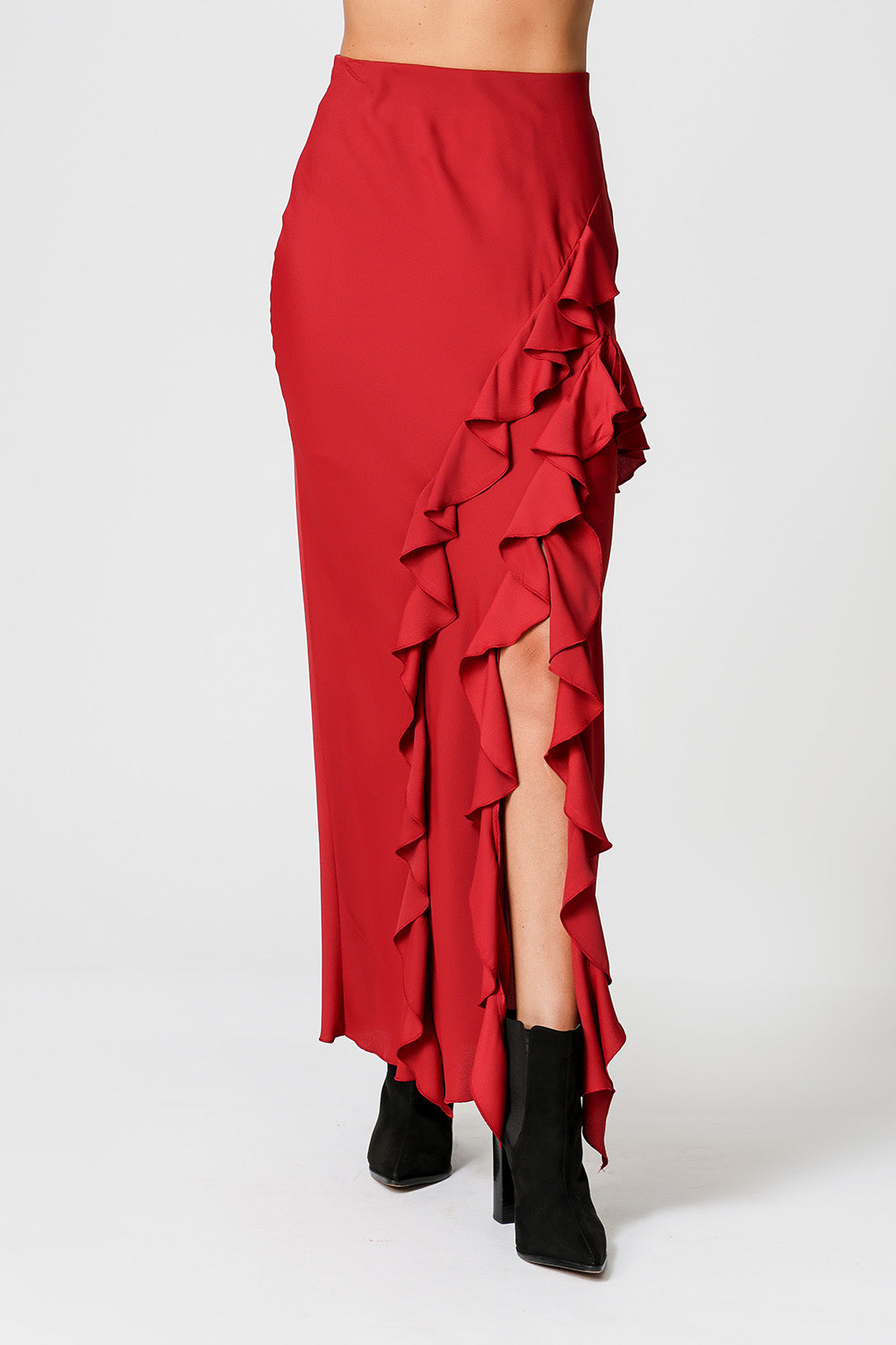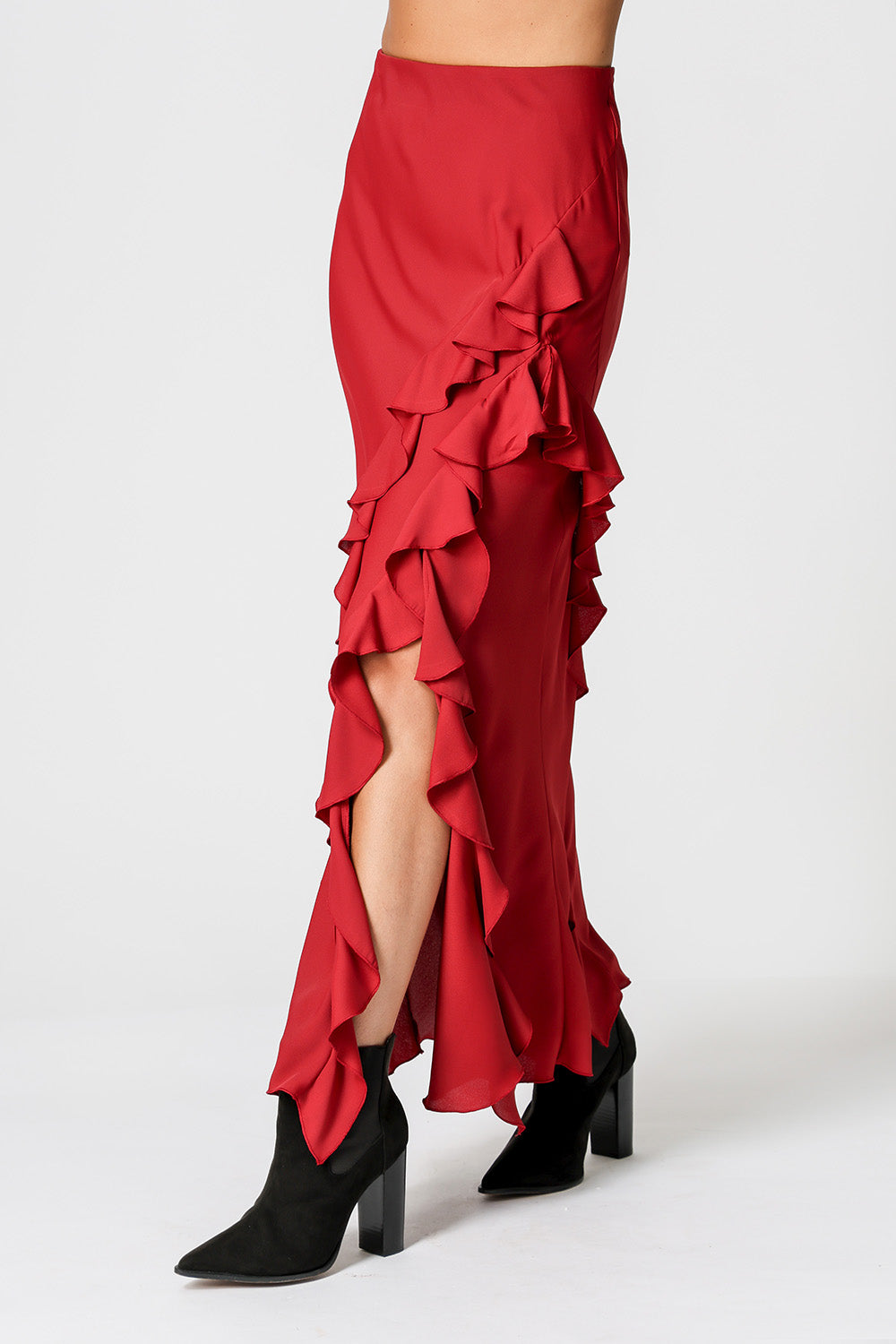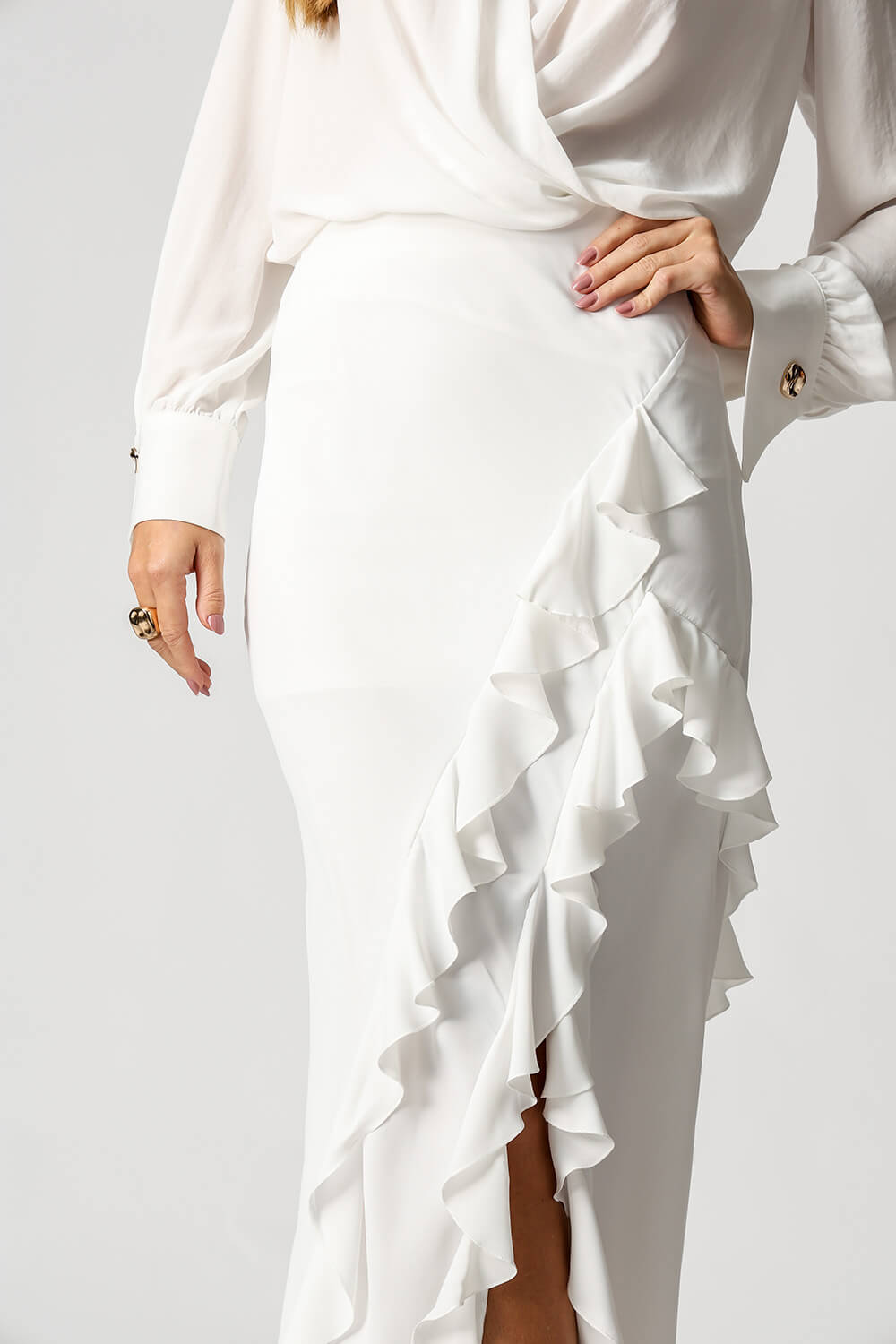 Saia longa com fenda frontal e babados. Peça elegante com muita informação de moda, aposte!