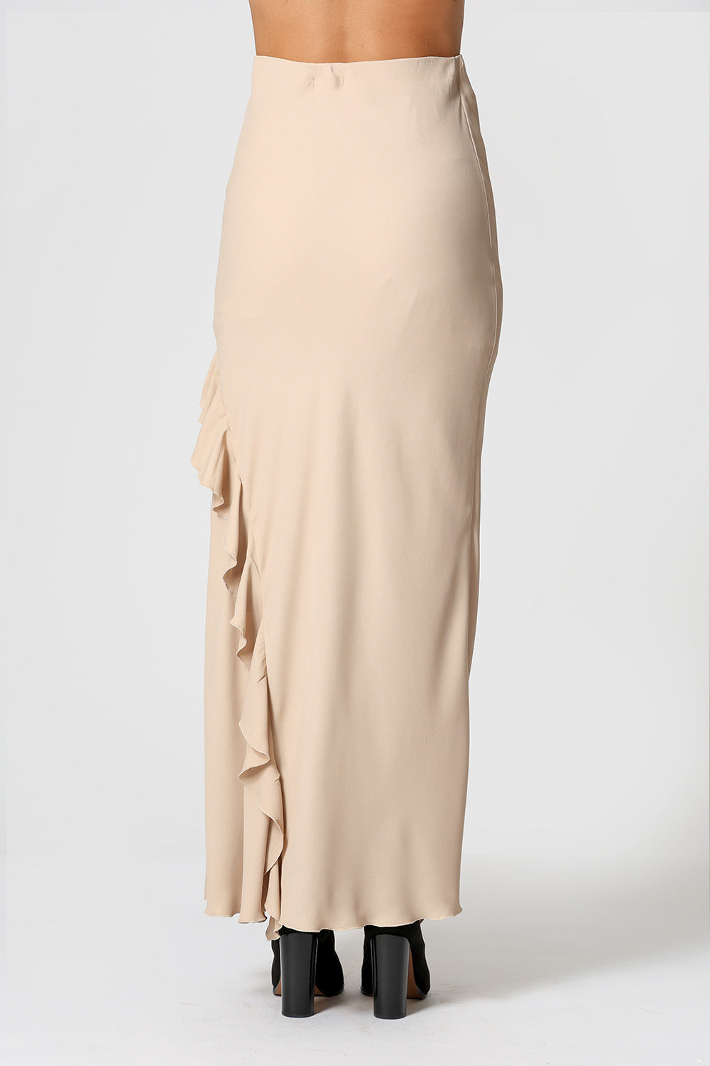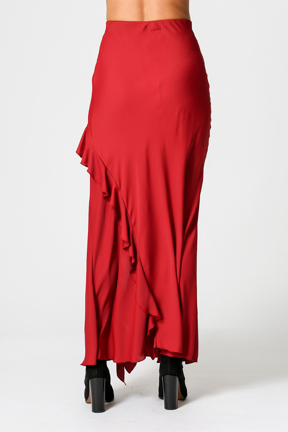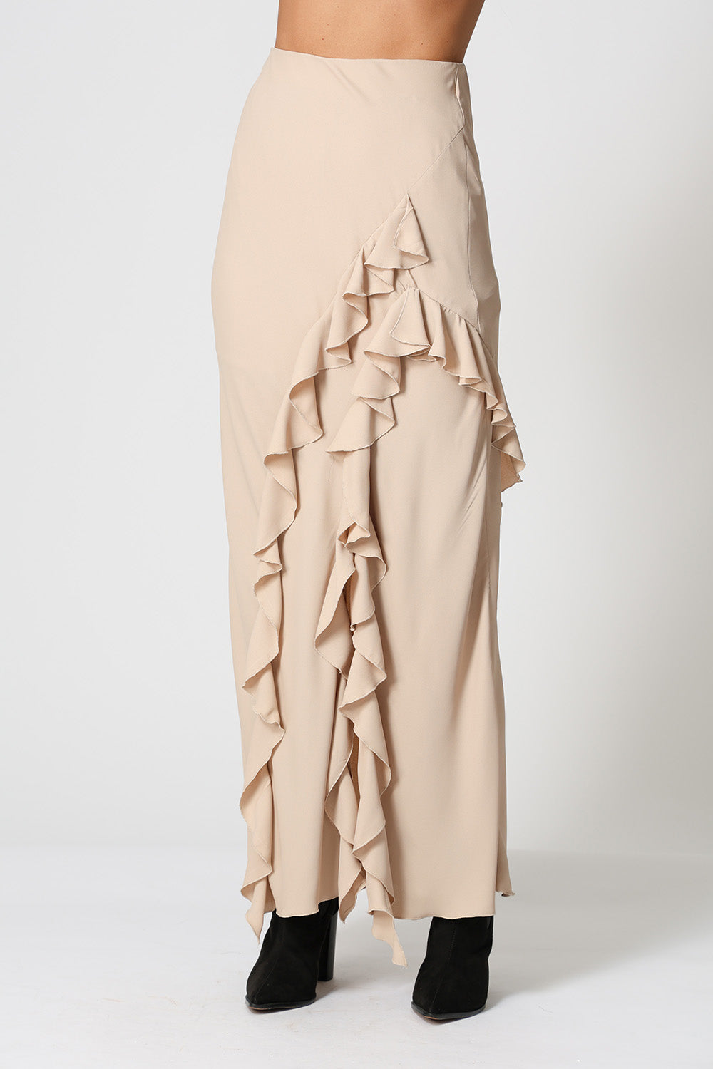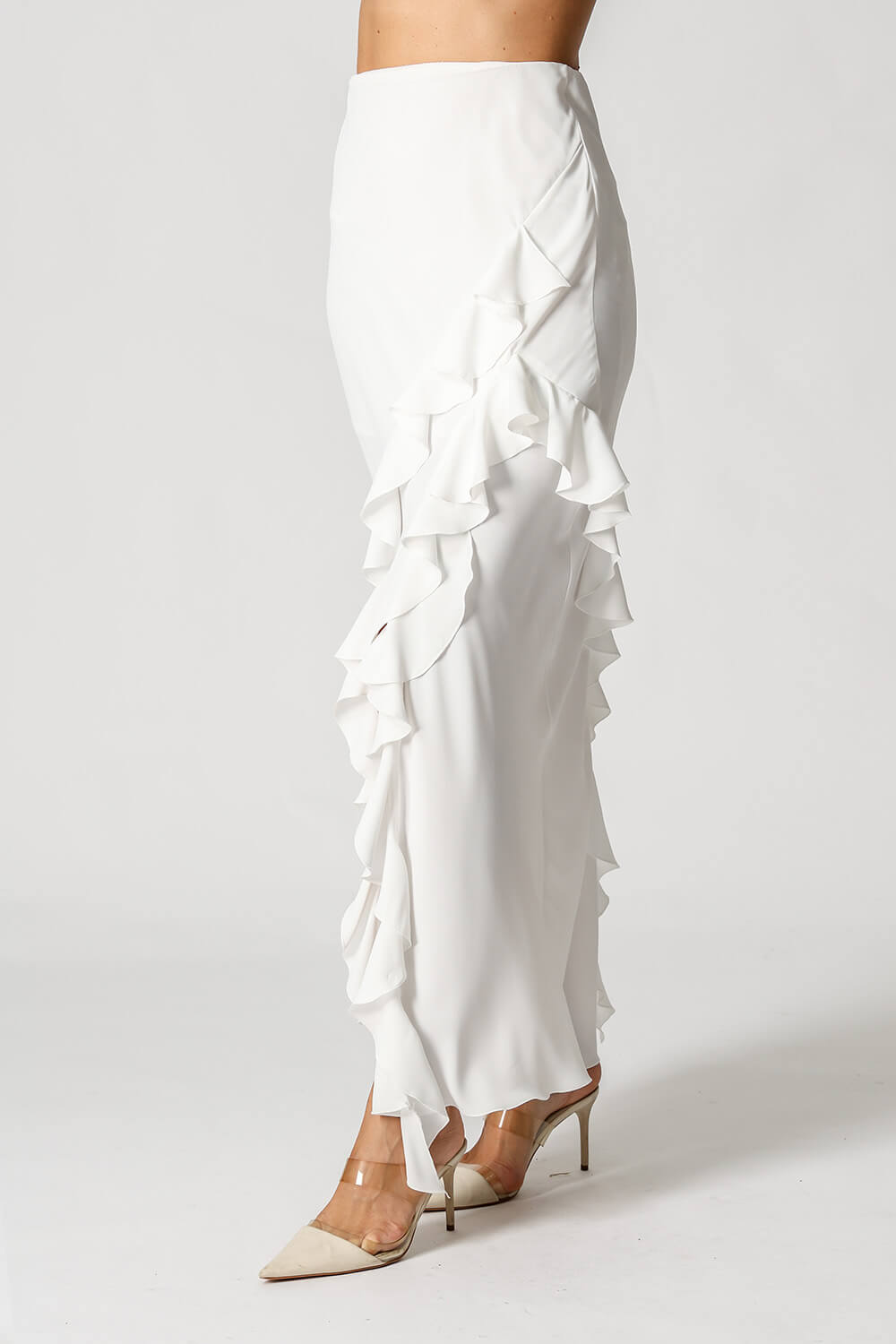 Saia longa com fenda frontal e babados. Peça elegante com muita informação de moda, aposte!