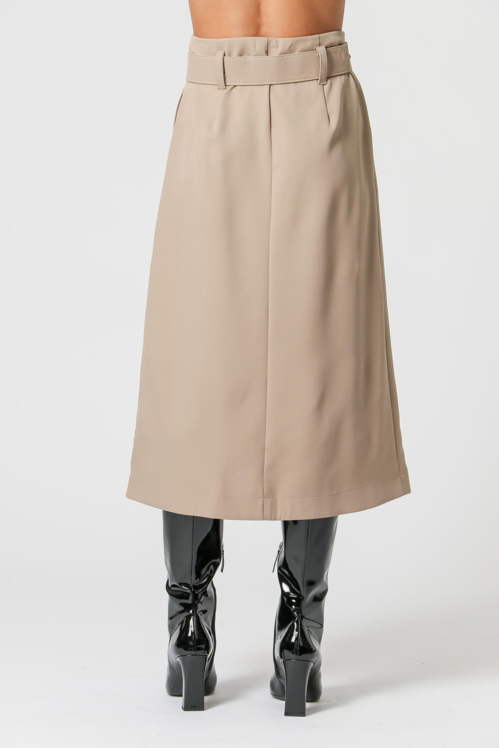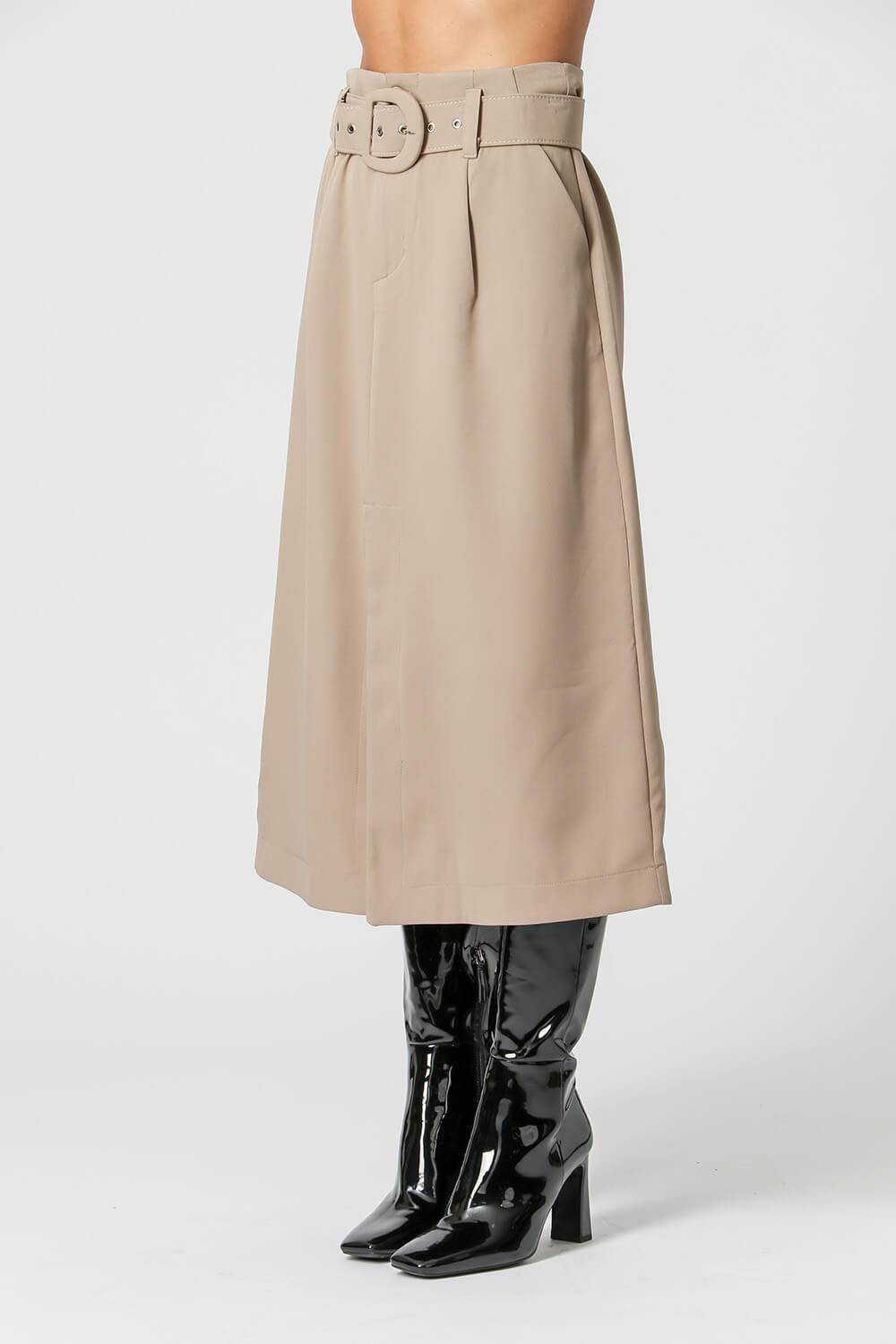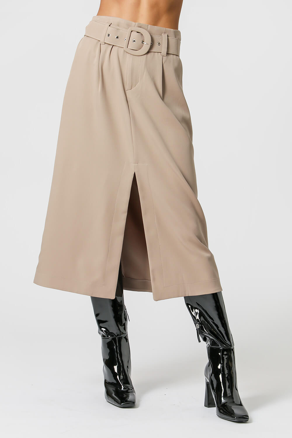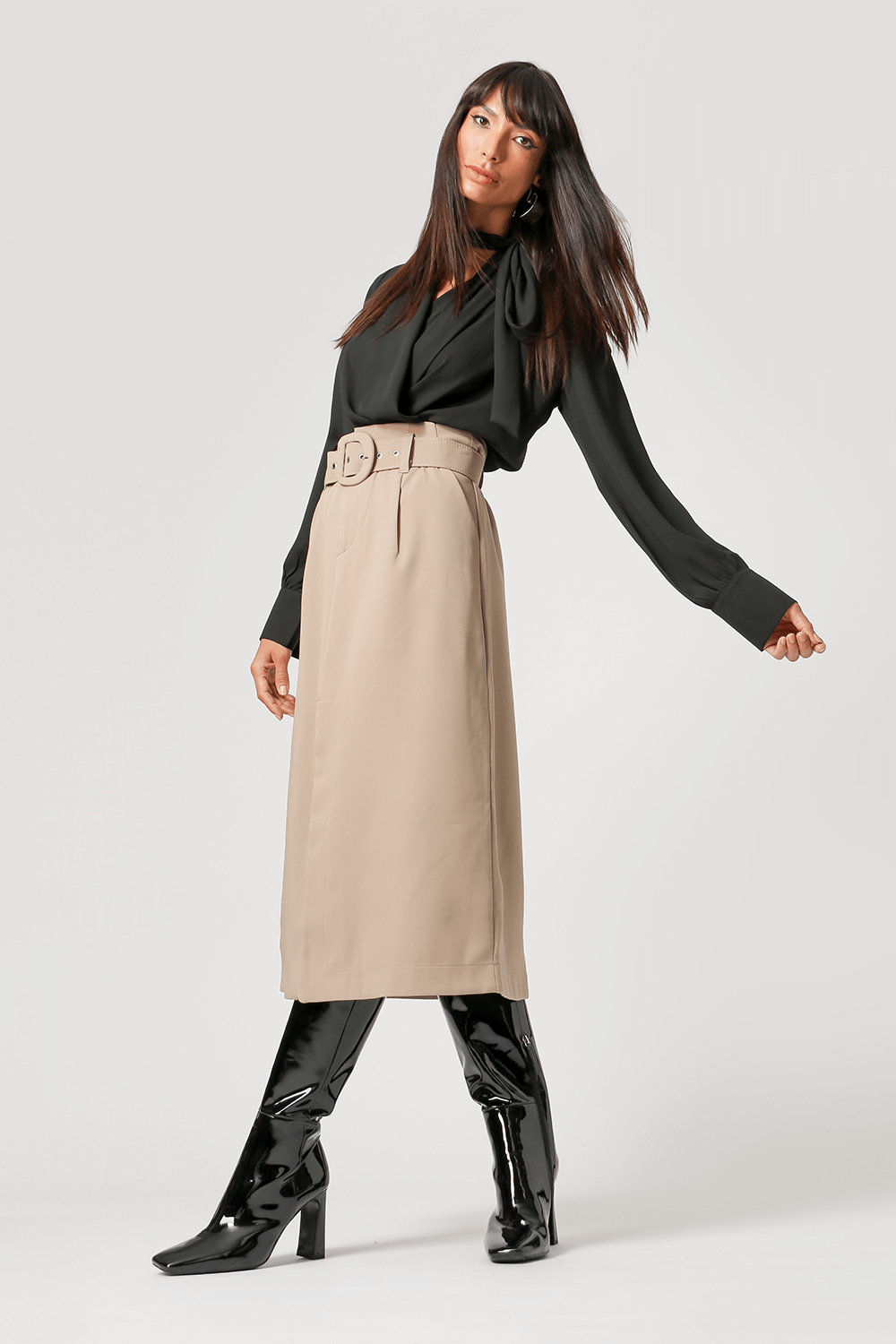Falda de largo largo. De corte holgado, abertura frontal y cinturilla clochard. Viene con un cinturón con hebilla. Pieza con un toque de elegancia, perfecta para looks potentes.