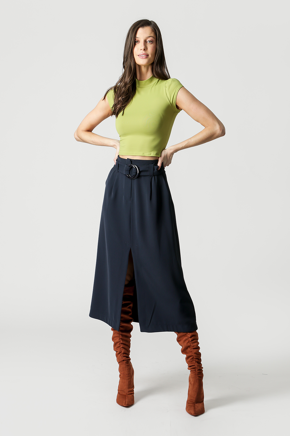 Falda de largo largo confeccionada en tejido de sarga. De corte holgado, abertura frontal y cinturilla clochard. Viene con un cinturón con hebilla. Pieza con un toque de elegancia, perfecta para looks potentes.