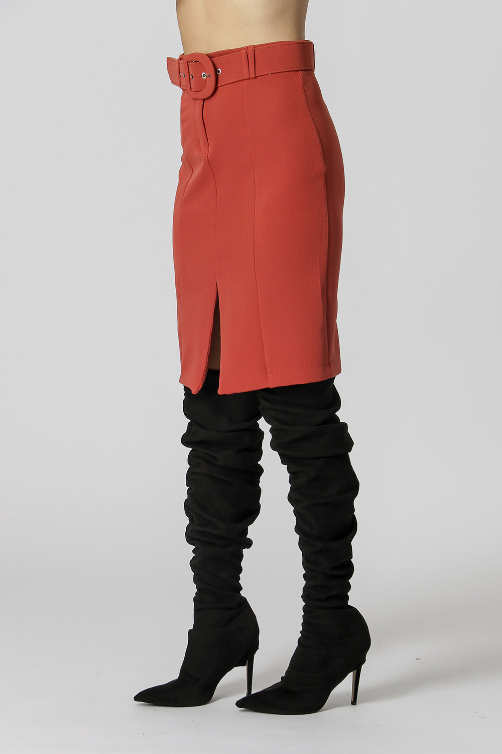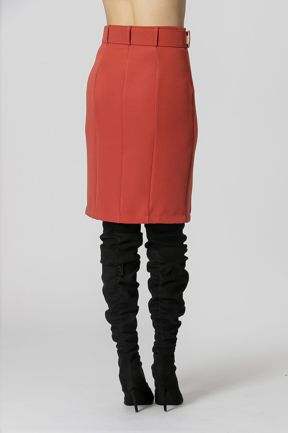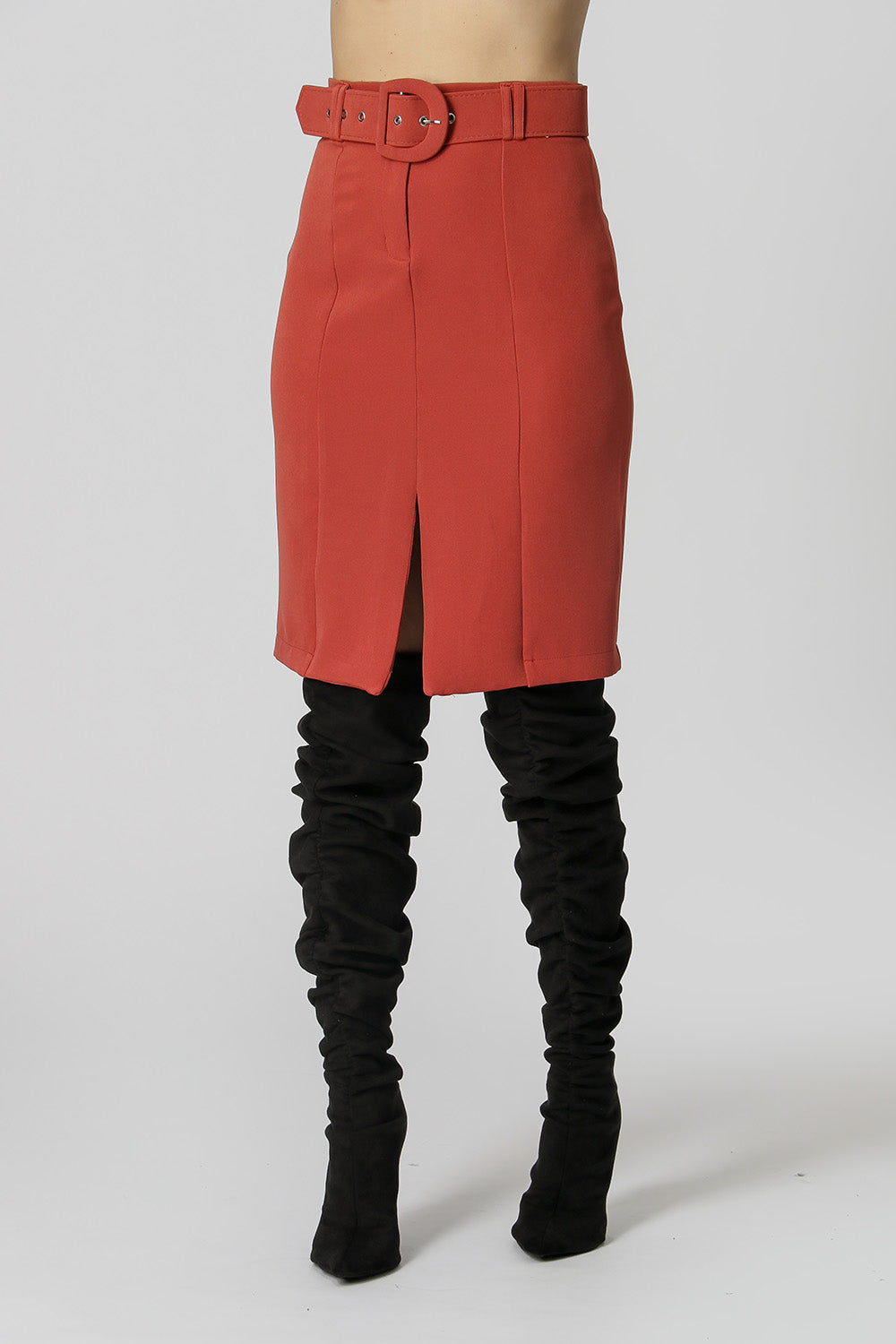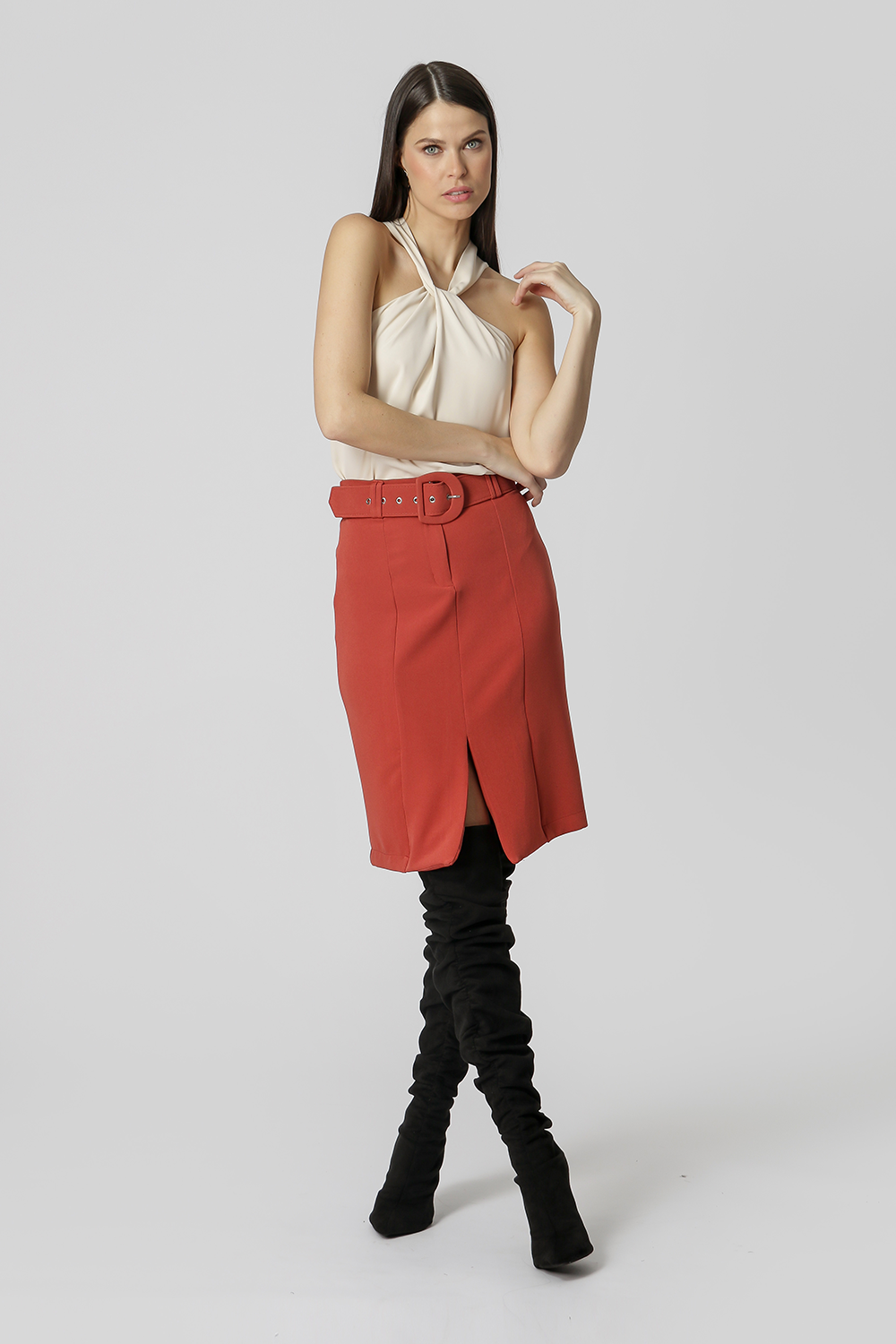 Falda entallada, más ajustada al cuerpo, con cortes y detalle de abertura frontal. Perfecto para crear looks de trabajo.