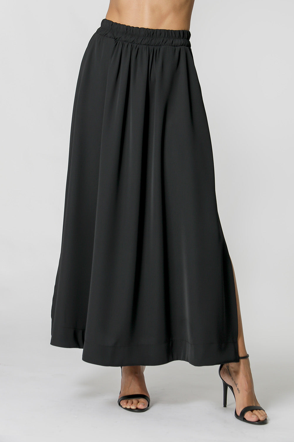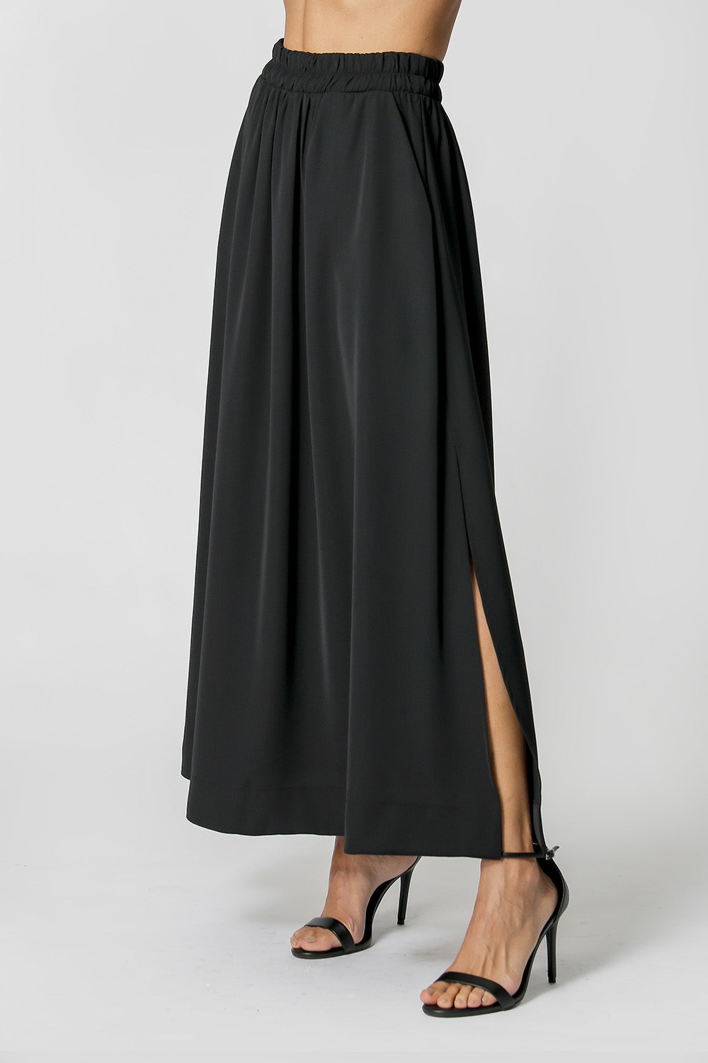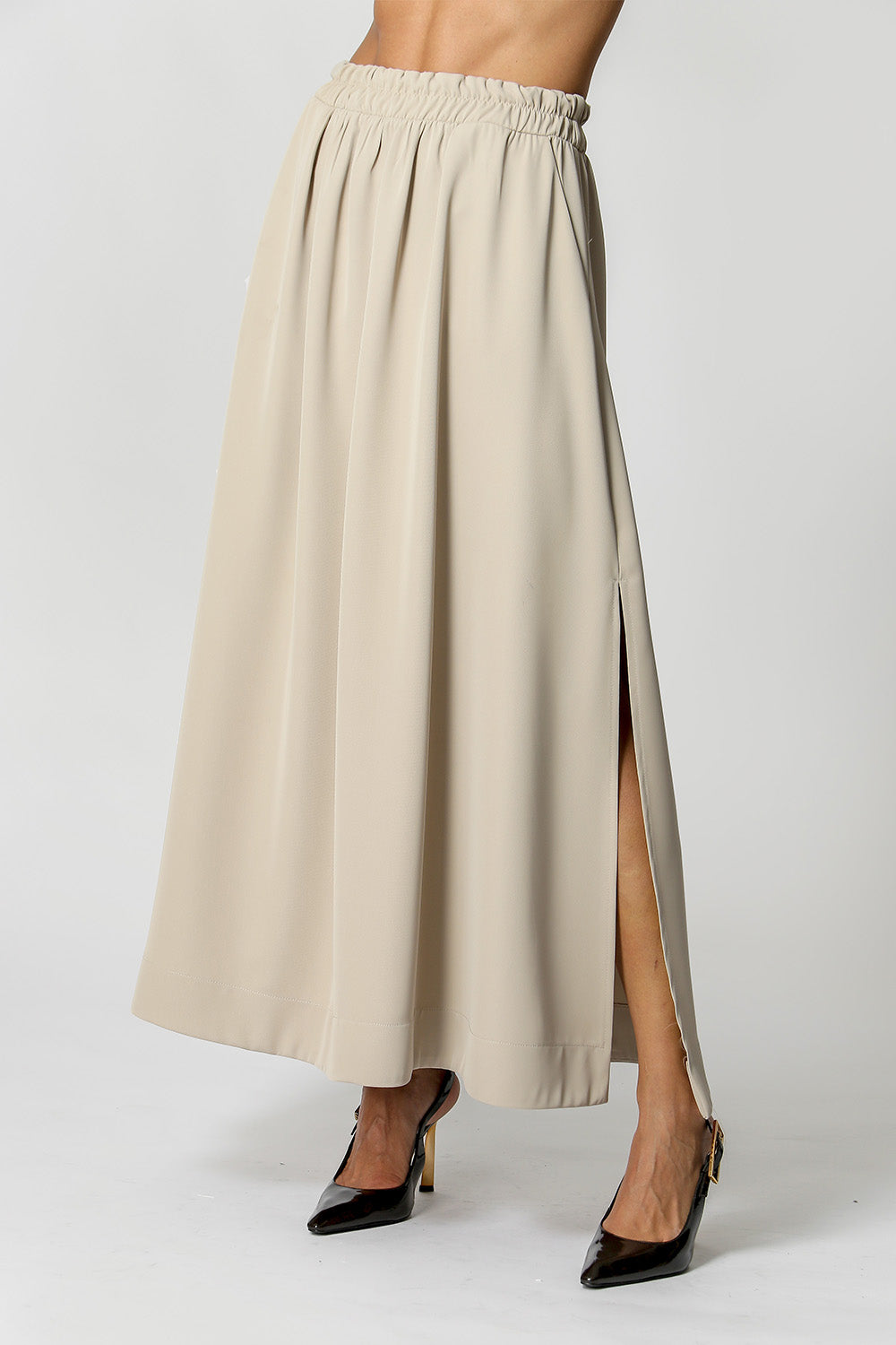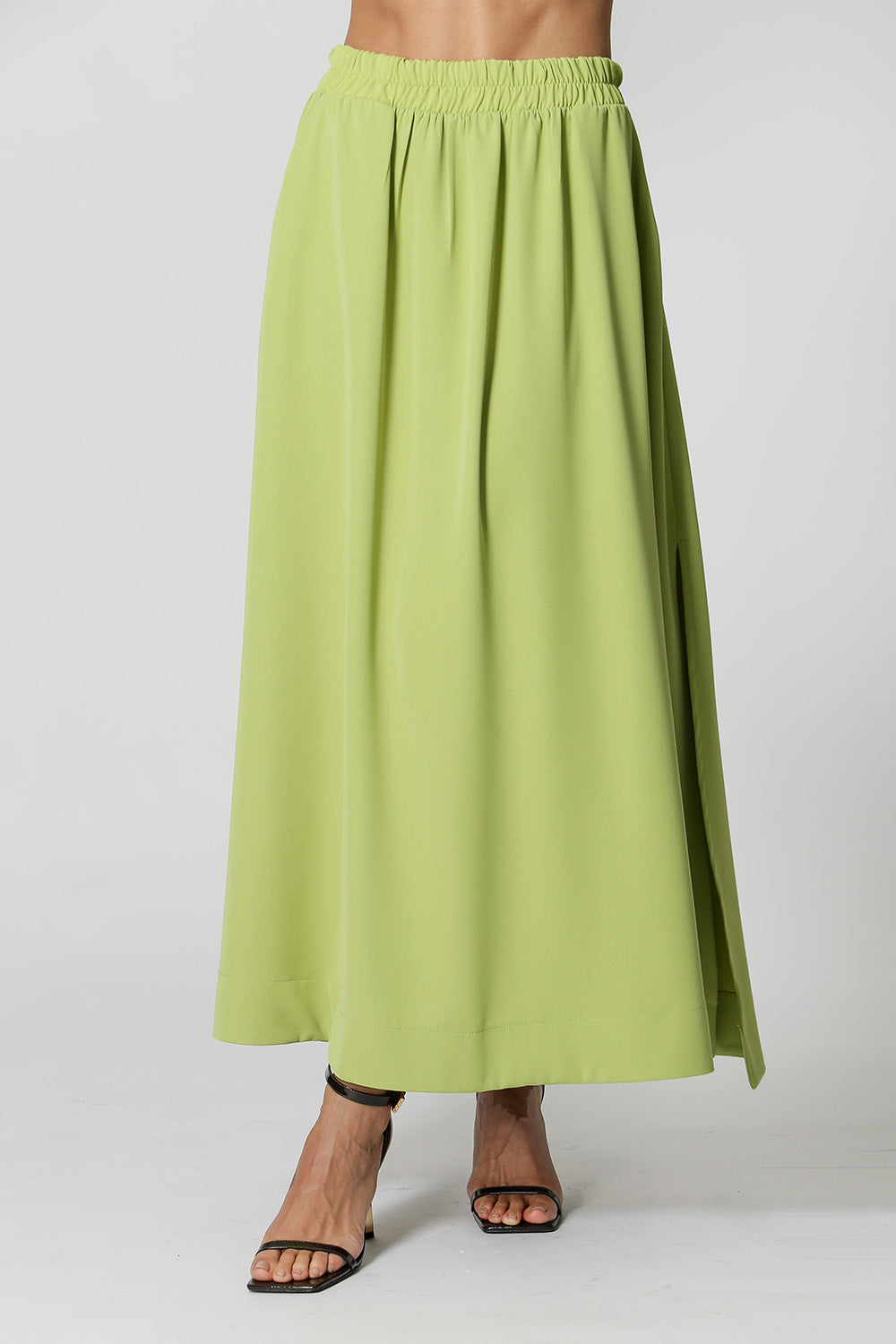 Saia média com fendas laterais e cós franzido. Modelo casual que permite montar diversos looks.