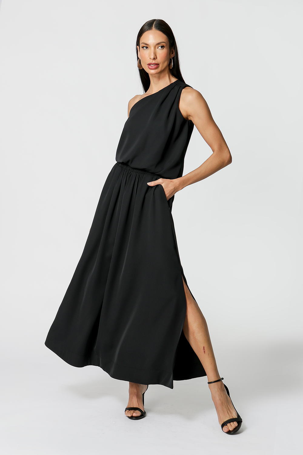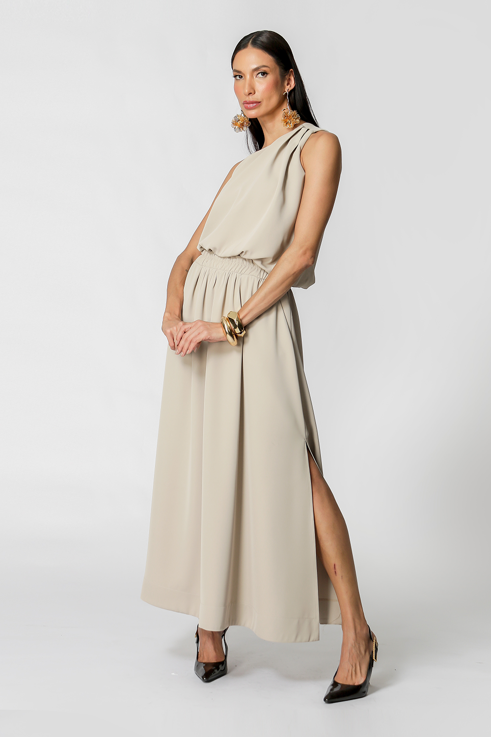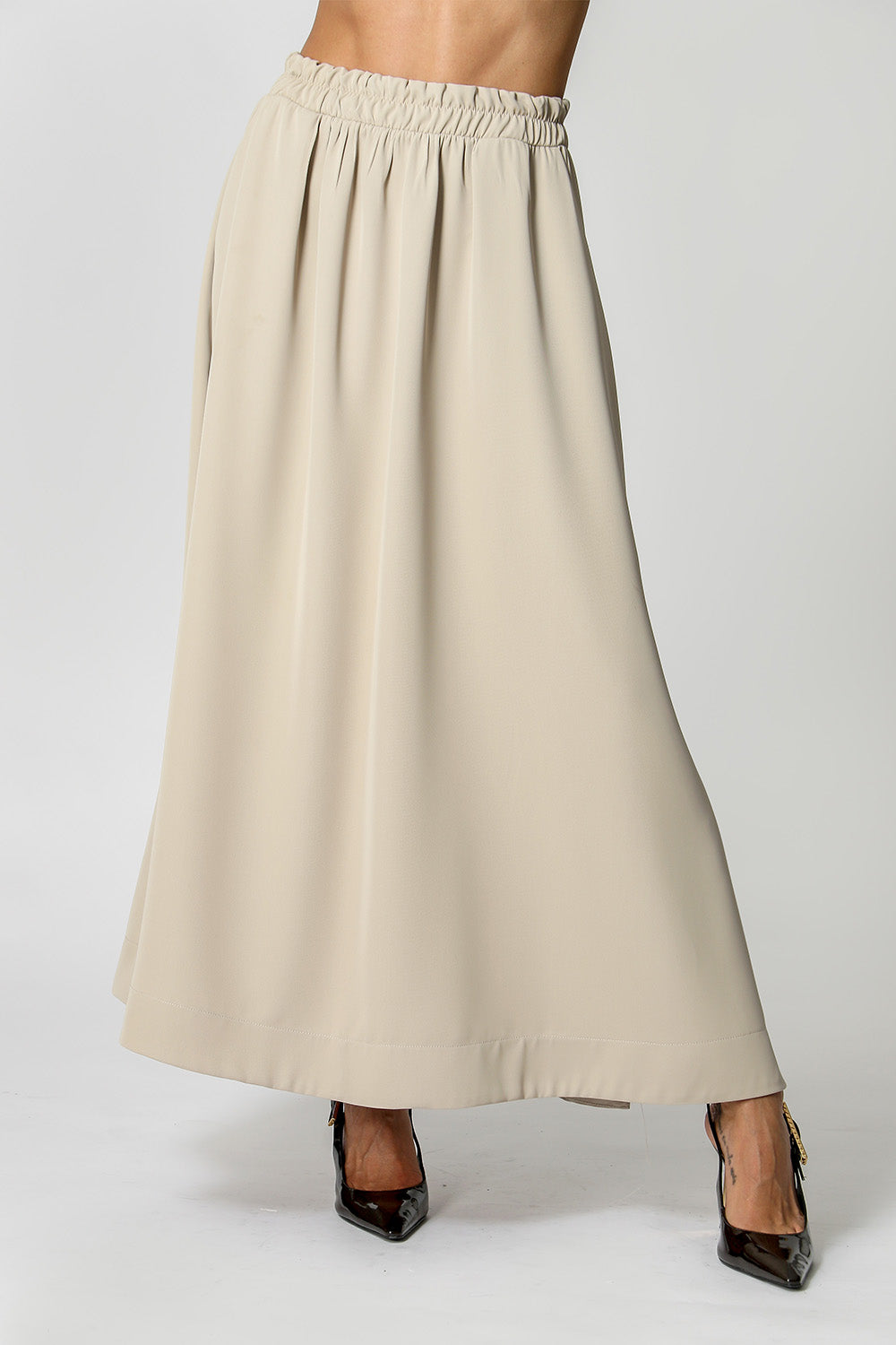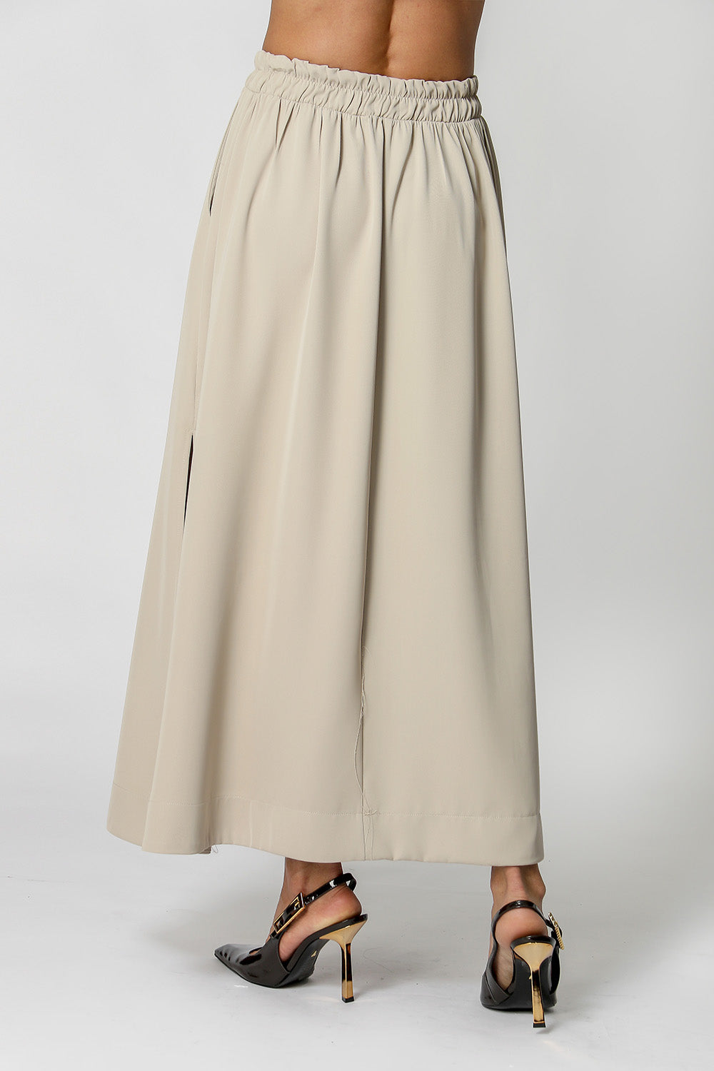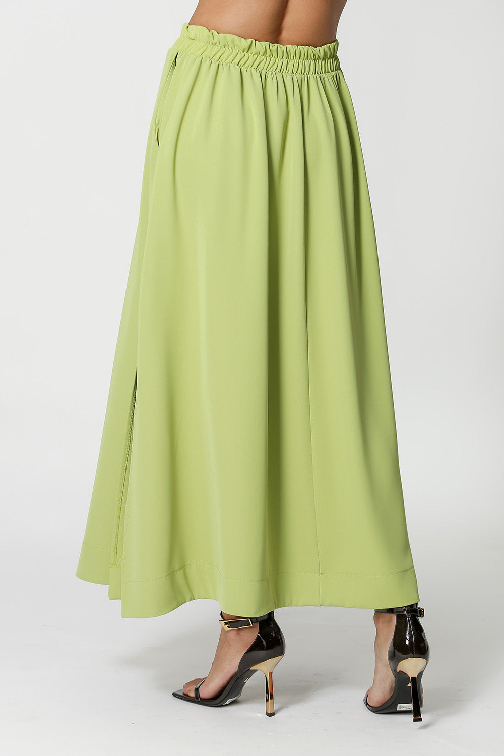 Saia média com fendas laterais e cós franzido. Modelo casual que permite montar diversos looks.