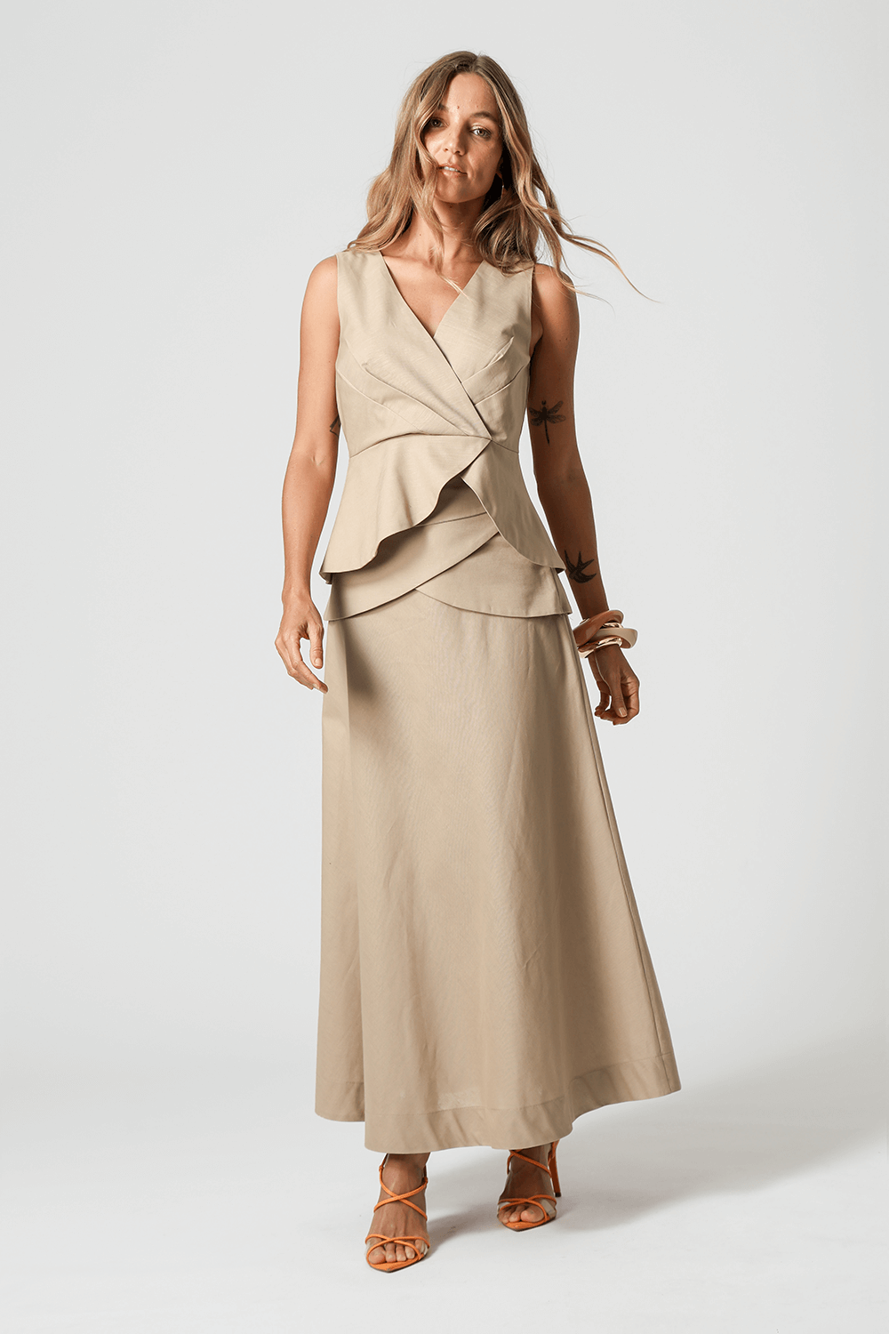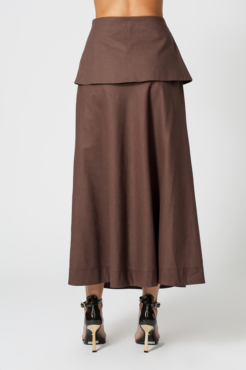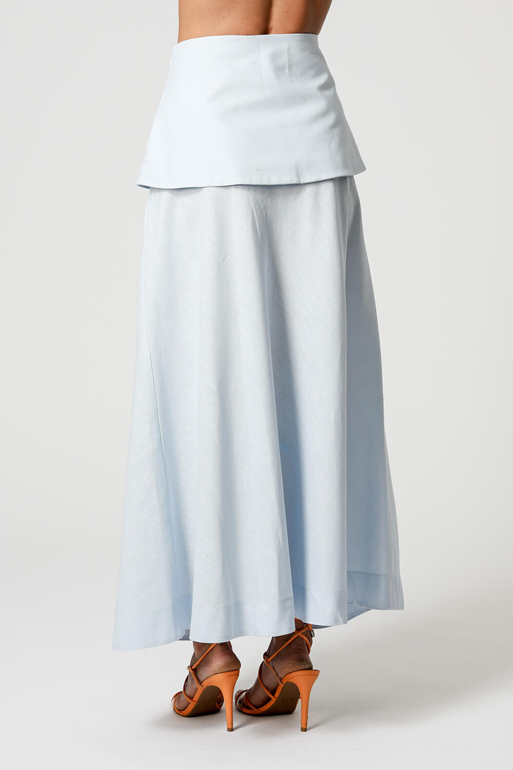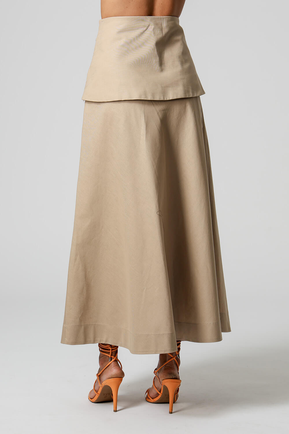 Saia em tecido de algodão com detalhe de três palas sobrepostas, trazendo textura e movimento ao visual. Leve, versátil e cheia de estilo.