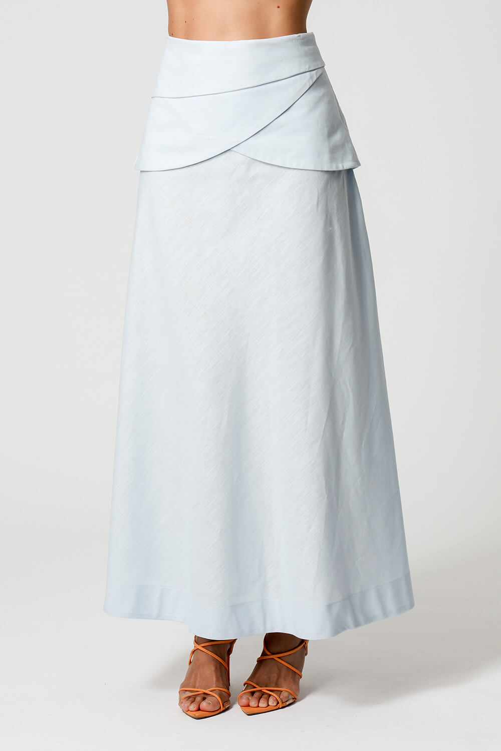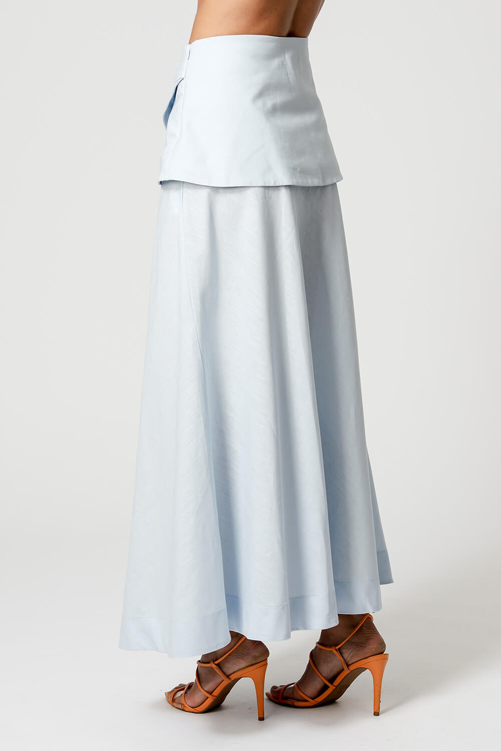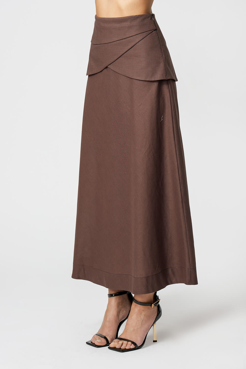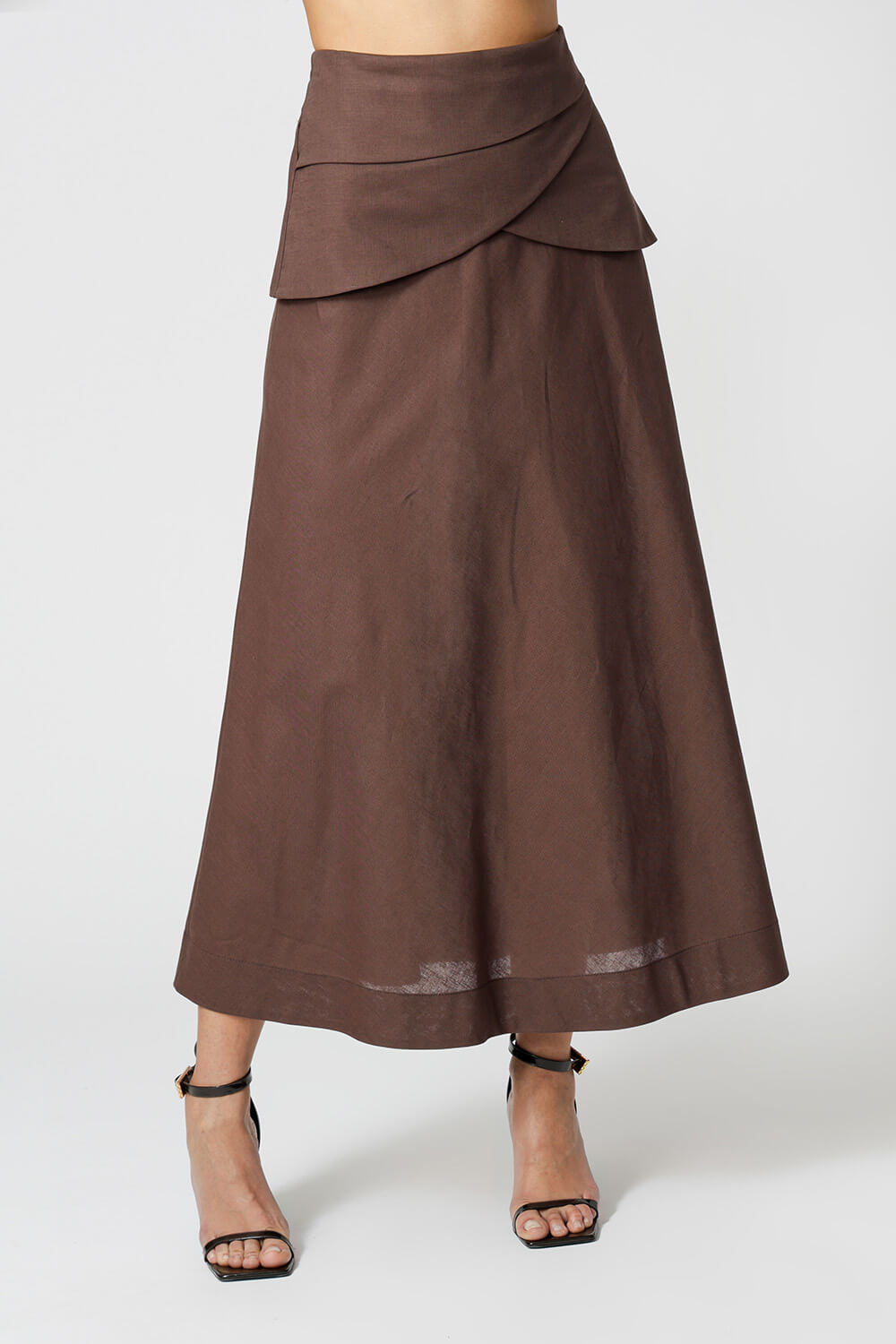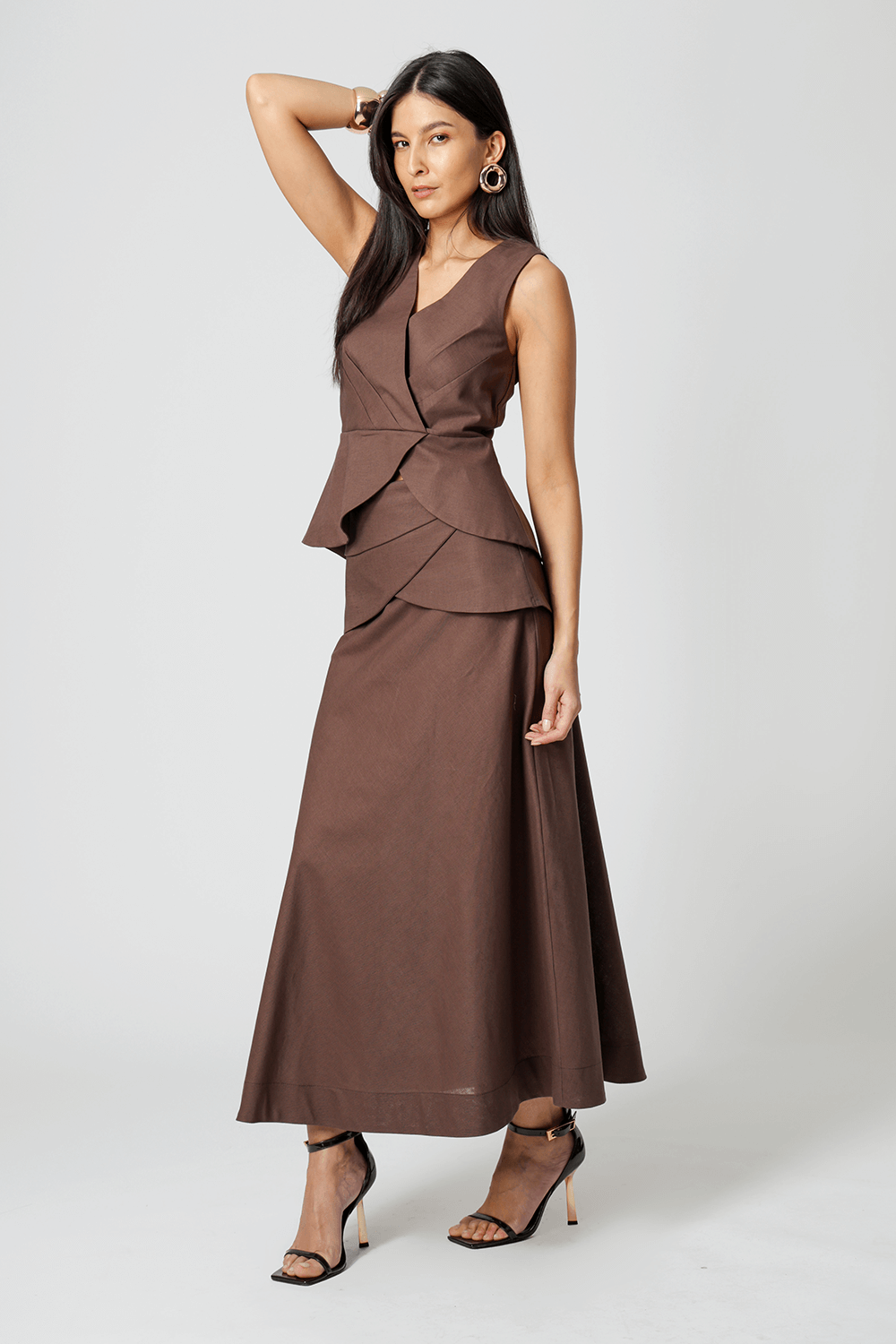 Saia em tecido de algodão com detalhe de três palas sobrepostas, trazendo textura e movimento ao visual. Leve, versátil e cheia de estilo.