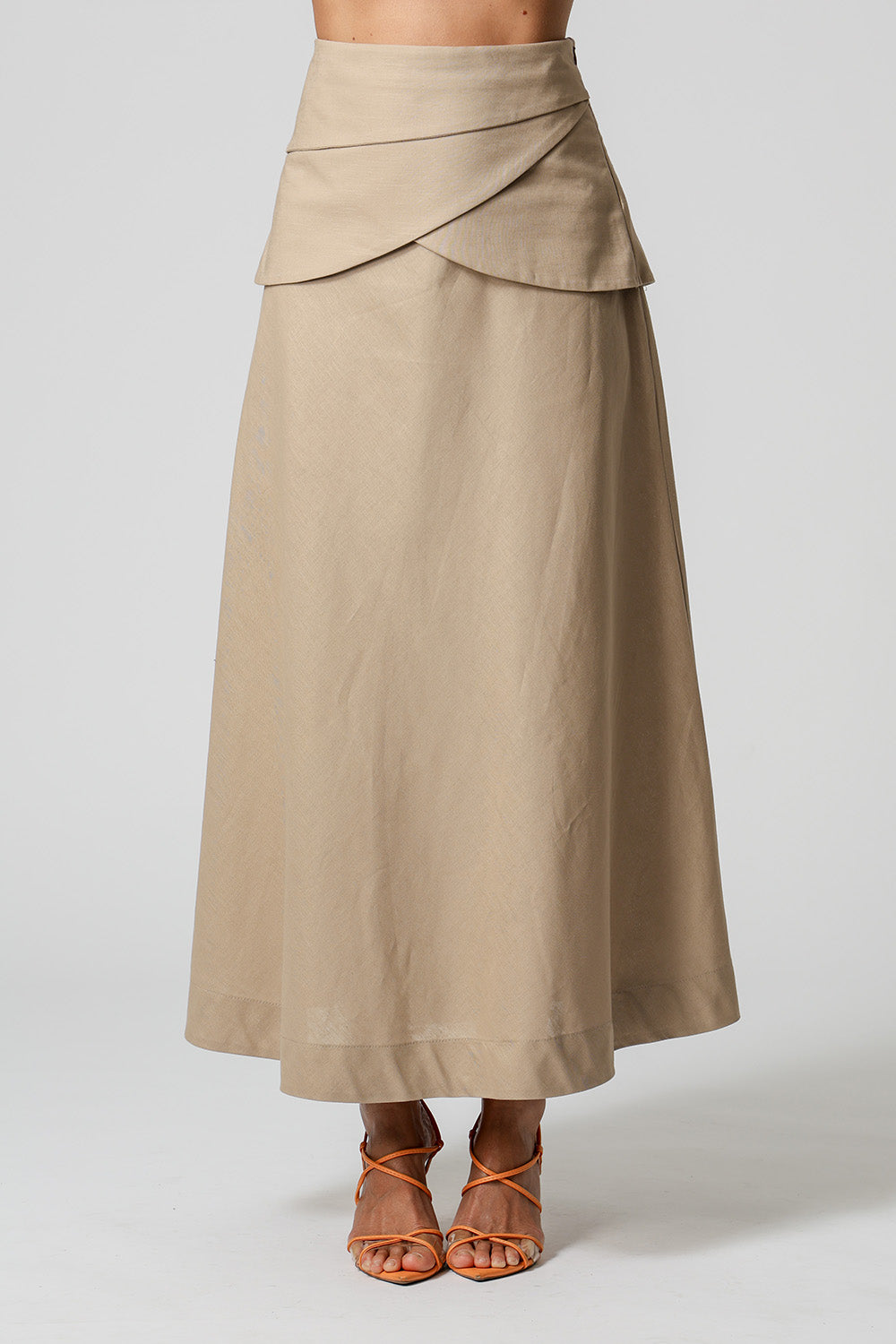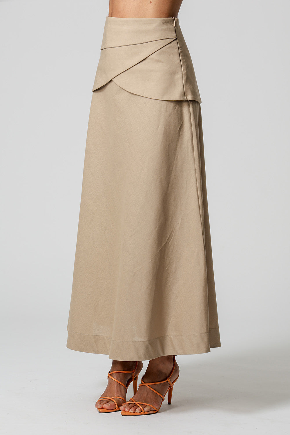 Saia em tecido de algodão com detalhe de três palas sobrepostas, trazendo textura e movimento ao visual. Leve, versátil e cheia de estilo.