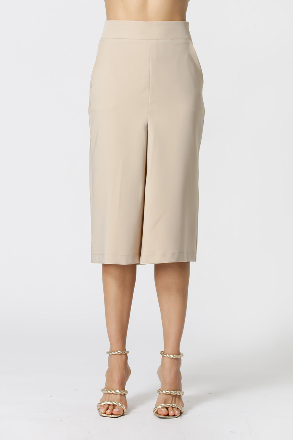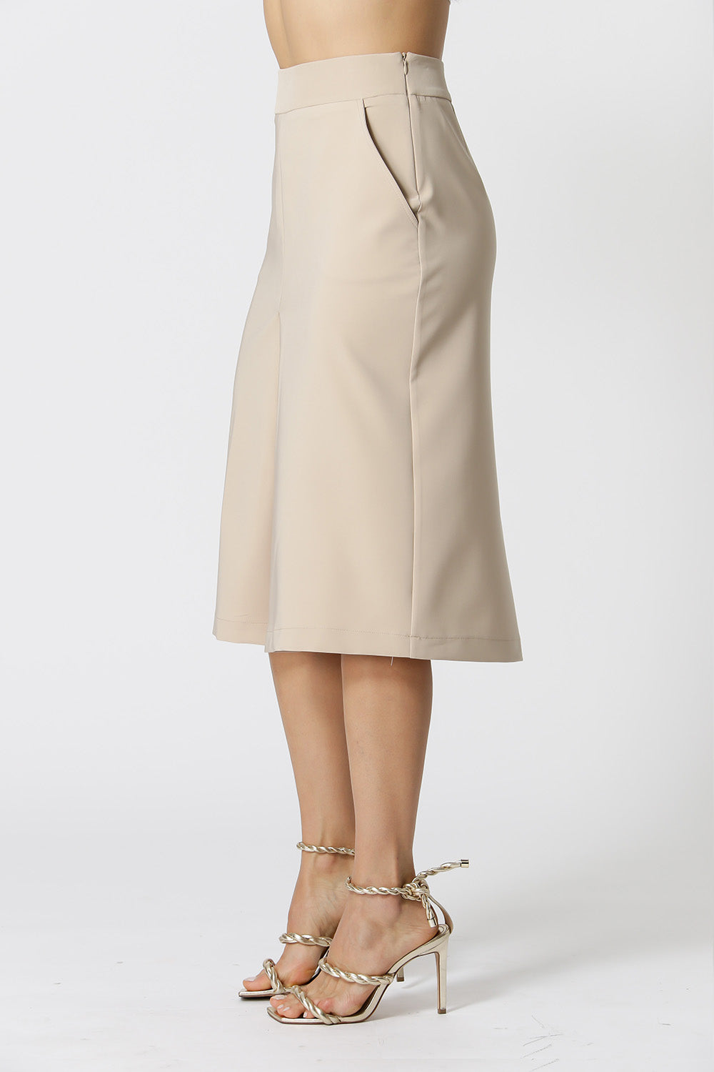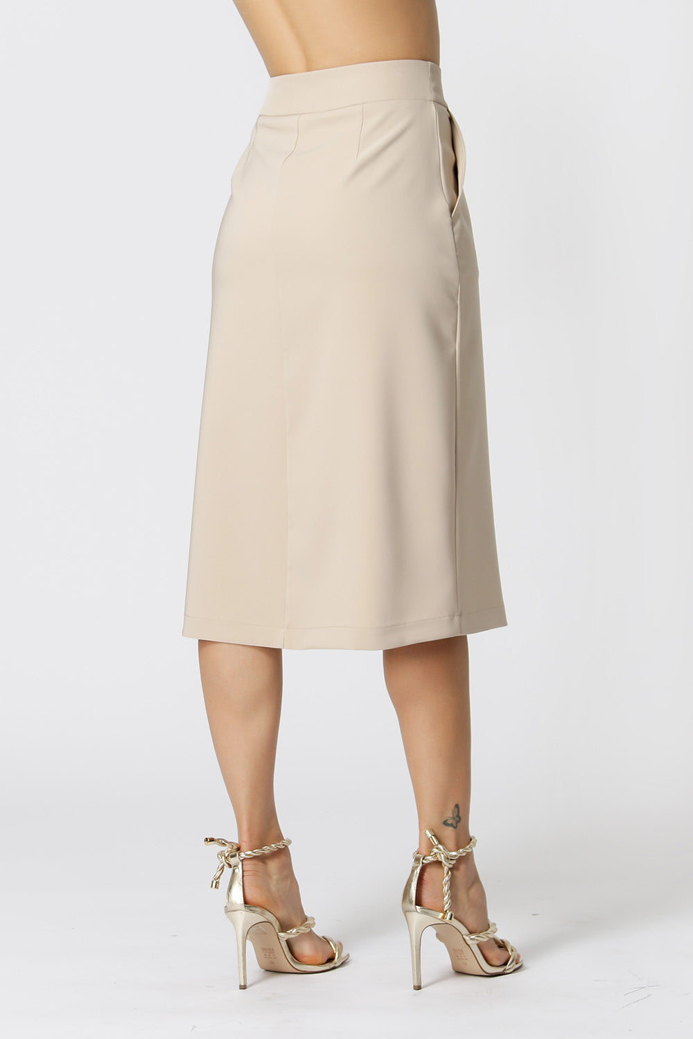 Falda con pliegues y cremallera invisible en el lateral. Pieza confeccionada en tejido sastre. Un modelo muy elegante para crear diferentes looks de trabajo.
