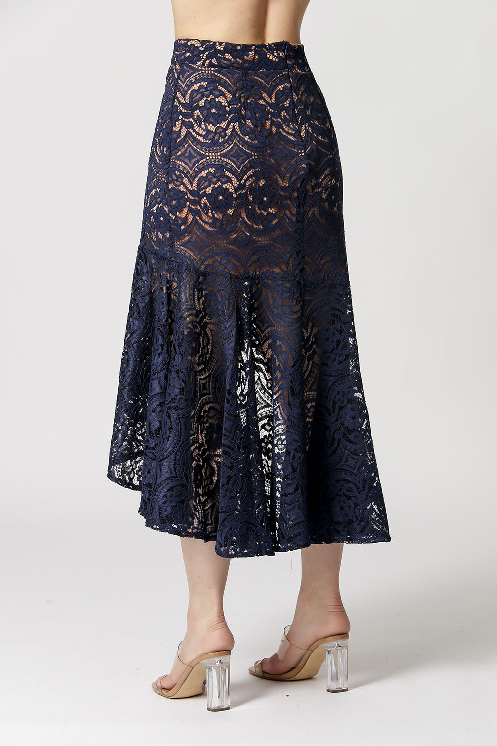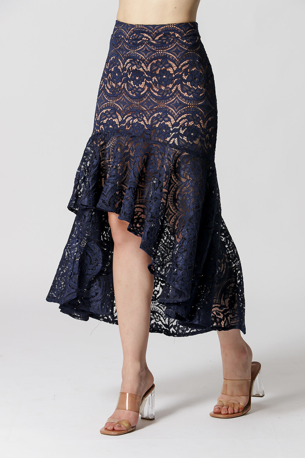 Saia de comprimento midi, modelagem assimétrica com babados e revestida com renda. Modelo que mescla delicadeza e romantismo na medida certa.