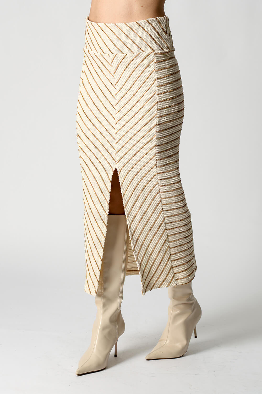 A Saia de Tricot Listrado é uma peça versátil e estilosa, com cós largo que proporciona ótimo ajuste e uma fenda frontal que traz leveza e movimento ao visual. O padrão listrado adiciona um toque moderno, tornando-a ideal para composições casuais ou mais elegantes.