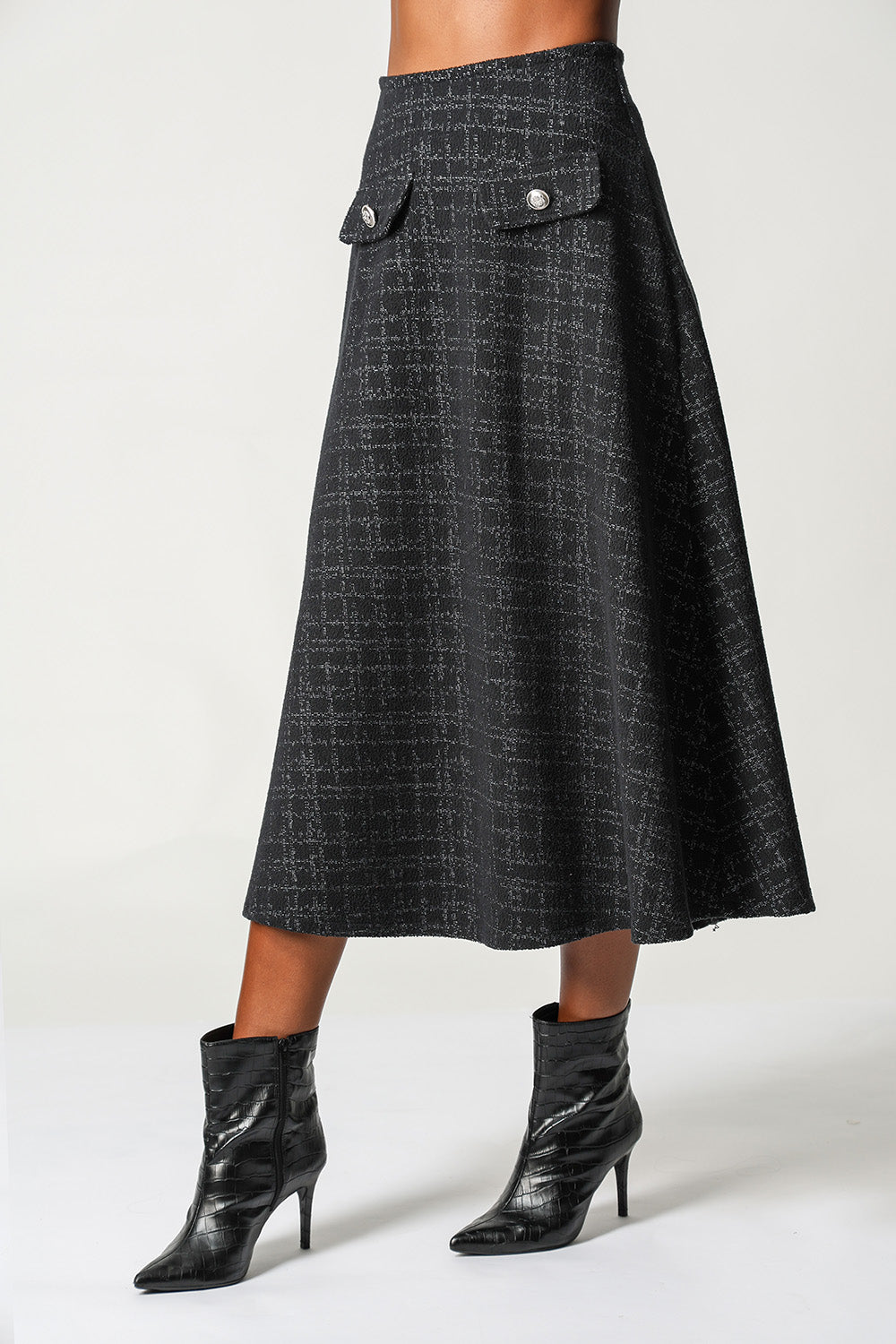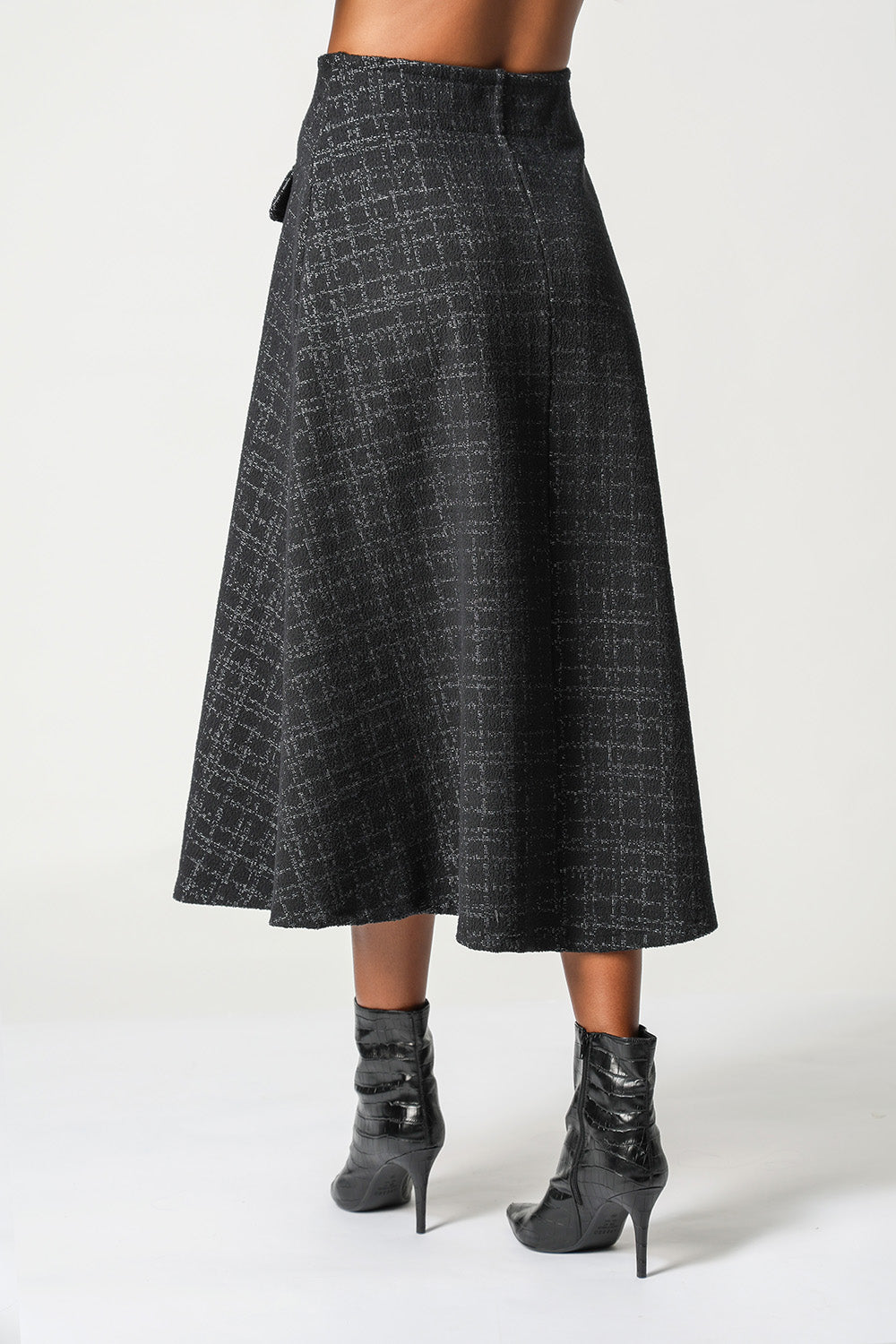 Falda de tweed, combina elegancia y sofisticación con un toque moderno. Proporciona un ajuste fluido y cómodo. Ideal para crear looks sofisticados y versátiles, es perfecto para una variedad de ocasiones, desde eventos más formales hasta momentos relajados con un toque de clase.
