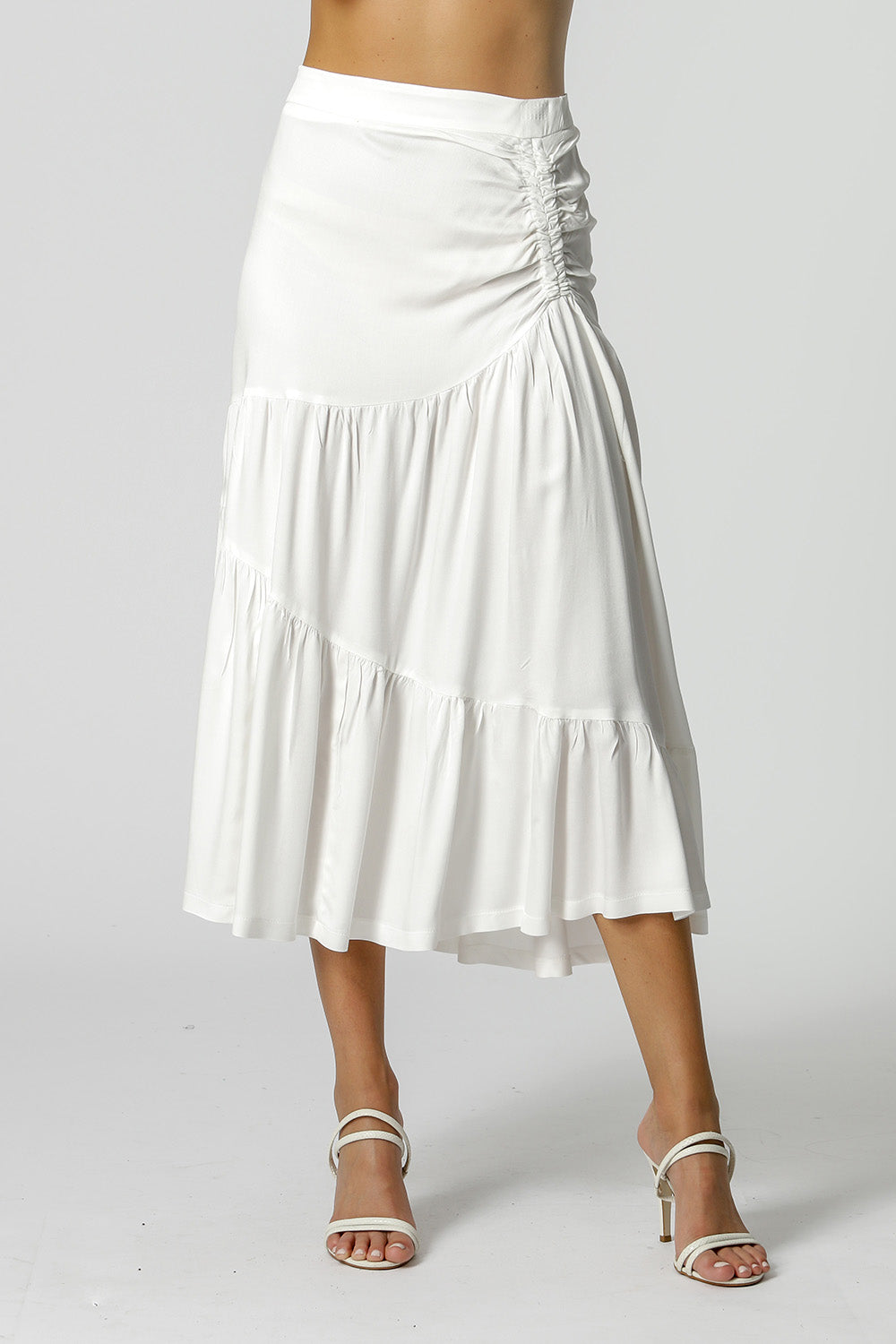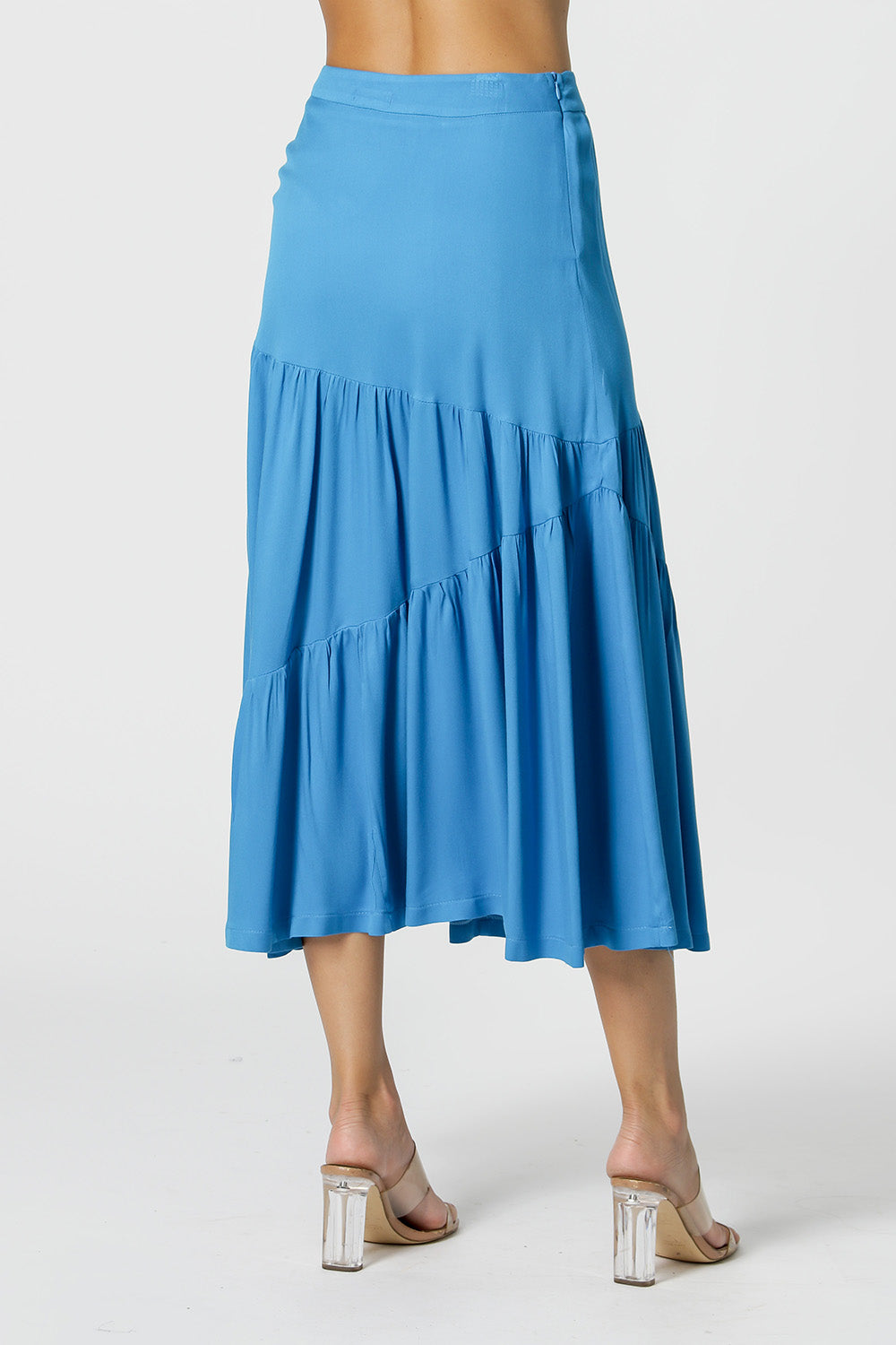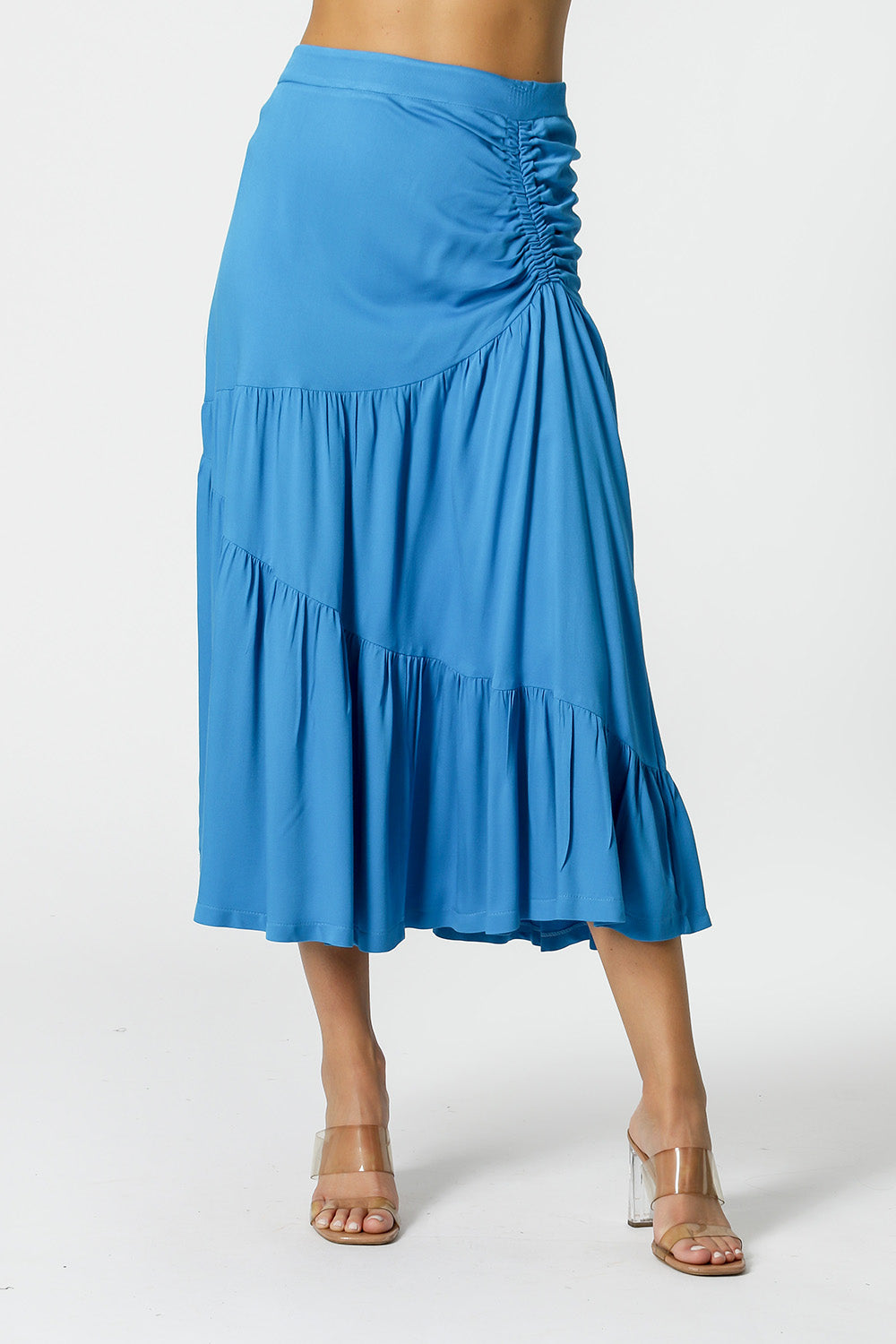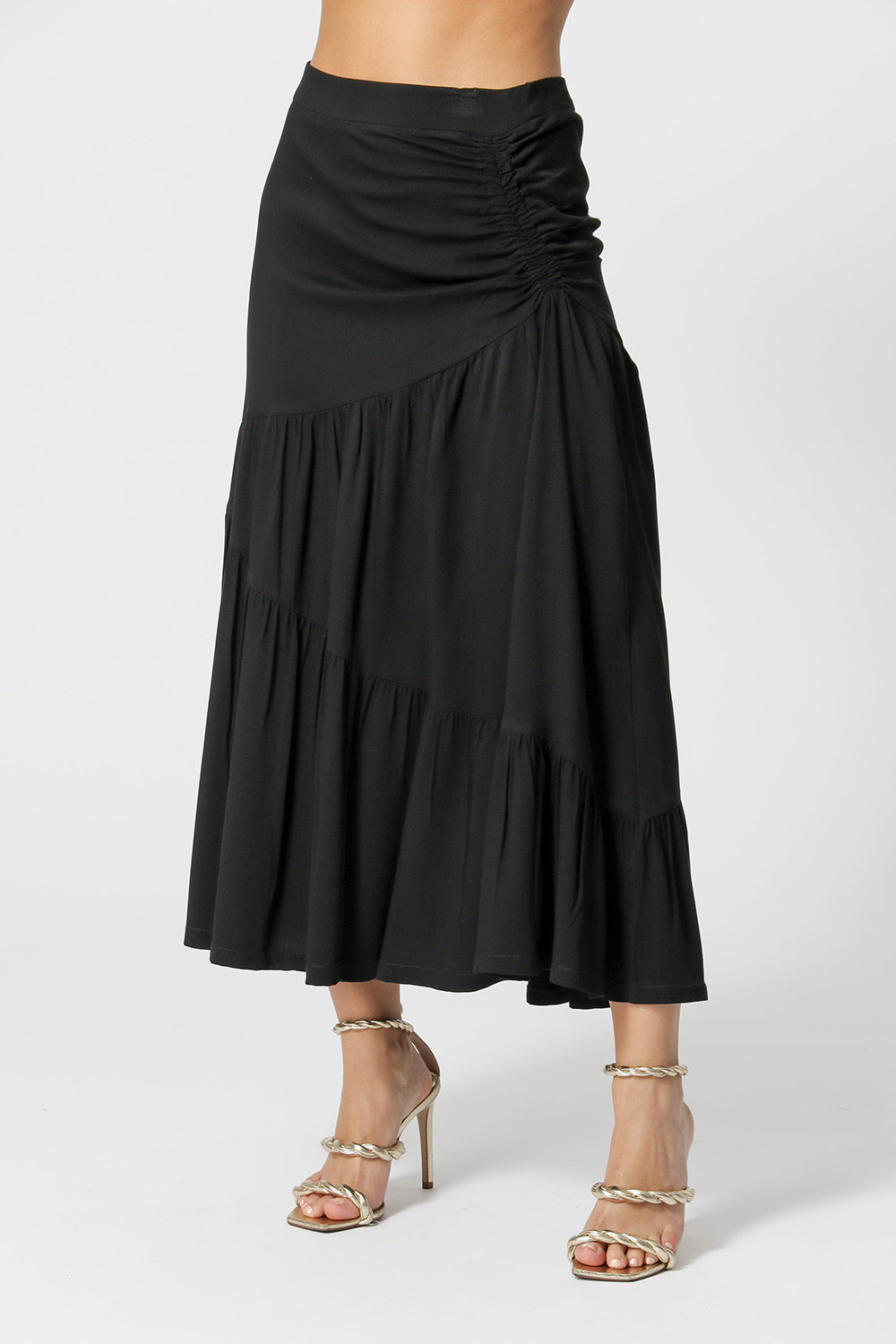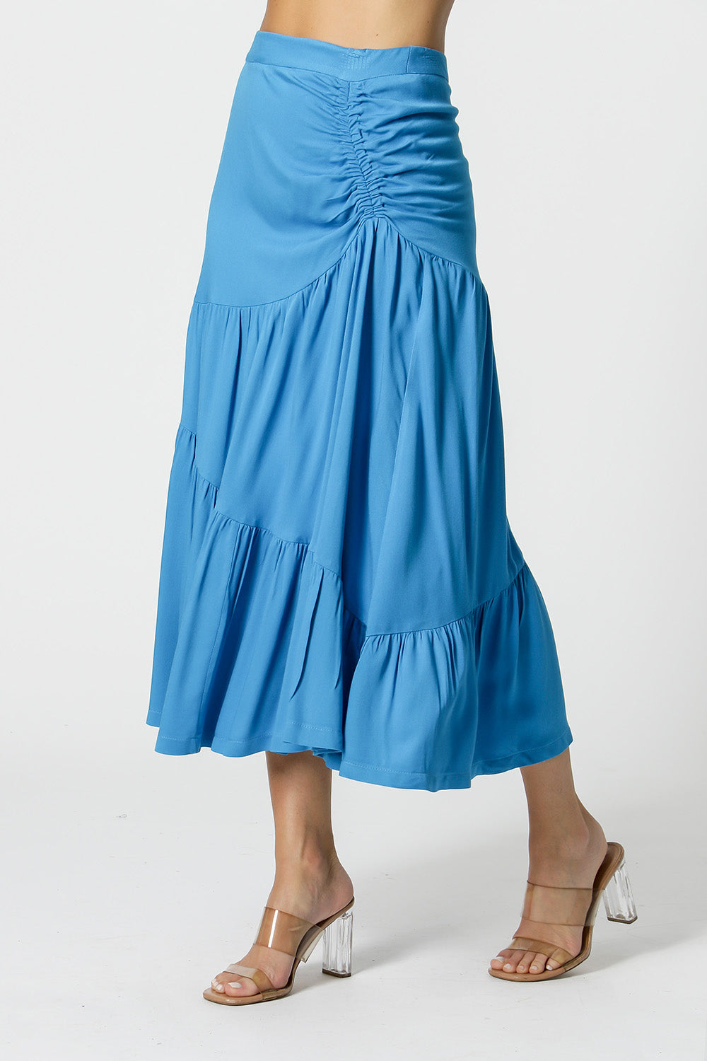 Saia com detalhe de franzido e colissê. Um modelo confeccionada em tecido Viscose fluída. Uma peça com caimento leve solto e cheia de charme que vai te proporcionar vários looks lindo aposte.