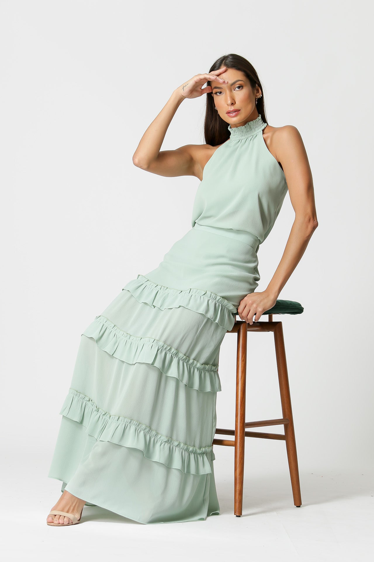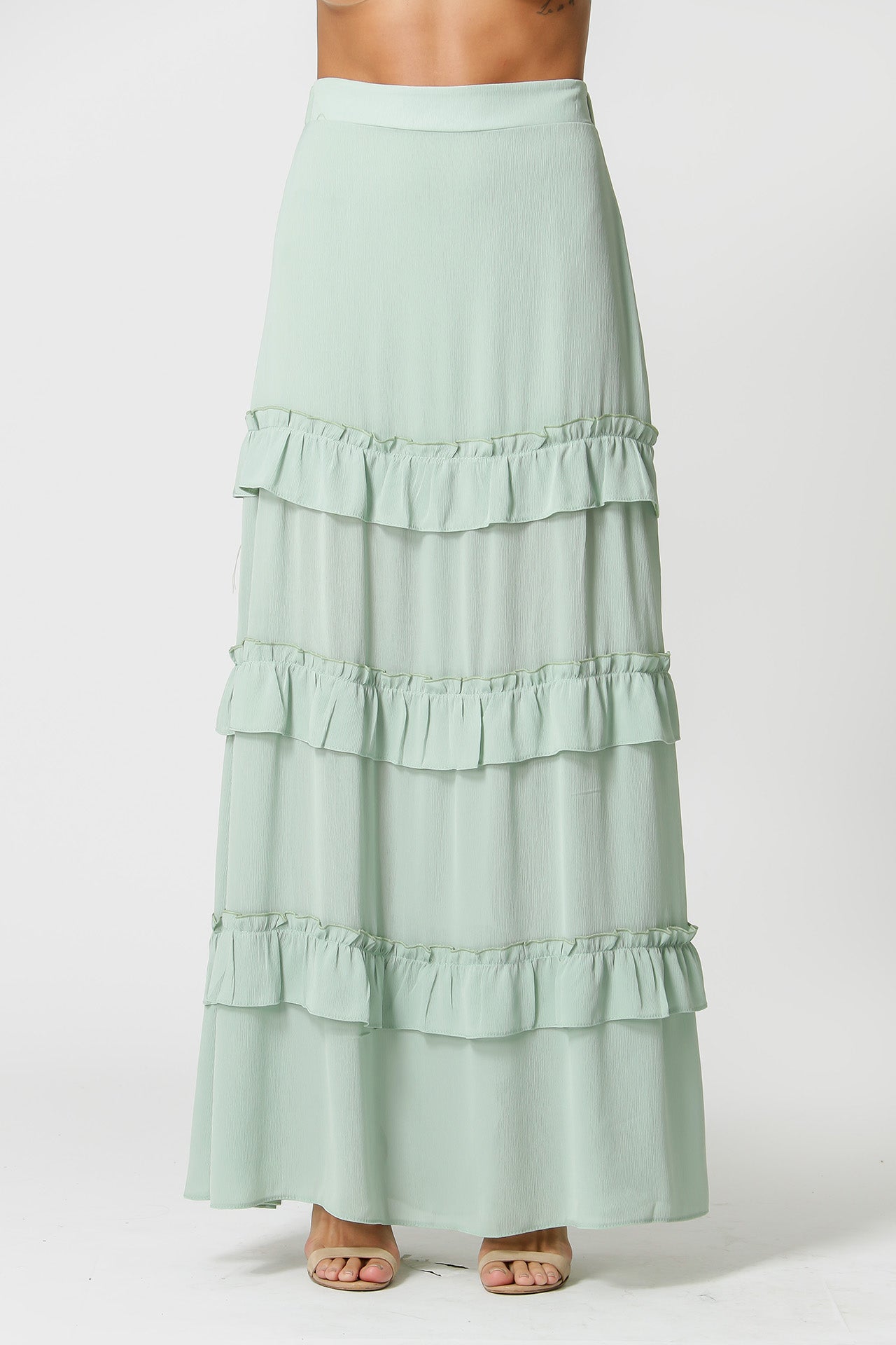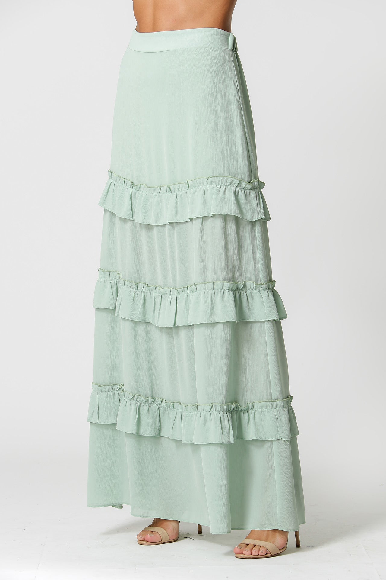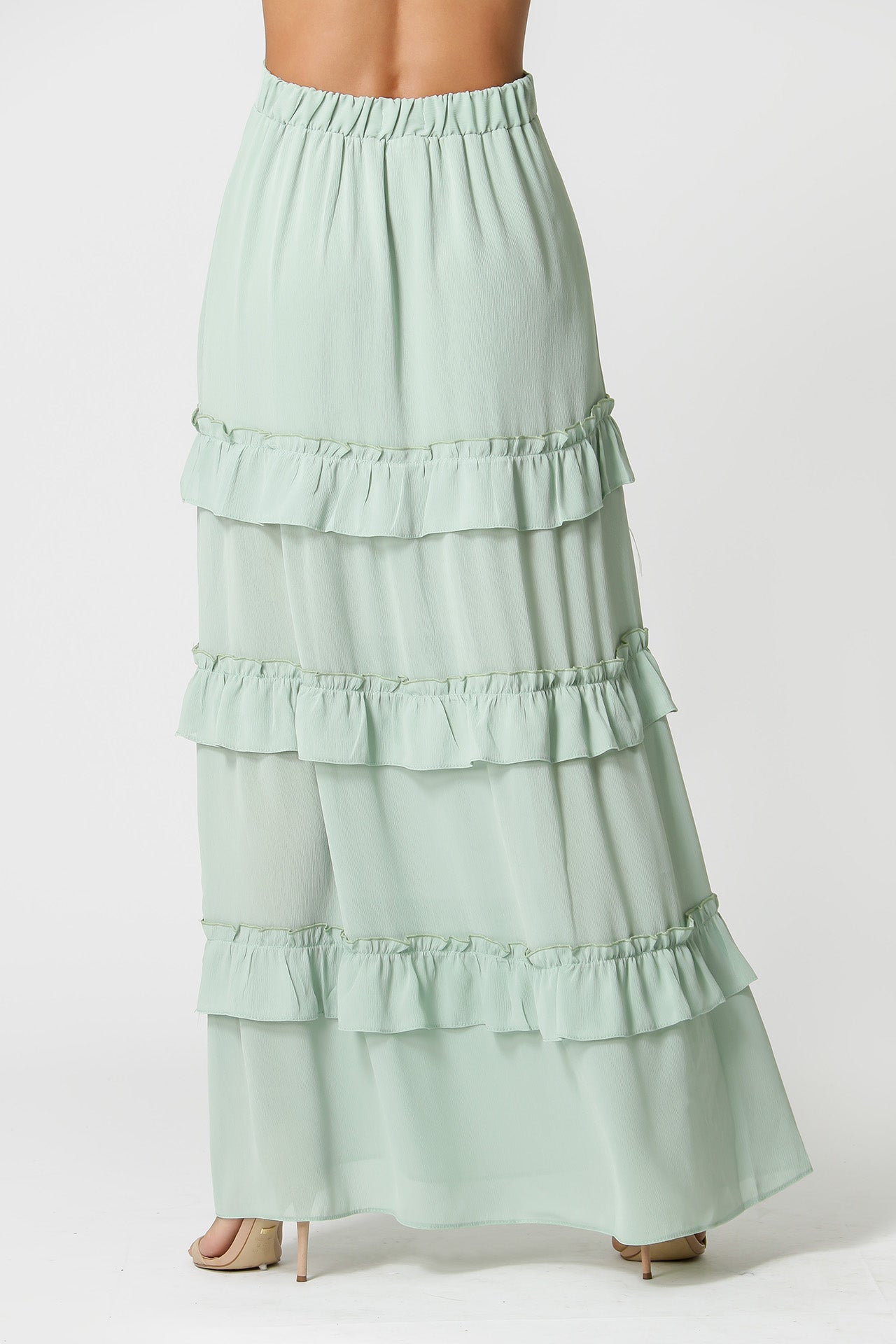 Falda larga de capas con aplicaciones de volantes, confeccionada en gasa texturizada. Tiene elástico incorporado en la parte trasera de la cintura. Ideal para un look potente y con estilo.