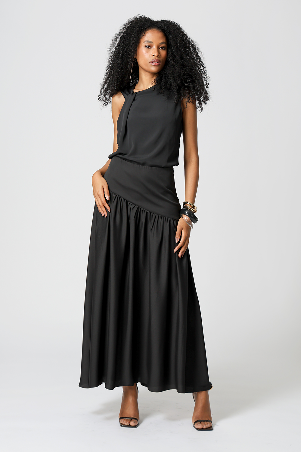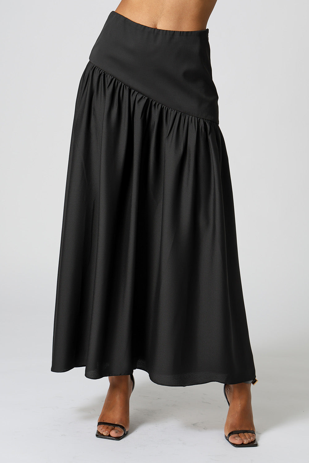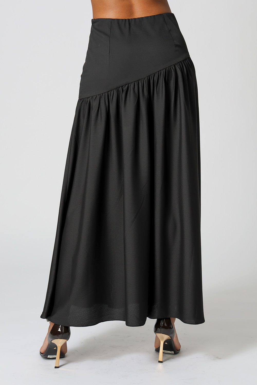 Saia franzida em crepe Segall, com pala na diagonal que valoriza a silhueta e franzidos sutis que trazem movimento e leveza ao look. Ideal para compor produções elegantes com um toque moderno.