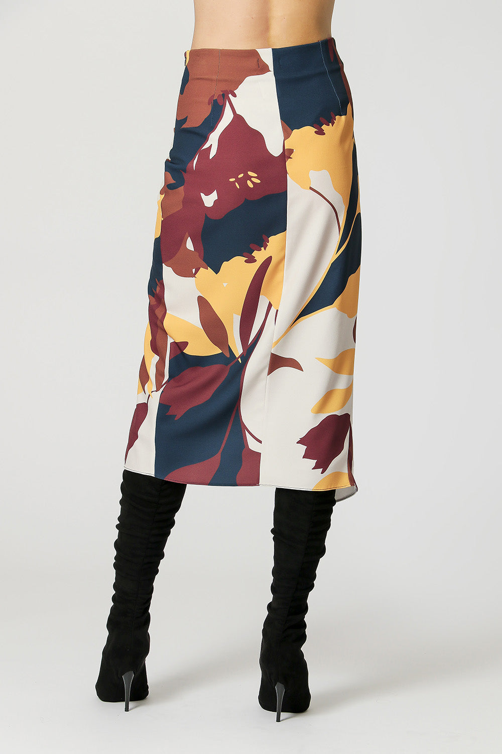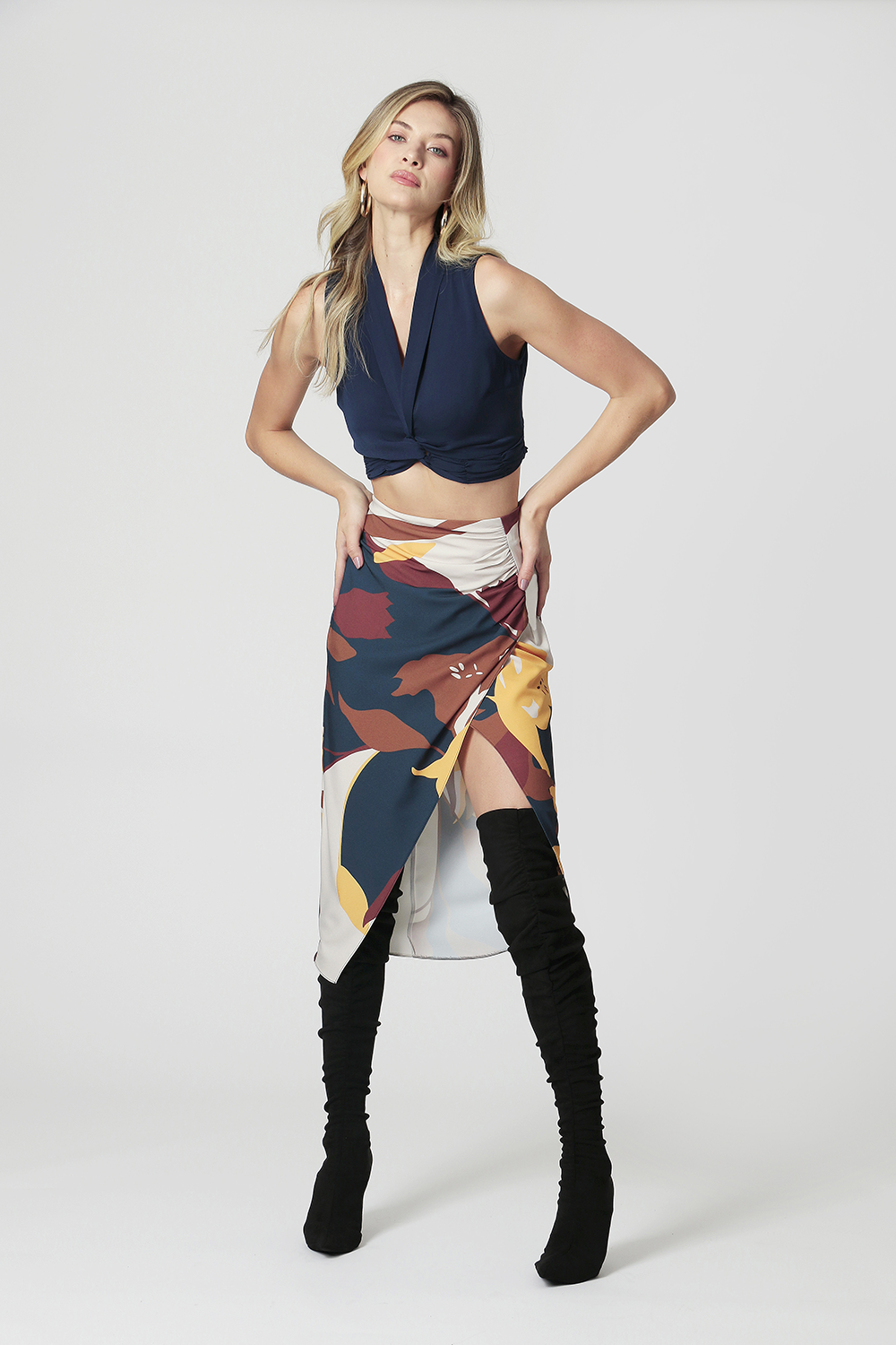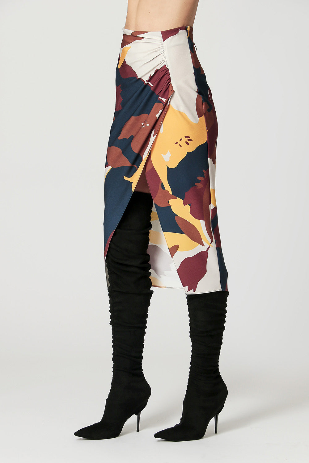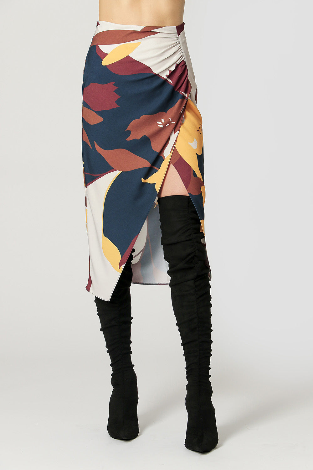 Falda estampada confeccionada en crepe sastrería, con detalle de fruncido fijo y abertura. Un modelaje que viene fuerte esta temporada.