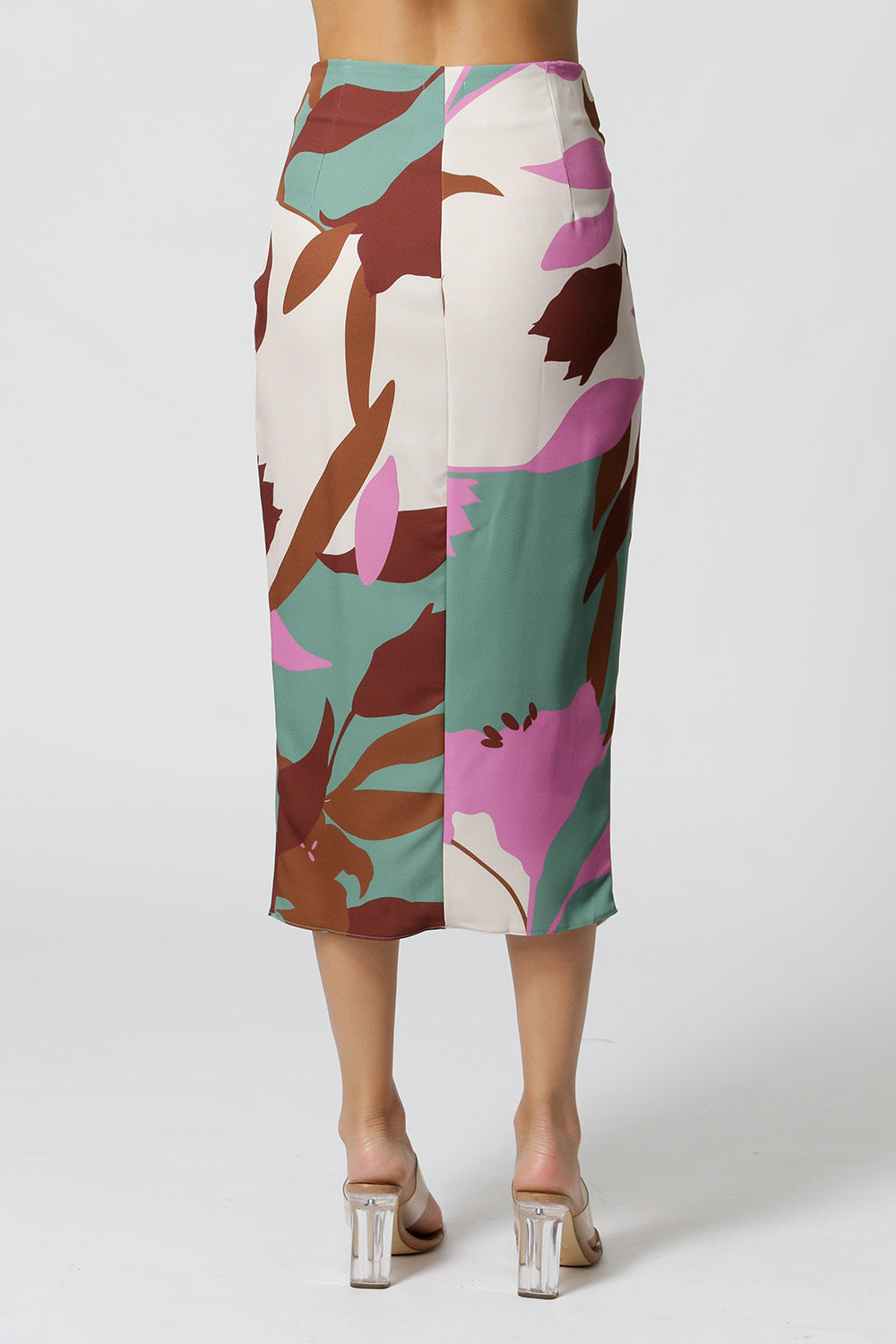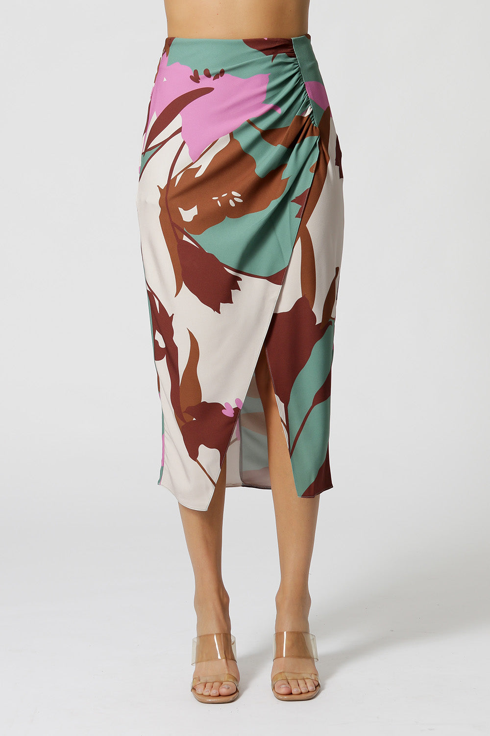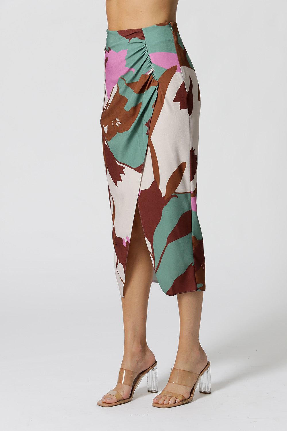 Falda estampada confeccionada en crepe sastrería, con detalle de fruncido fijo y abertura. Un modelaje que viene fuerte esta temporada.